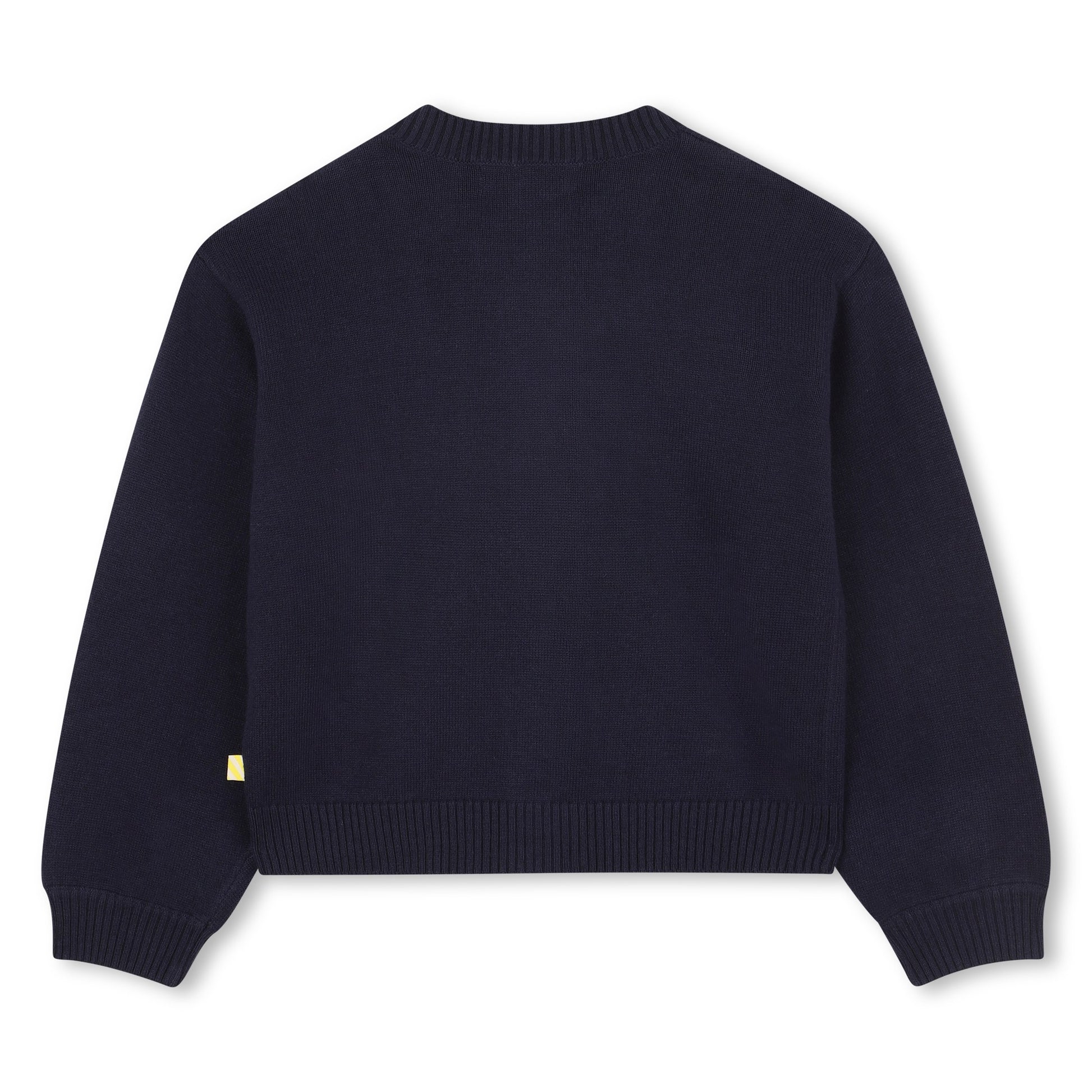 Diese Strickjacke von Billieblush kombiniert zeitloses Dunkelblau mit einem farbenfrohen Schriftzug aus schimmernden Pailletten. Der vertikal verlaufende „BILLIEBLUSH“-Schriftzug vorn sorgt für einen überraschenden Effekt und verleiht der Jacke das gewisse Etwas.
