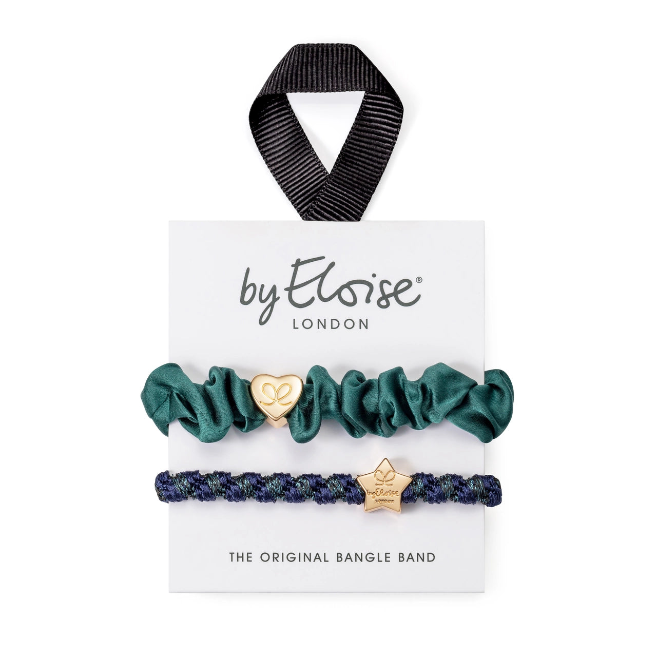 Dieses stilvolle 2er-Set von byEloise kombiniert ein edel schimmerndes Scrunchie in dunklem Grün mit einem fein geflochtenen Bangle Band in tiefem Blau – beide verziert mit goldfarbenen Anhängern in Herz- und Sternform.