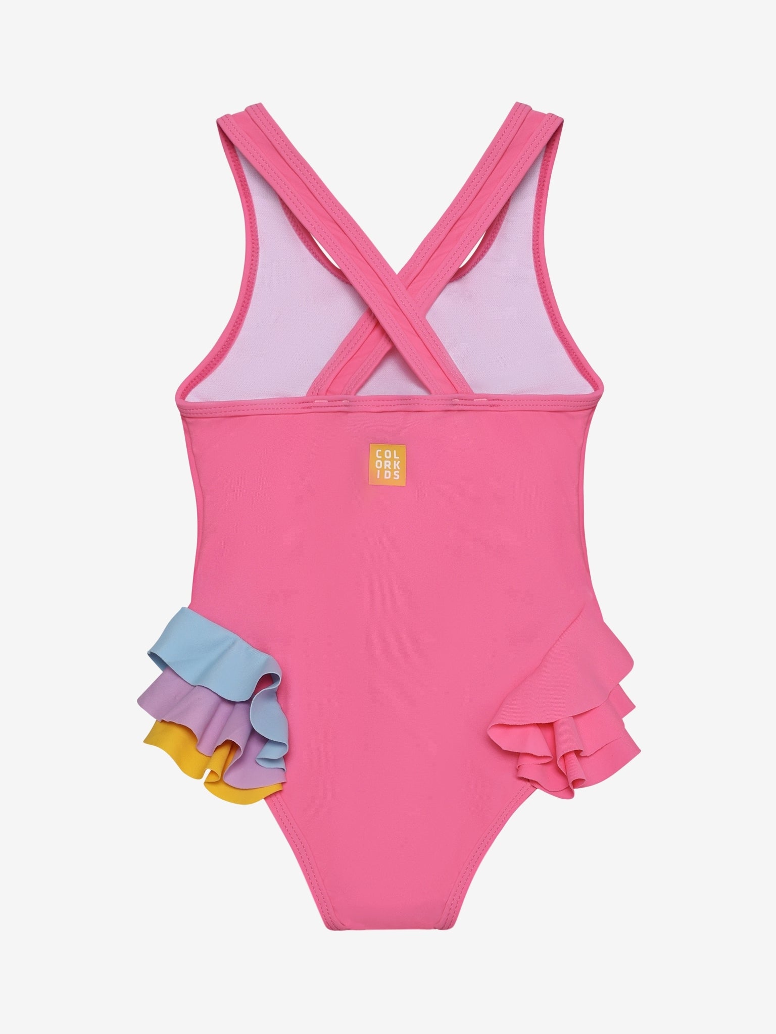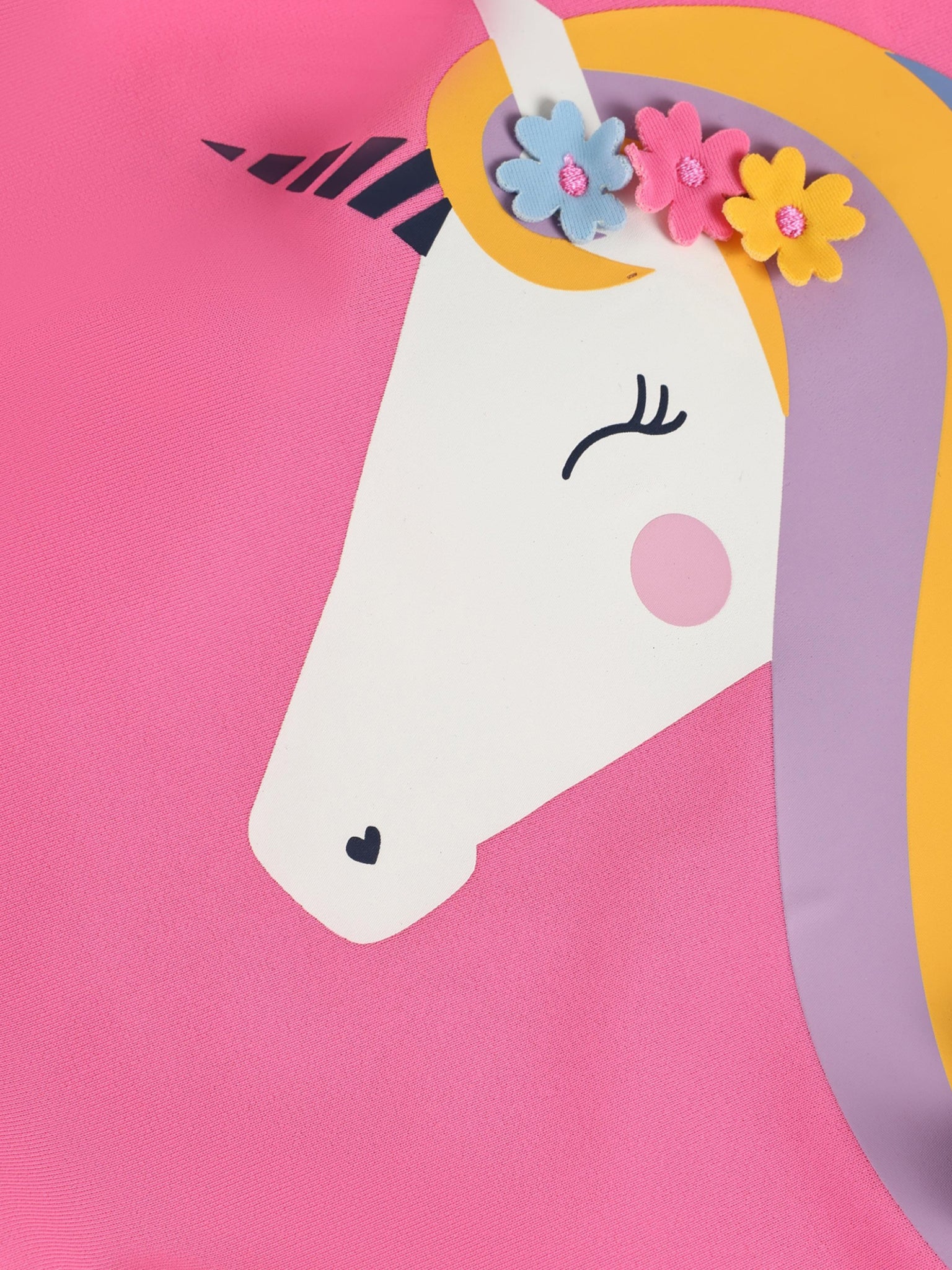 Das große Einhorn-Motiv mit bunten Details wird durch die verspielten Volants an den Seiten liebevoll ergänzt und macht den Badeanzug zu einem echten Hingucker ✨