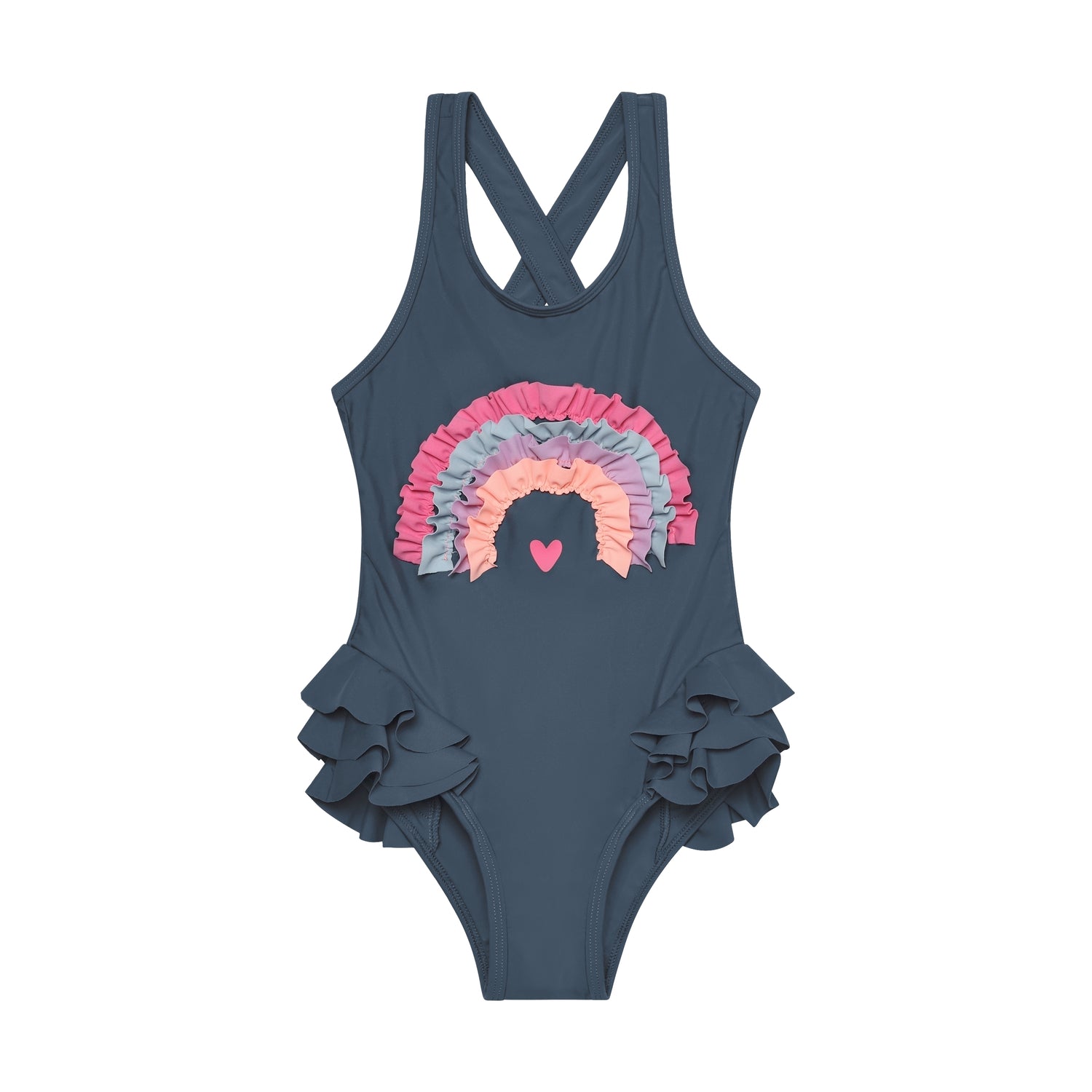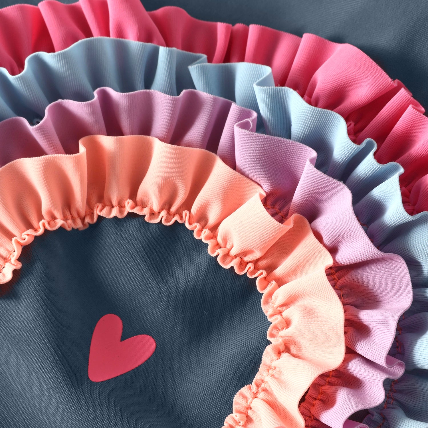Der farbenfrohe Regenbogen aus zarten Volants wird durch ein kleines Herzchen ergänzt und verleiht dem Badeanzug eine besonders verspielte, detailreiche Optik ✨ Auch die seitlichen Rüschen runden das Design wunderschön ab.