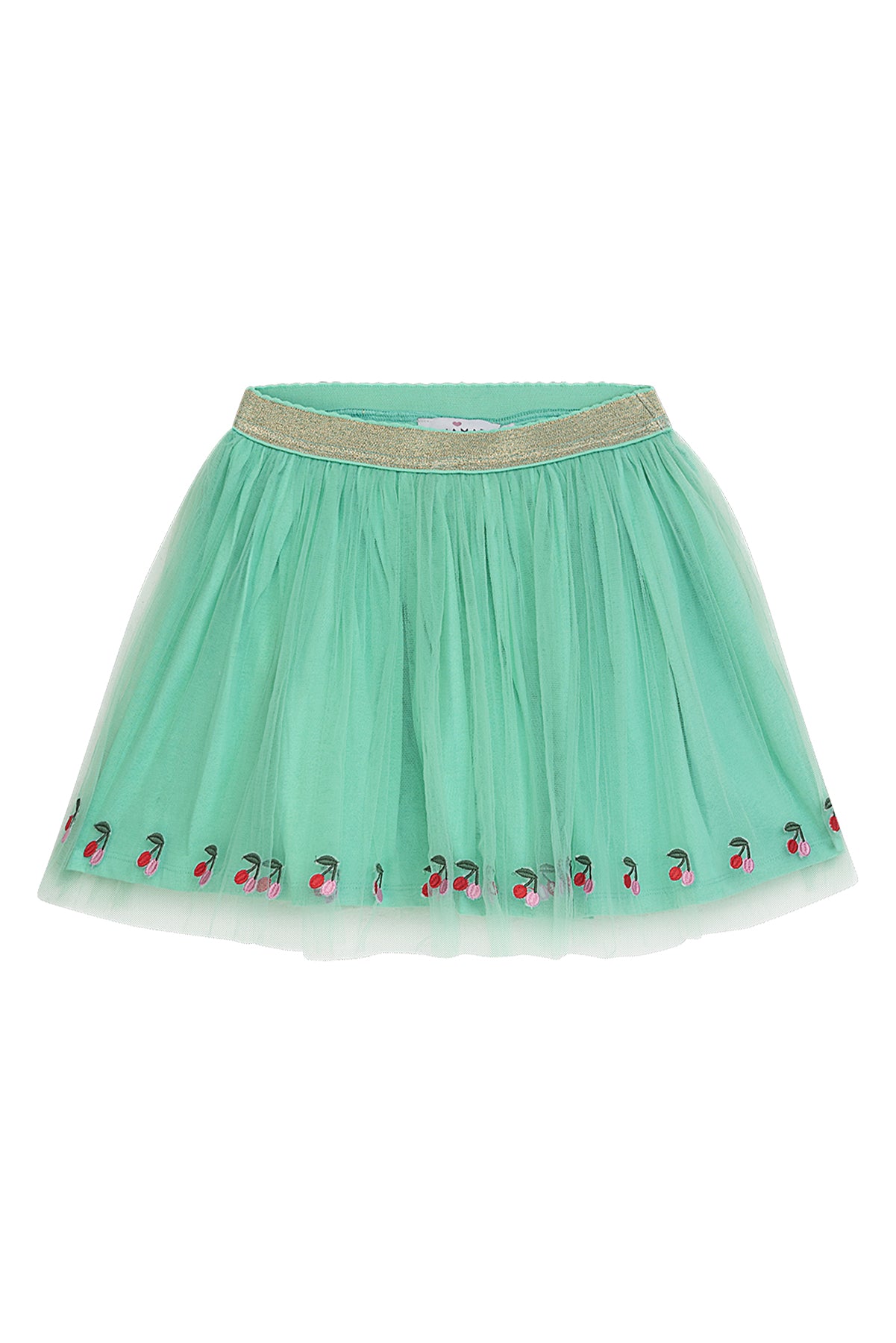 Der weich fallende, mehrlagige Tüll schwingt bei jeder Bewegung wunderschön mit. Die feine Kirschstickerei am Saum setzt einen verspielten, sommerlichen Akzent und macht den Rock zu einem echten Hingucker. Der elastische Glitzerbund sorgt dabei für einen bequemen Sitz – perfekt zum Drehen, Tanzen und Wohlfühlen.
