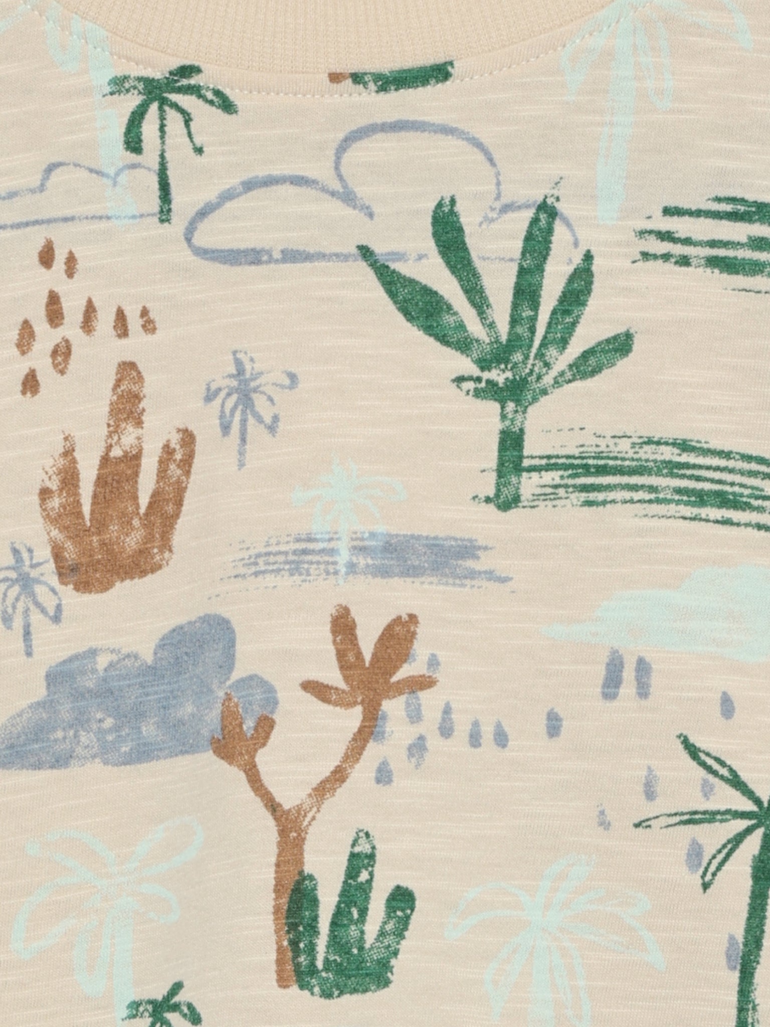 Der handgezeichnet wirkende Landschaftsprint mit Palmen, Wolken und sanften Naturtönen erzählt von warmem Wind, Abenteuern draußen und barfuß durchs Leben gehen.