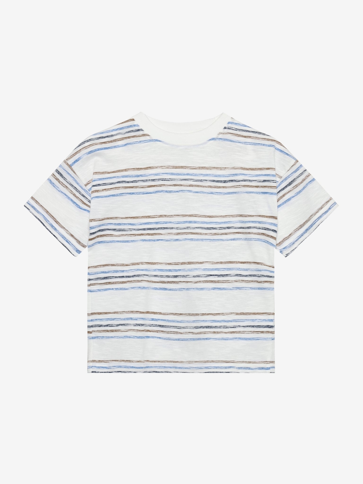 Die feinen Ringelstreifen in Blau- und warmen Beigetönen erinnern an Sand, Himmel und Meer und verleihen dem Shirt eine natürliche, unaufgeregte Ausstrahlung.