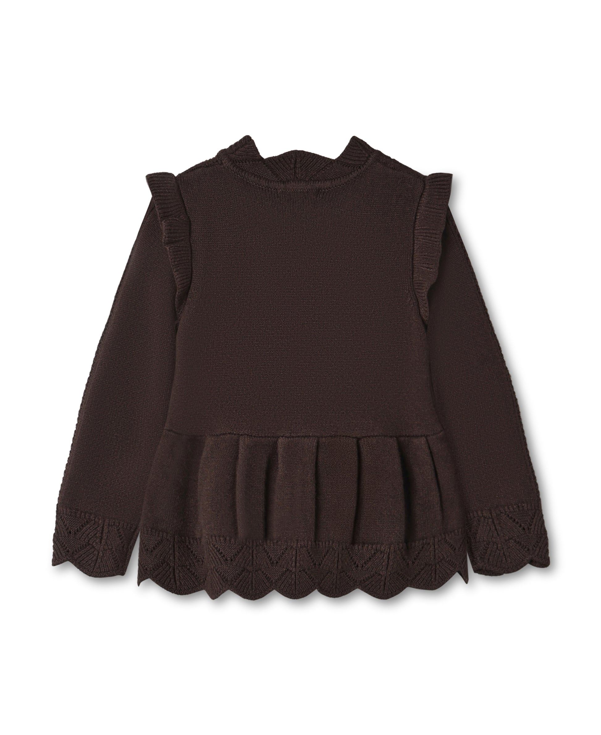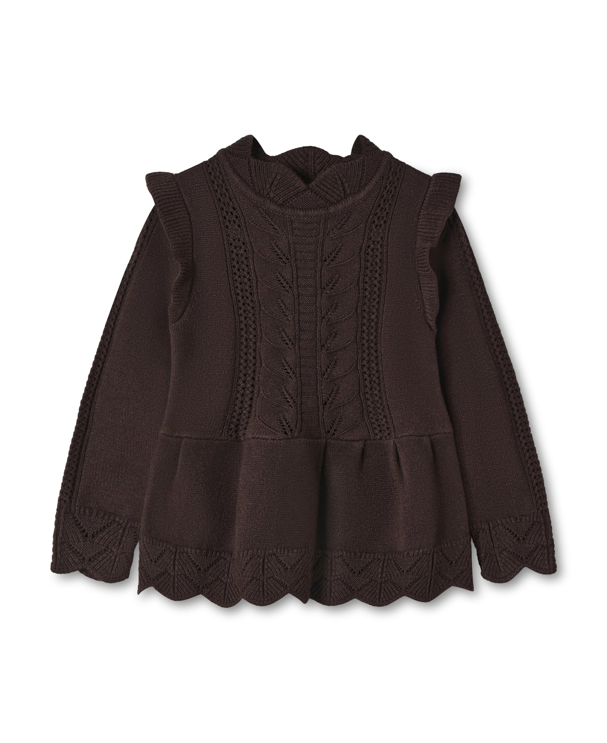 Ein echtes Lieblingsstück mit nostalgischem Charme! Das Oberteil „Alilly" von Fliink begeistert mit aufwendigem Strickmuster, zarten Volants und dem ausgestellten Peplum-Saum. Besonders hübsch: die wellenförmigen Abschlüsse und die kleinen Rüschen an den Schultern – einfach zum Verlieben!