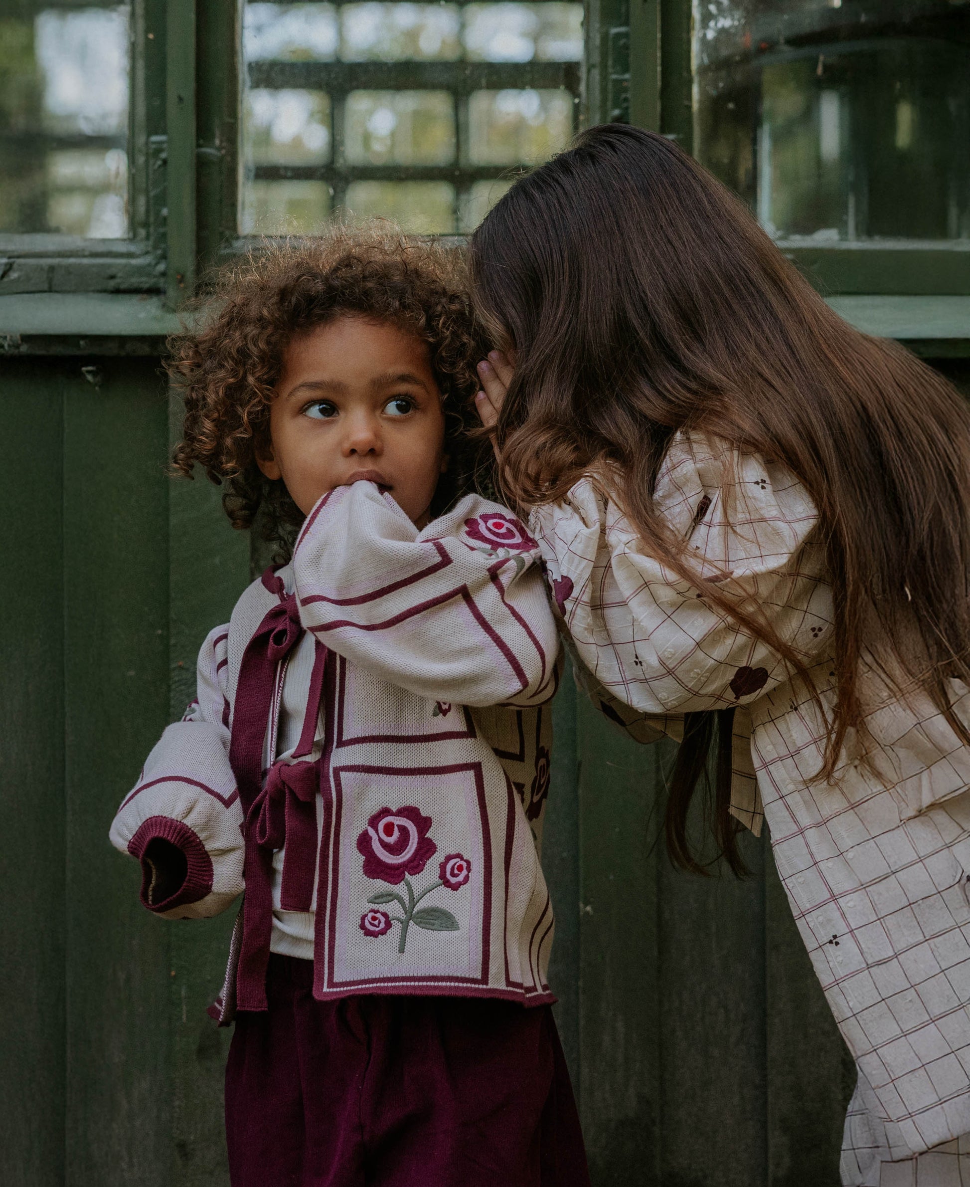 Diese zauberhafte Strickjacke ist wie ein Spaziergang durch einen Rosengarten – weich, verspielt und voller liebevoller Details. Die feinen Stickereien in warmen Beeren-Tönen verleihen dem Design einen nostalgischen Charme, während die weiche Bio-Baumwolle sich angenehm und sanft auf der Haut anfühlt.