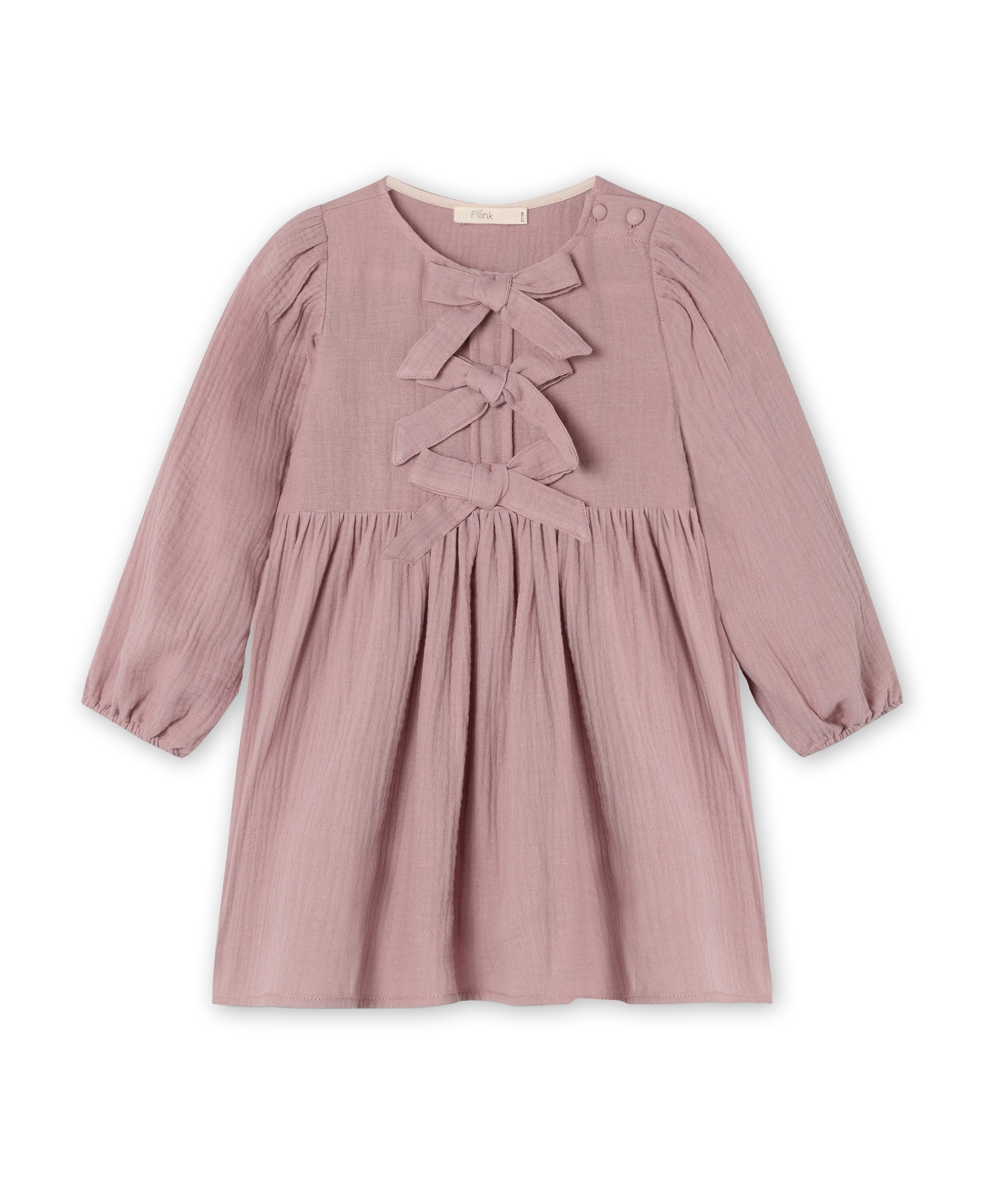 Besonders entzückend: die drei liebevoll gearbeiteten Schleifen auf der Vorderseite, die dem Kleid eine verspielte, mädchenhafte Note verleihen, ohne überladen zu wirken. Die sanft gerafften Ärmel und die feine A-Linie schenken dem Kleid eine traumhaft schöne Silhouette.