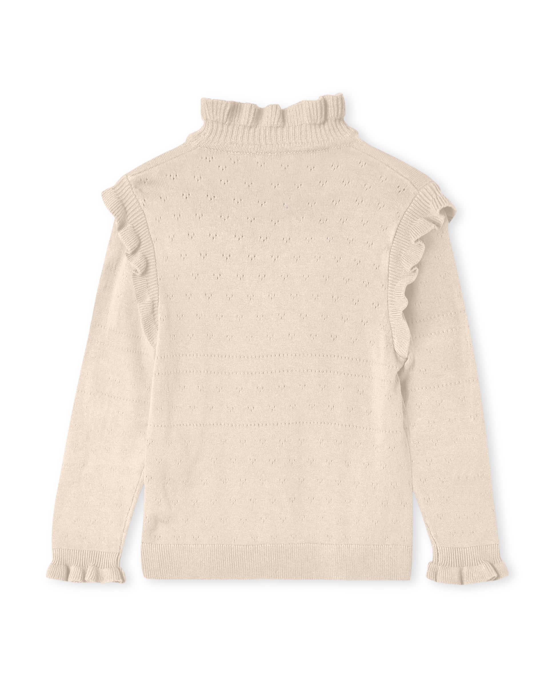 Verspielt und stilvoll zugleich: Dieser zart strukturierte Strickpullover mit Rüschen an Schulter und Ärmelsaum verleiht jedem Outfit eine besondere Note. Der fein gestrickte Stoff fühlt sich angenehm weich an, während der kleine Herzprint auf der Brust ein liebevolles Detail setzt.