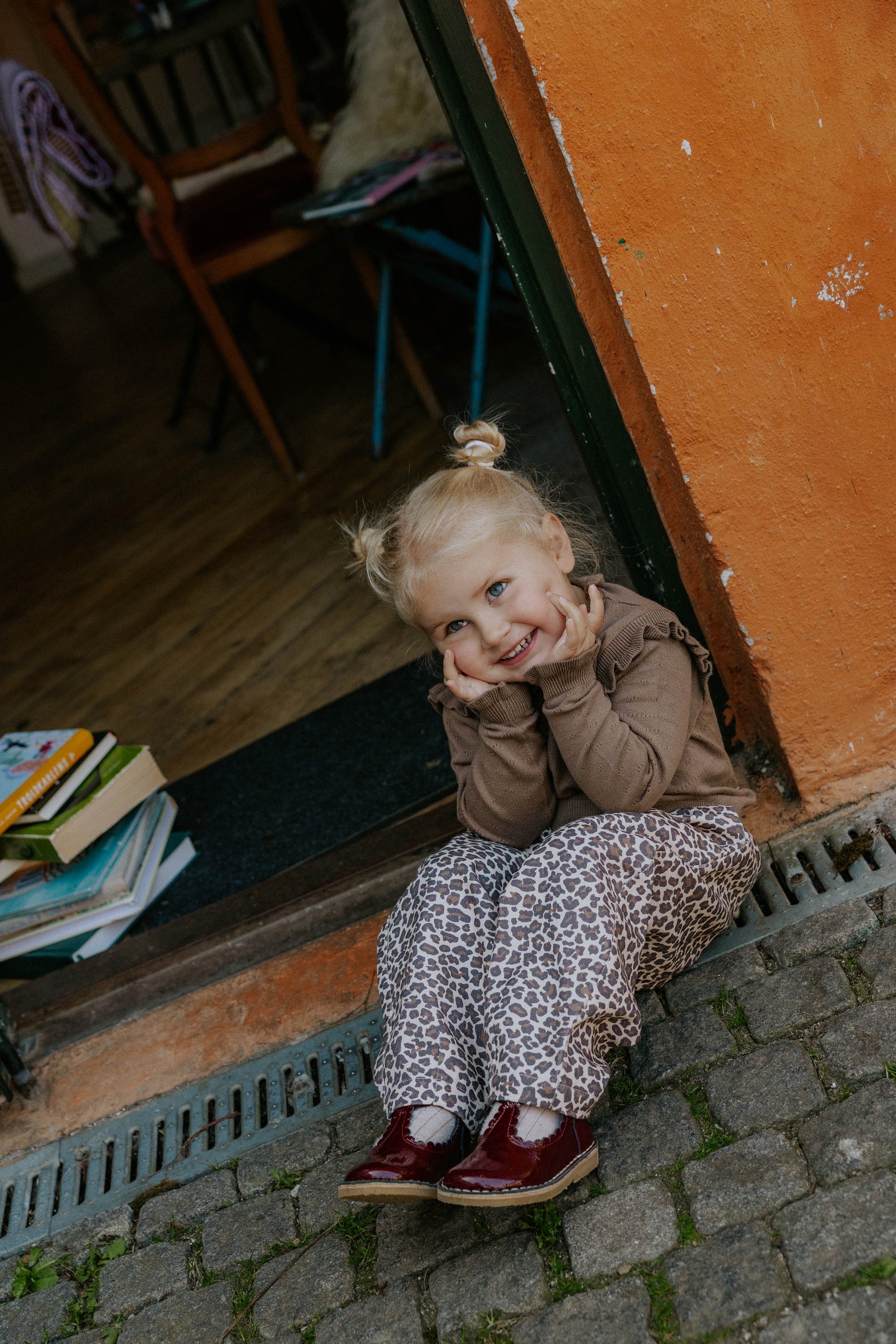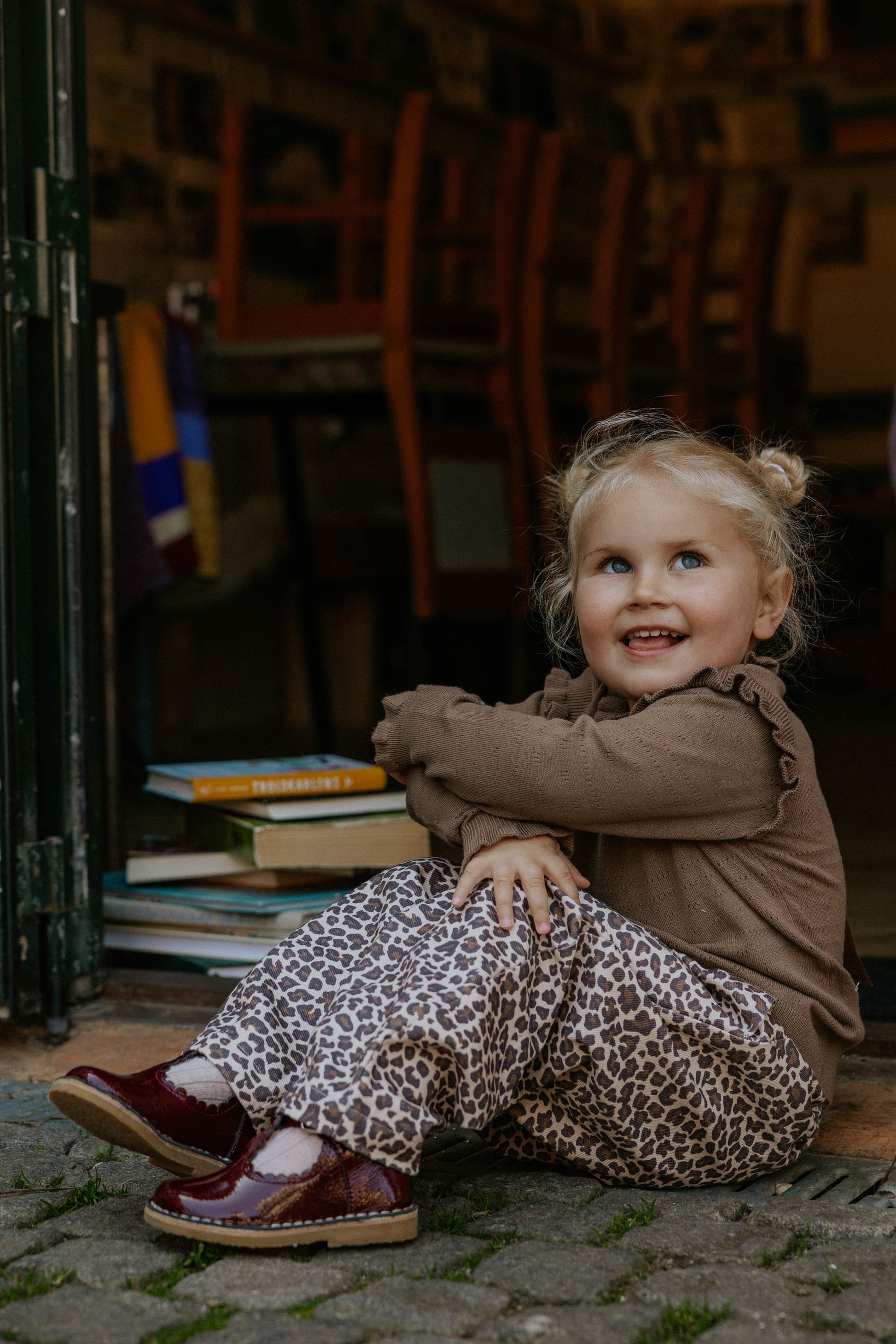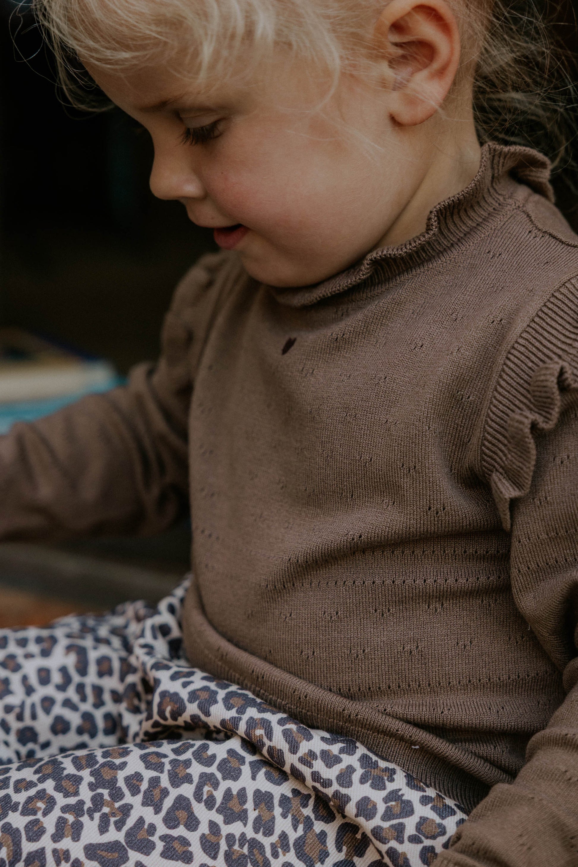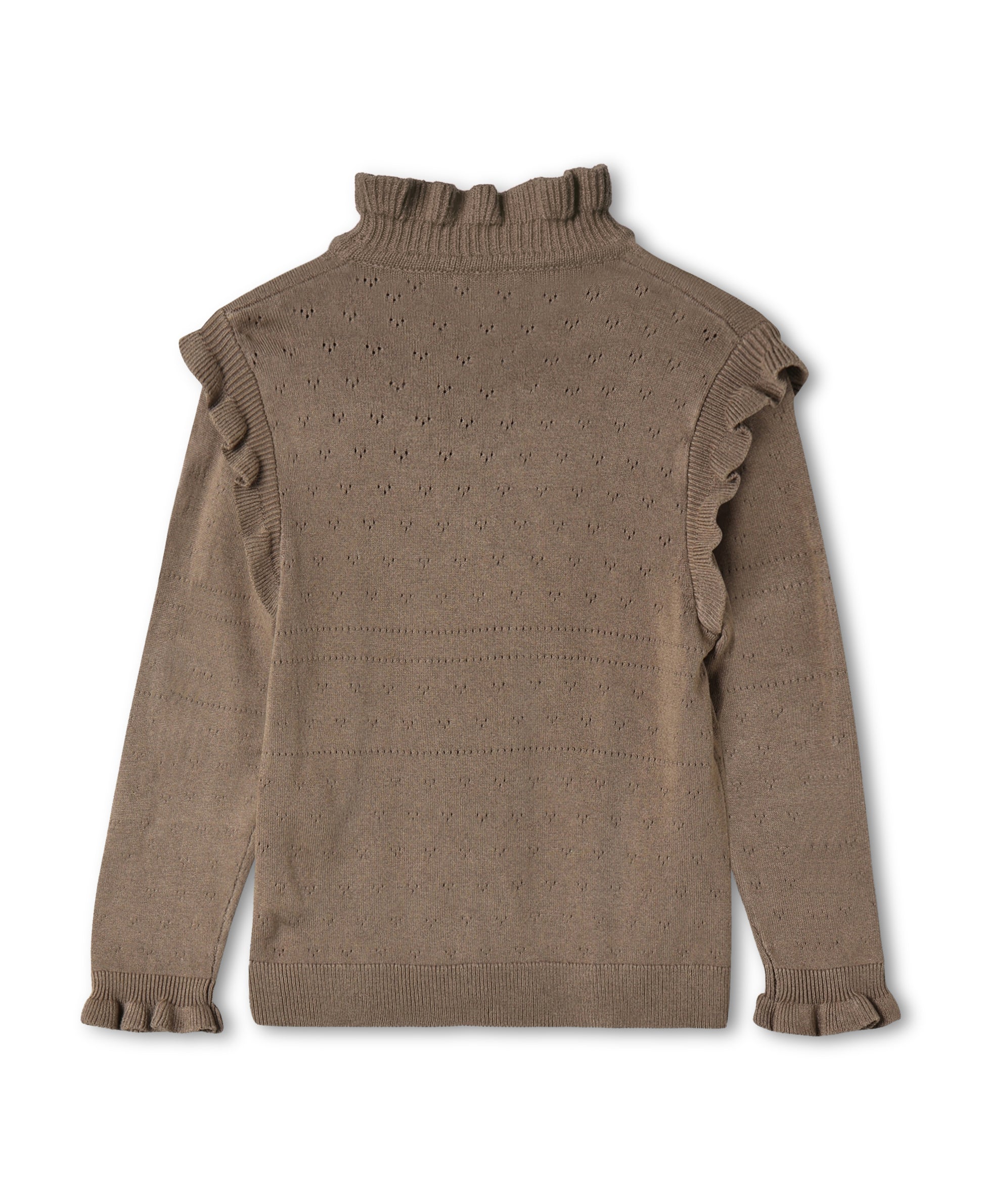 Dieses feine Strickshirt ist ein echtes Wohlfühlteil mit eleganten Details! In der herbstlich warmen Farbe pine bark bringt es dezente Raffinesse in den Kleiderschrank kleiner Modefans. Die zarten Ajourmuster, die verspielten Rüschen an den Schultern und der charmante Kragen machen es zu einem ganz besonderen Langarmshirt – perfekt zum Wohlfühlen und hübsch aussehen!