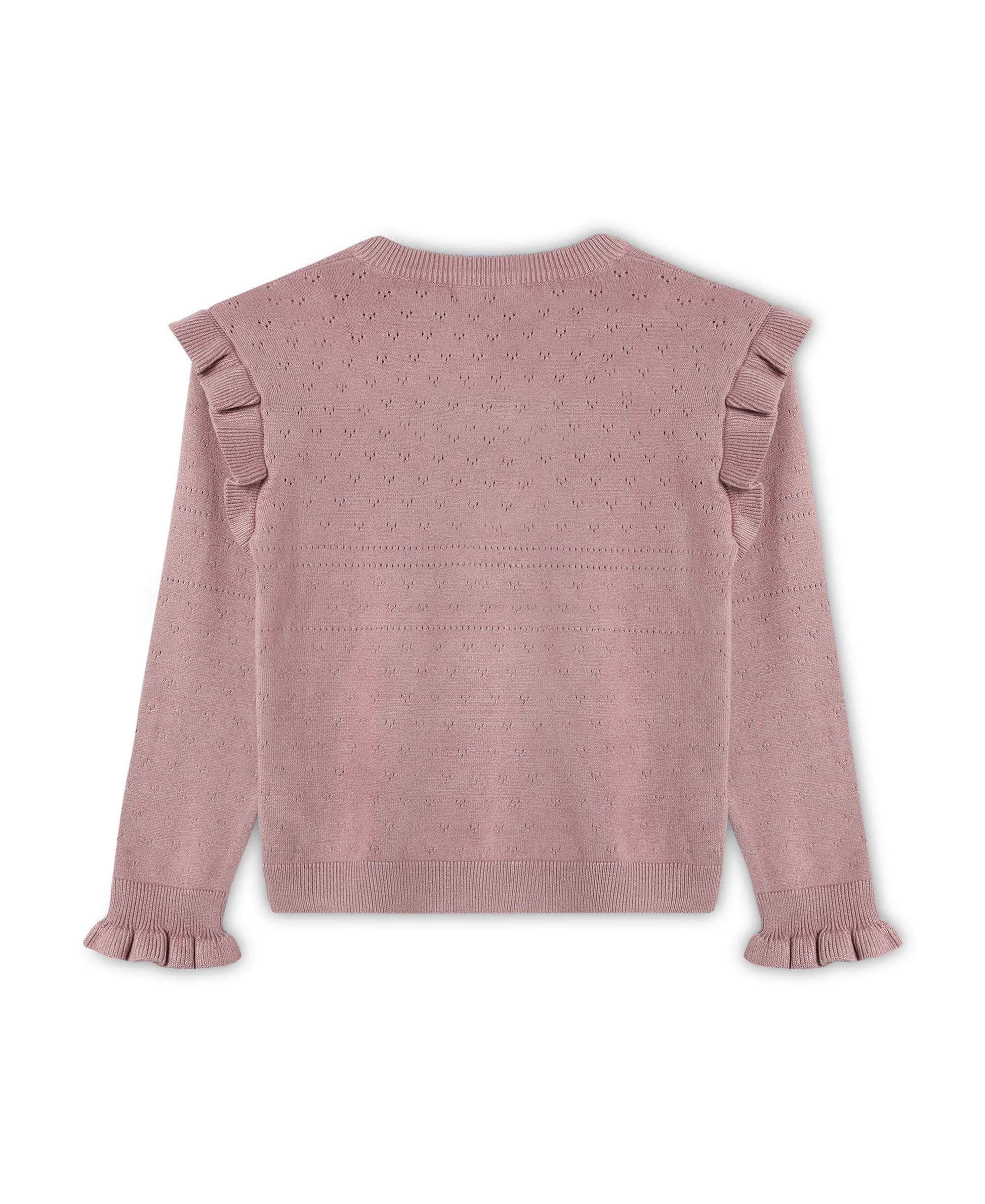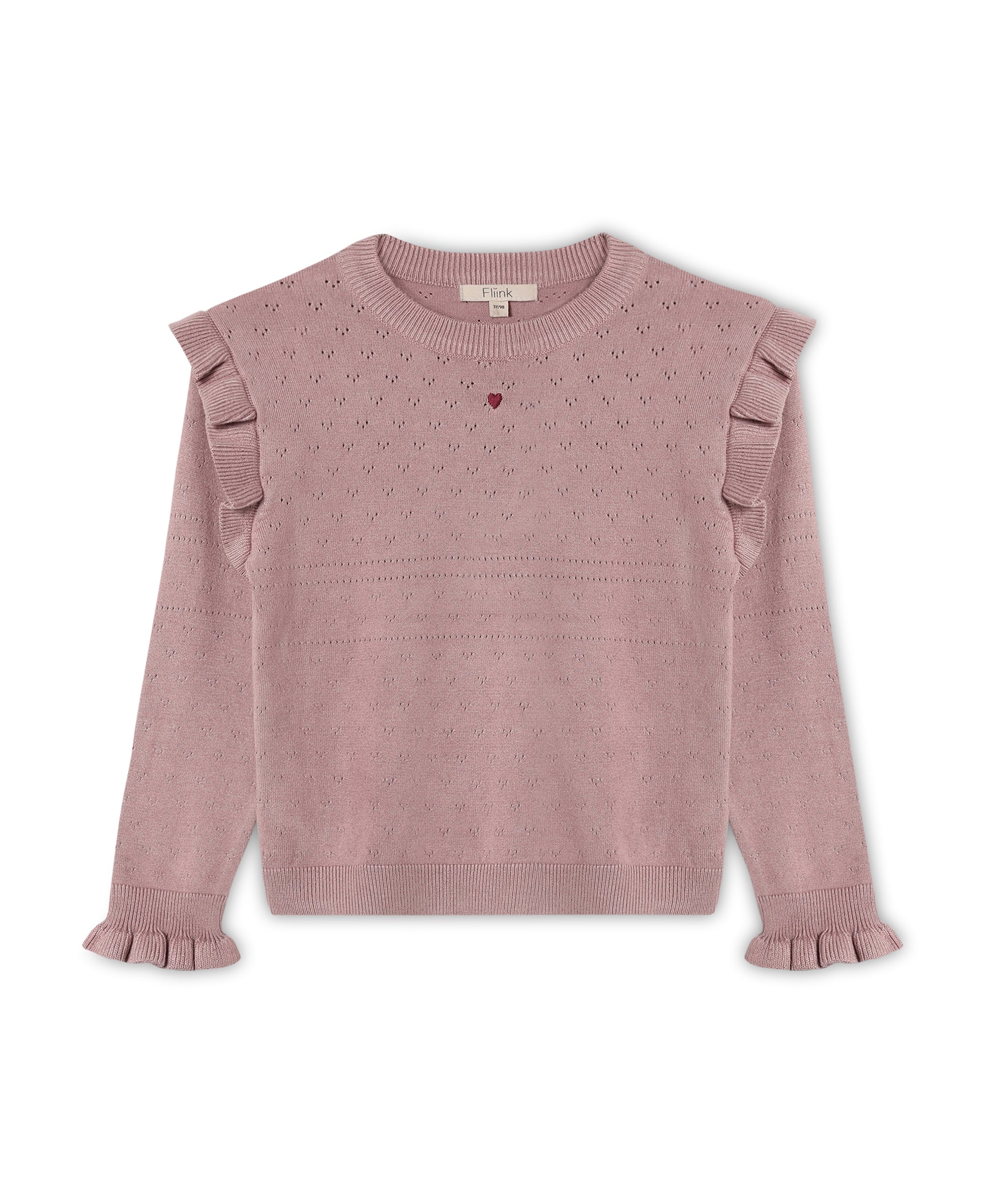 Das zarte Ajourmuster verleiht dem Pullover eine luftige Optik, während die Rüschen an den Schultern und Ärmelabschlüssen einen liebevoll verspielten Look zaubern. Ein kleines eingesticktes Herzchen auf der Vorderseite setzt einen süßen Akzent und macht das Design rundum besonders. 💗