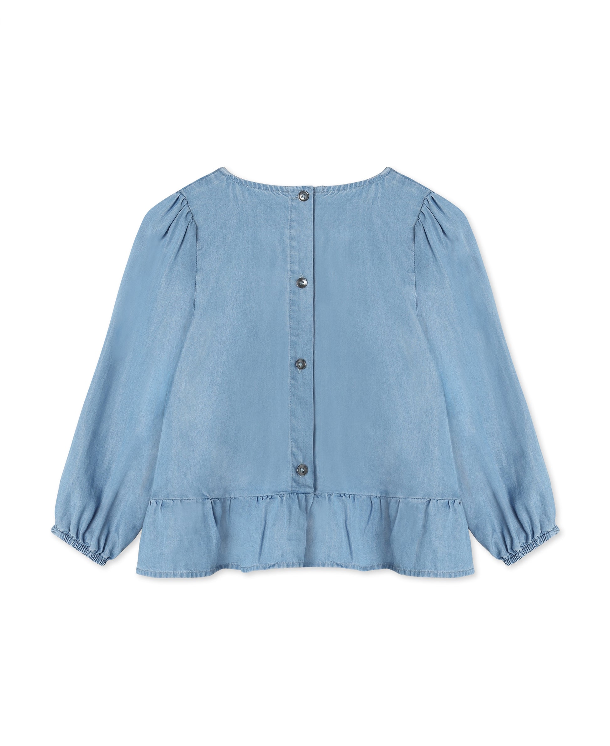 Der himmelblaue Farbton strahlt eine sanfte Ruhe aus und lässt sich wunderbar vielseitig kombinieren. Das besondere Highlight ist die große, geschwungene Rüsche, die sich verspielt über die Vorderseite legt und der Bluse einen zarten, mädchenhaften Look verleiht. ✨