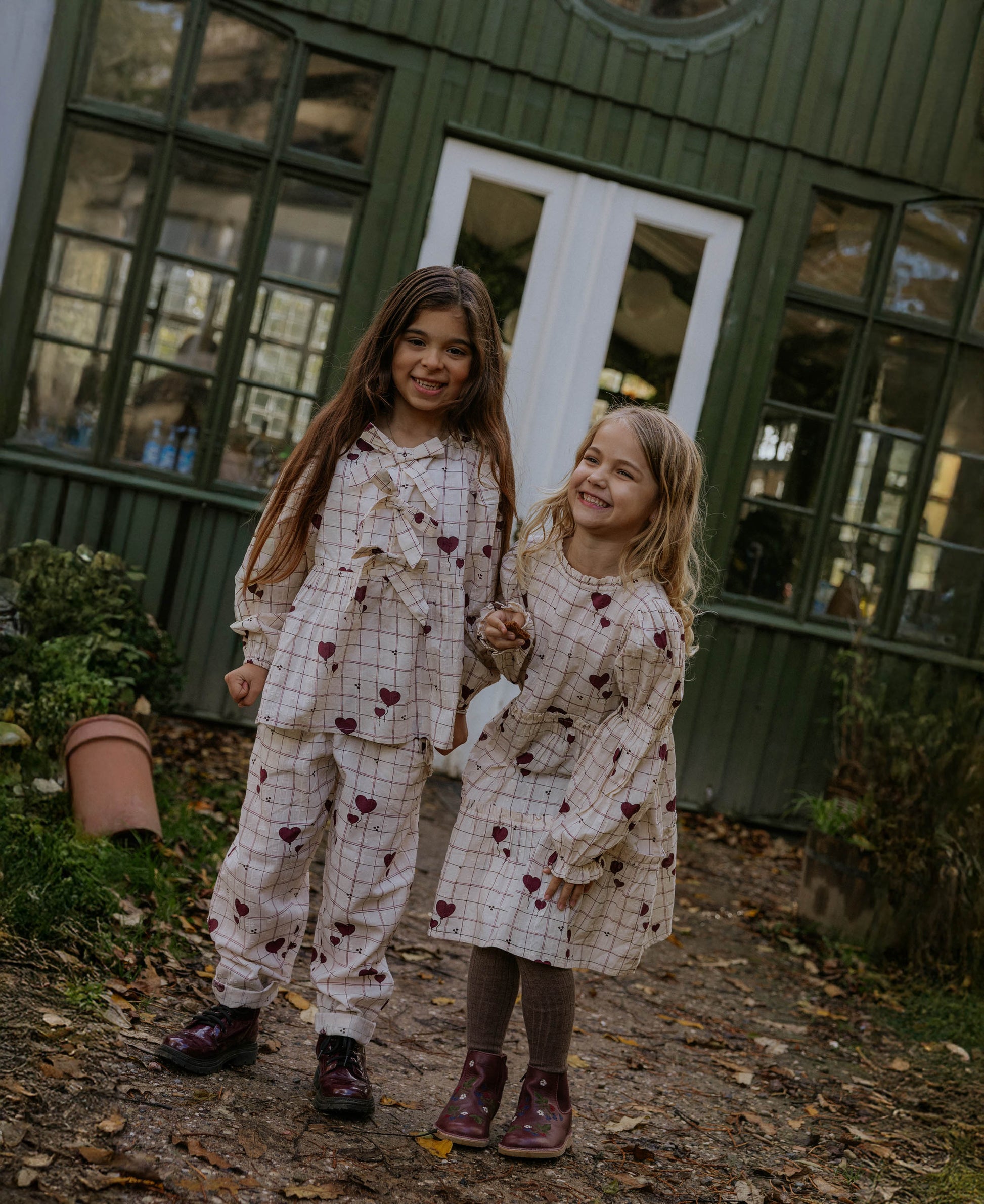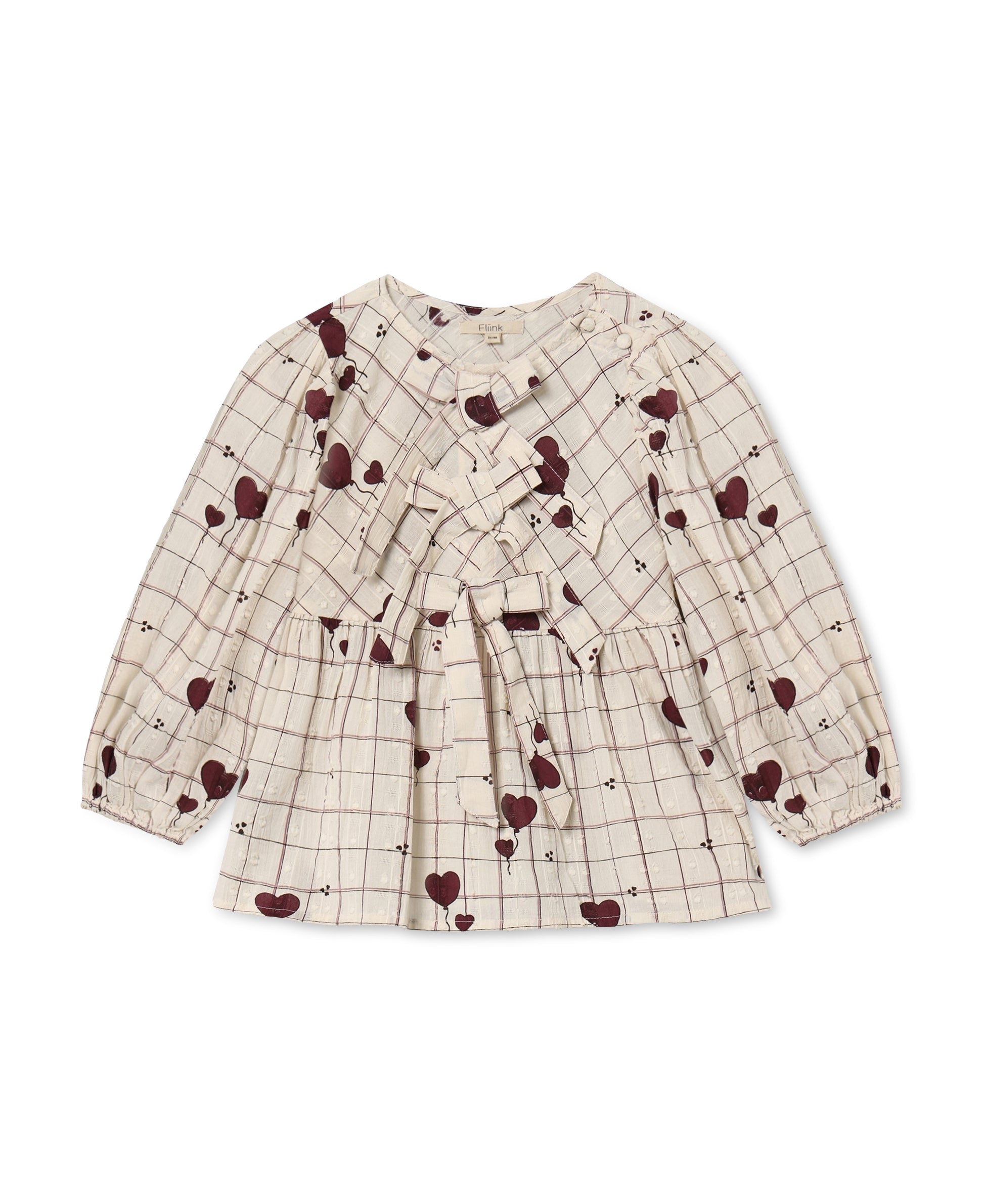 Der süße Herzchen-Print kombiniert mit dem zarten Karomuster verleiht der Bluse einen liebevoll verspielten Look. Die hübschen Schleifen auf der Vorderseite sind ein echtes Highlight und machen das Oberteil zu einem charmanten Hingucker.