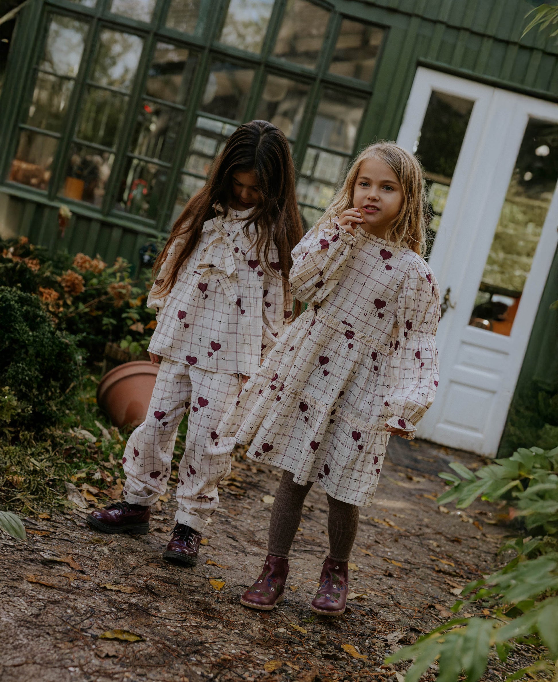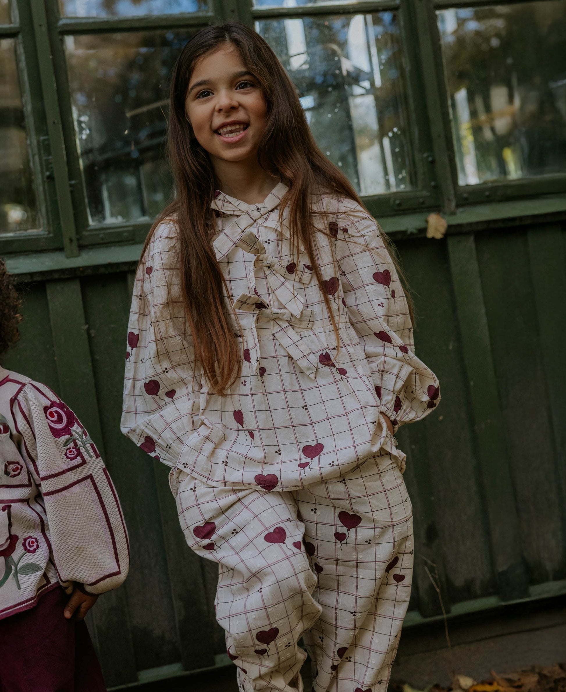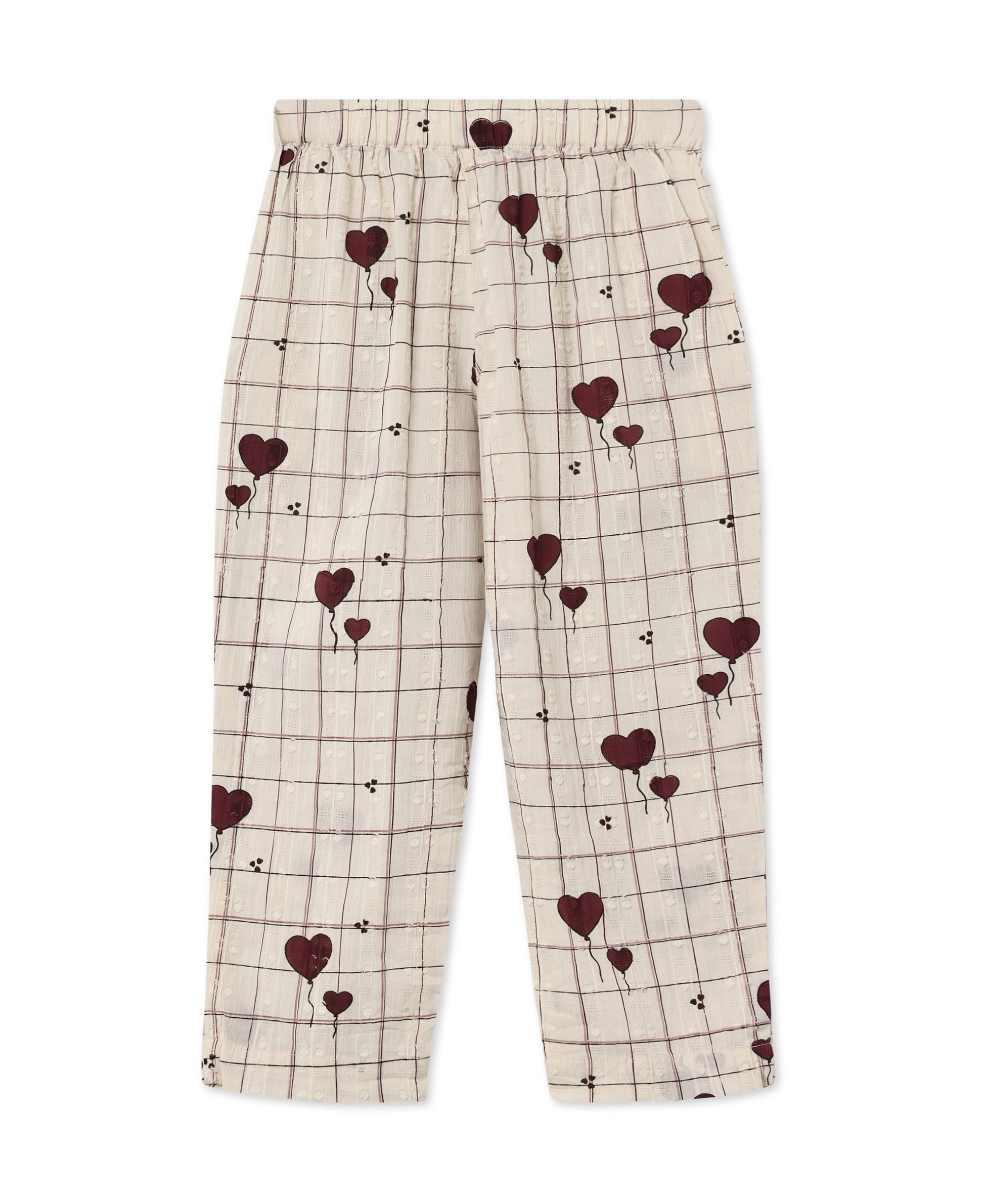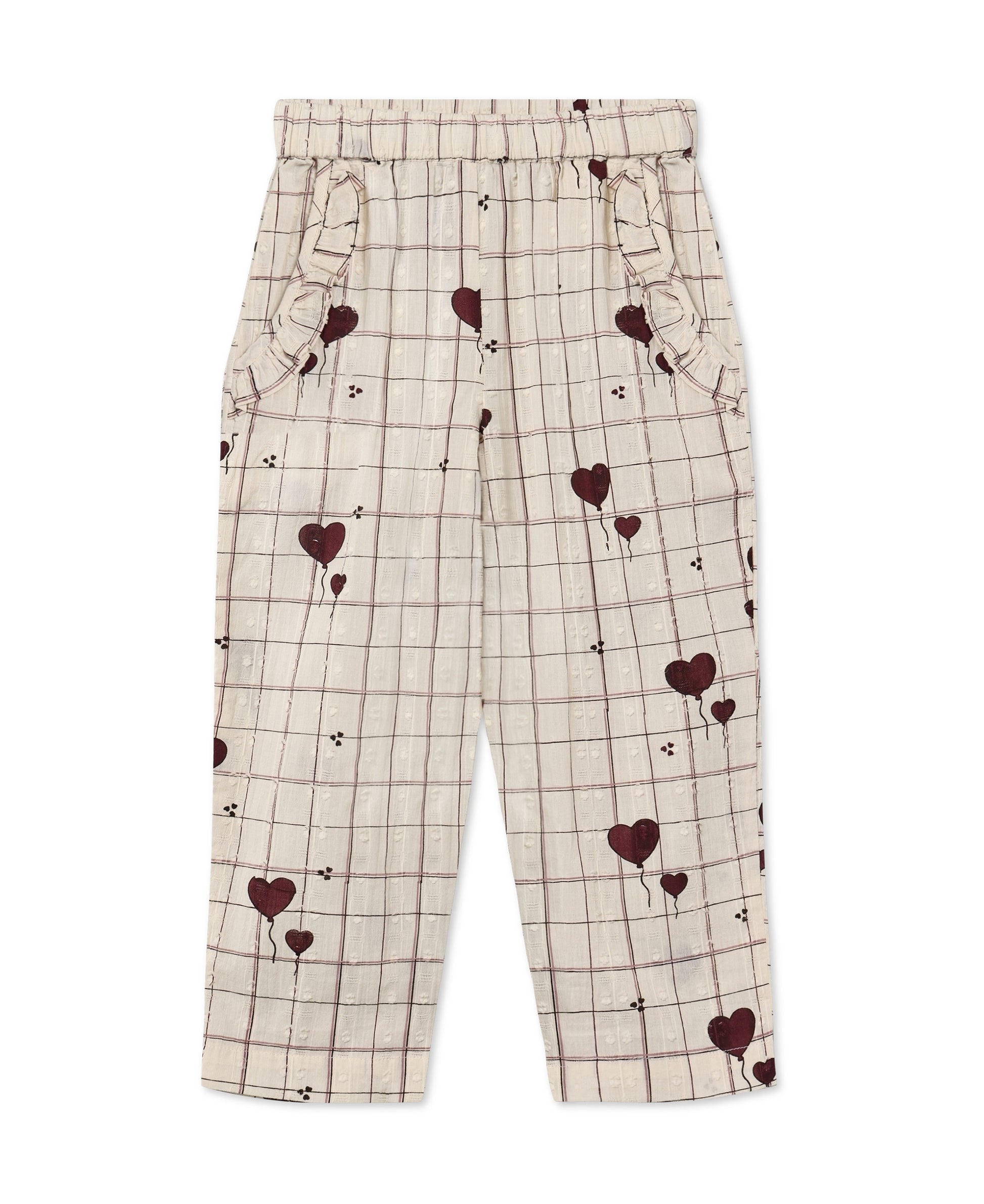 Der verspielte Herzchen-Print auf zartem Karomuster macht die Hose zu einem echten Hingucker – kindlich, fröhlich und wundervoll abgestimmt auf die passenden Oberteile und Kleider der Serie.