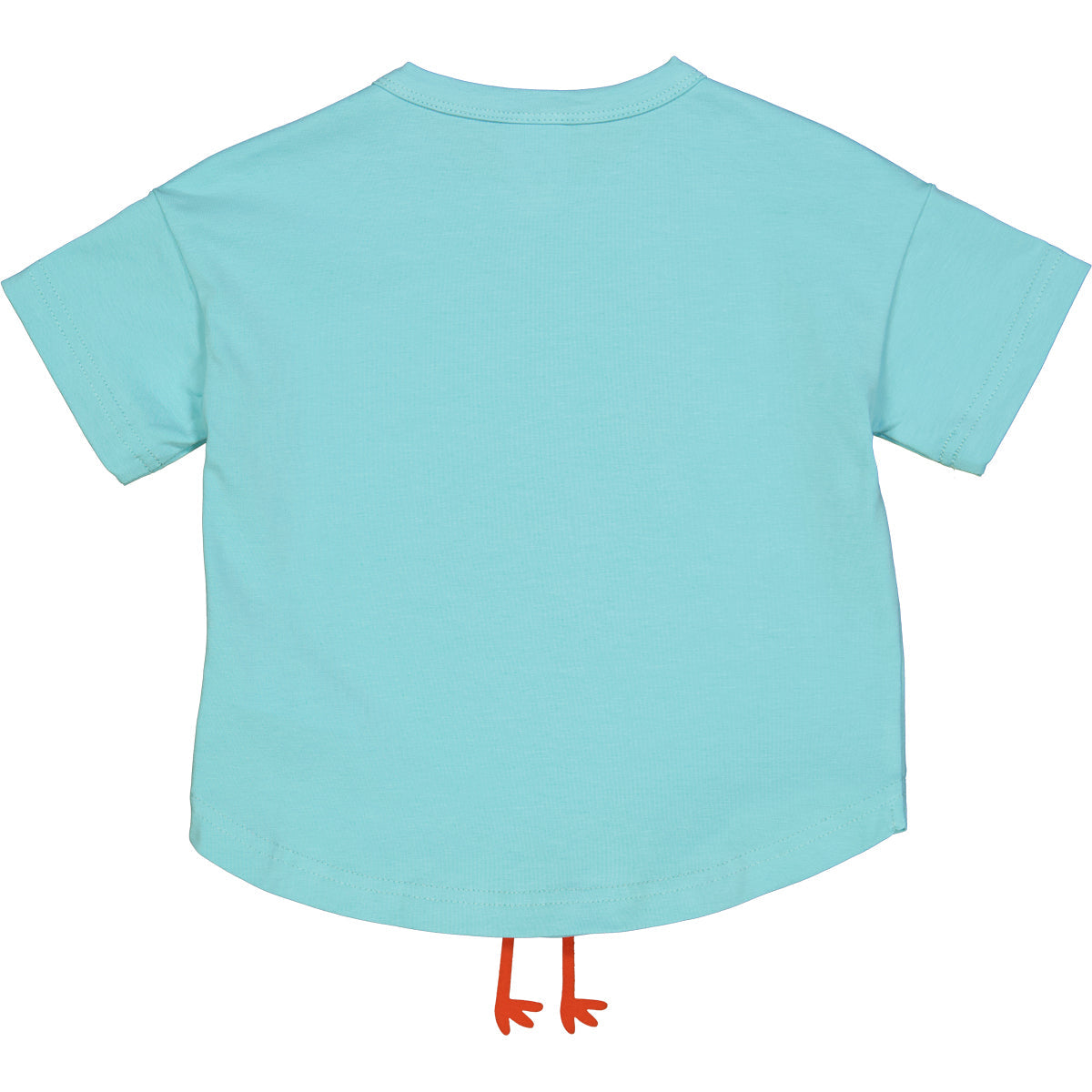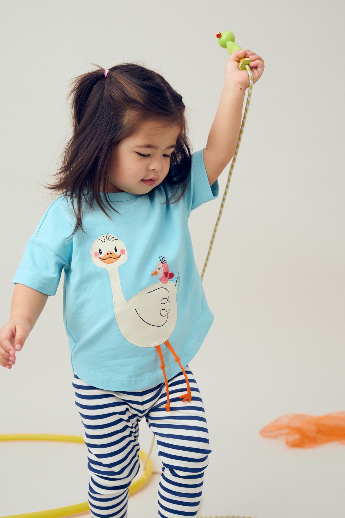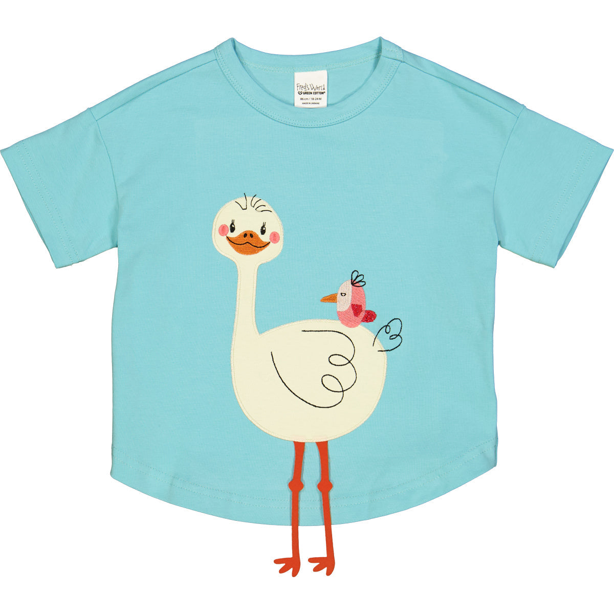 Verspieltes T-Shirt mit niedlicher Vogel-Applikation, bei der die langen Beine frech über den Saum hinausreichen. Der lockere, leicht oversized Schnitt sorgt für angenehmen Tragekomfort und macht das Shirt perfekt für entspannte Sommertage. Ideal kombinierbar mit Leggings oder Shorts.