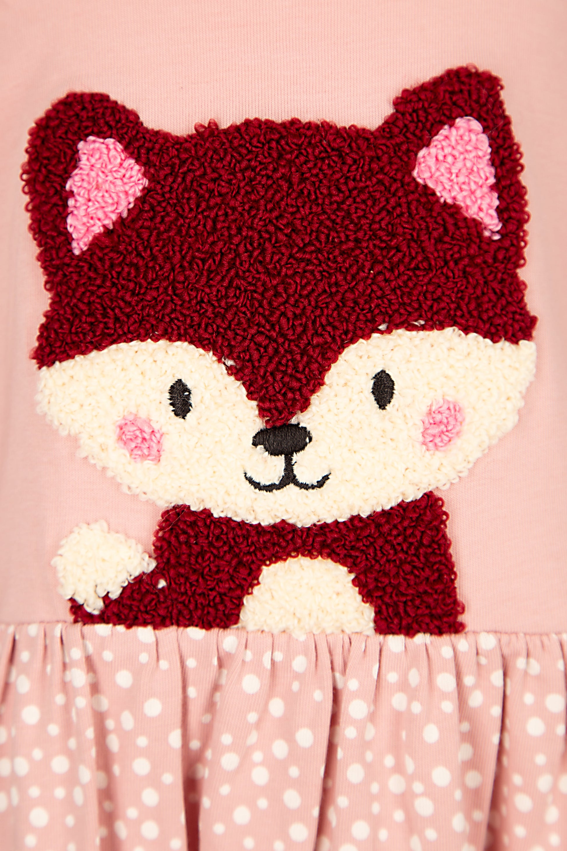 Dieses bezaubernde Kleid bringt Kinderaugen zum Leuchten. Der niedliche Fuchs auf der Vorderseite ist weich und detailverliebt gearbeitet – fast so, als würde er gleich mit einem fröhlichen Lächeln losflitzen. Der gepunktete Rockteil schwingt bei jeder Bewegung mit und sorgt für ein rundum verspieltes Tragegefühl.