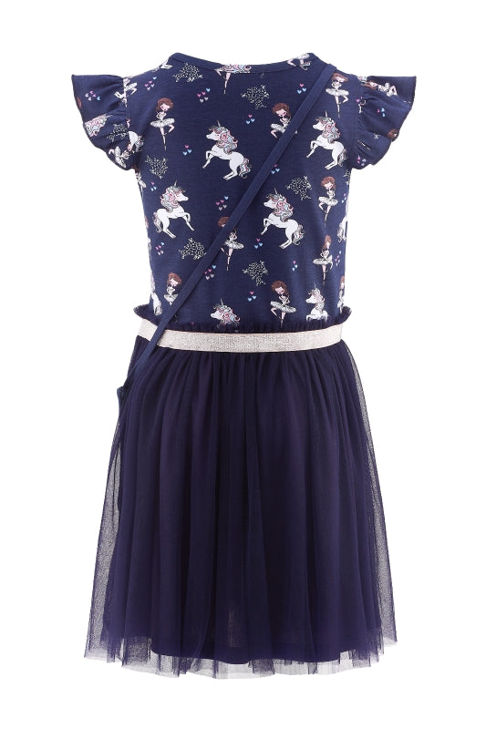 Für kleine Einhorn-Fans, die es glänzend lieben: Das Happy Girls Kleid kombiniert ein zauberhaftes Einhorn-Motiv auf dem Oberteil mit einem eleganten navy Tüllrock, der für eine wunderschöne, schwingende Silhouette sorgt. Der Glitzerbund setzt einen funkelnden Akzent und lässt das Kleid besonders strahlen.