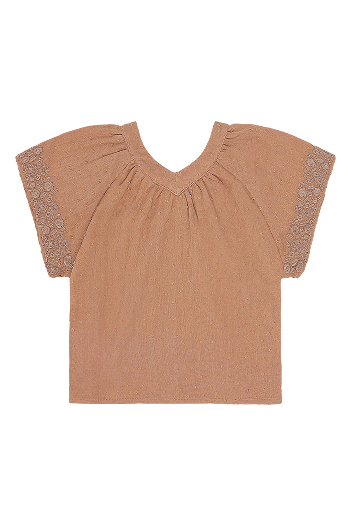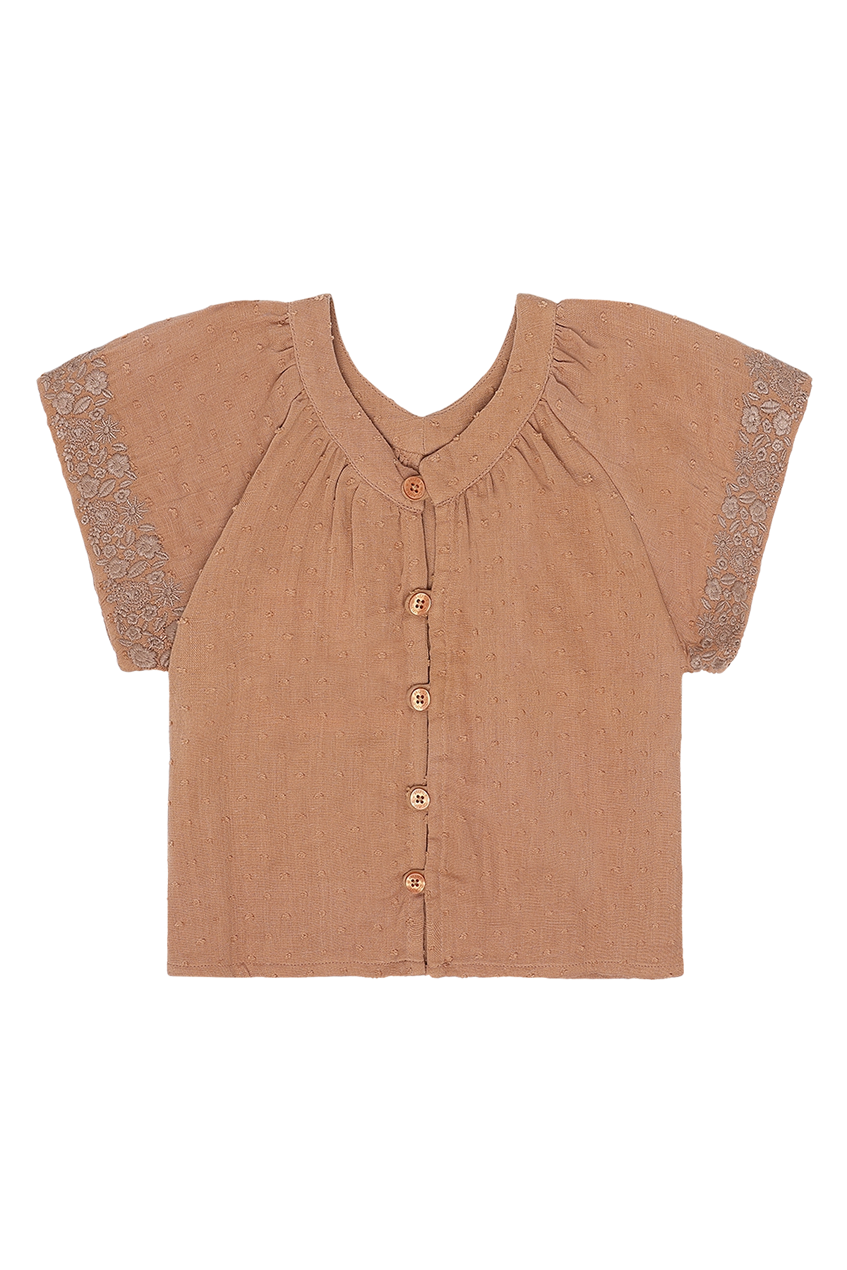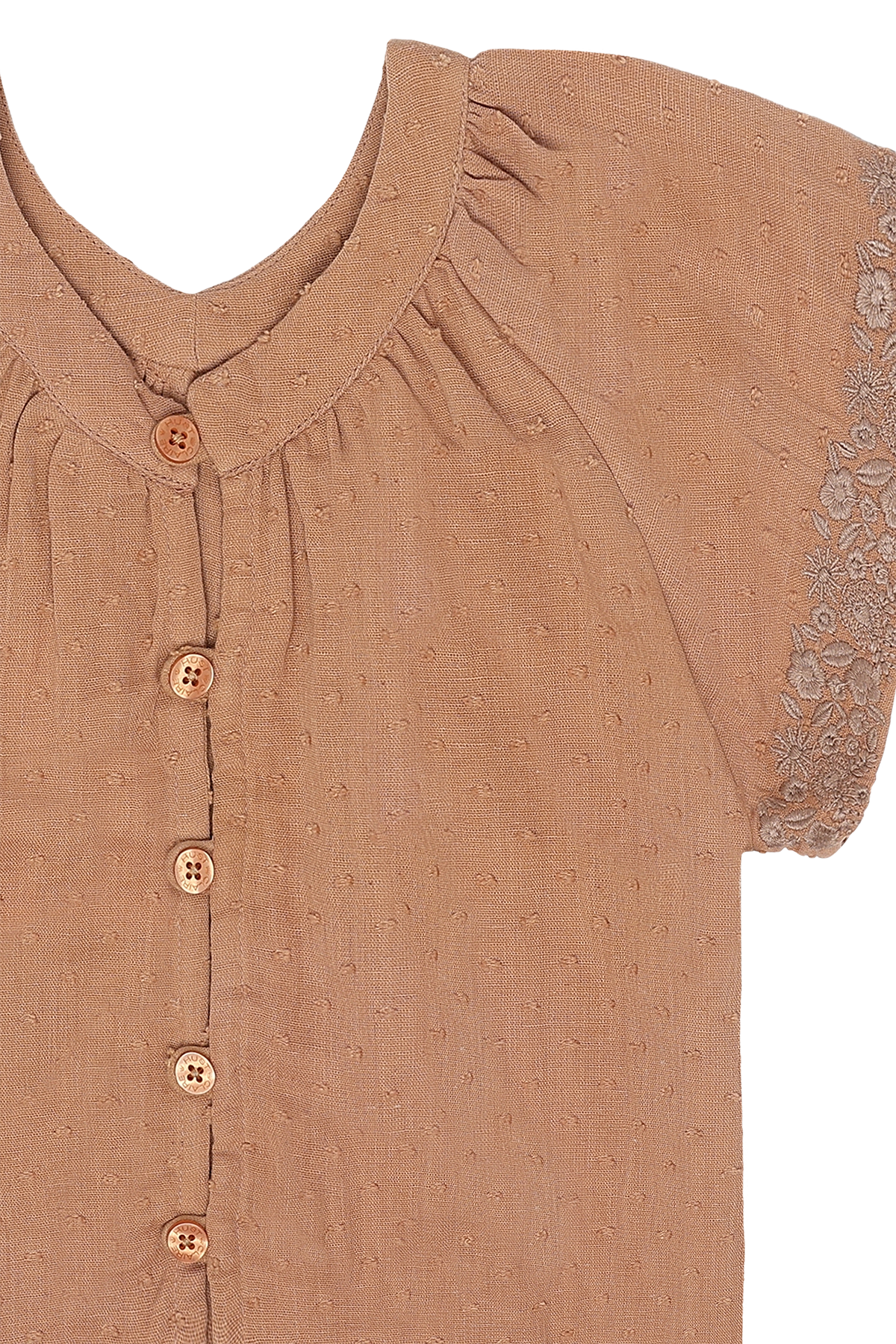 Hemd aus gewebter Baumwolle mit einem V-Ausschnitt. Das Modell ist mit Rüschendetails am Hals und mit einem Knopfverschluss am Rücken versehen. Dieses Produkt ist aus 100 % Bio-Baumwolle hergestellt.