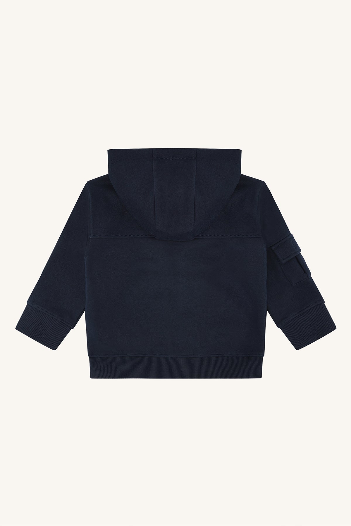 Die dunkelblaue Sweatjacke ist ein vielseitiges Basic für jeden Tag. Mit ihrer gemütlichen Kapuze, dem durchgehenden Reißverschluss und den großen Kängurutaschen ist sie sowohl praktisch als auch bequem.