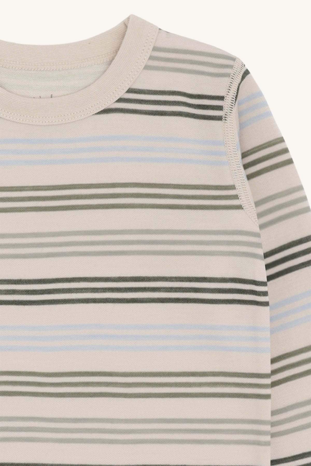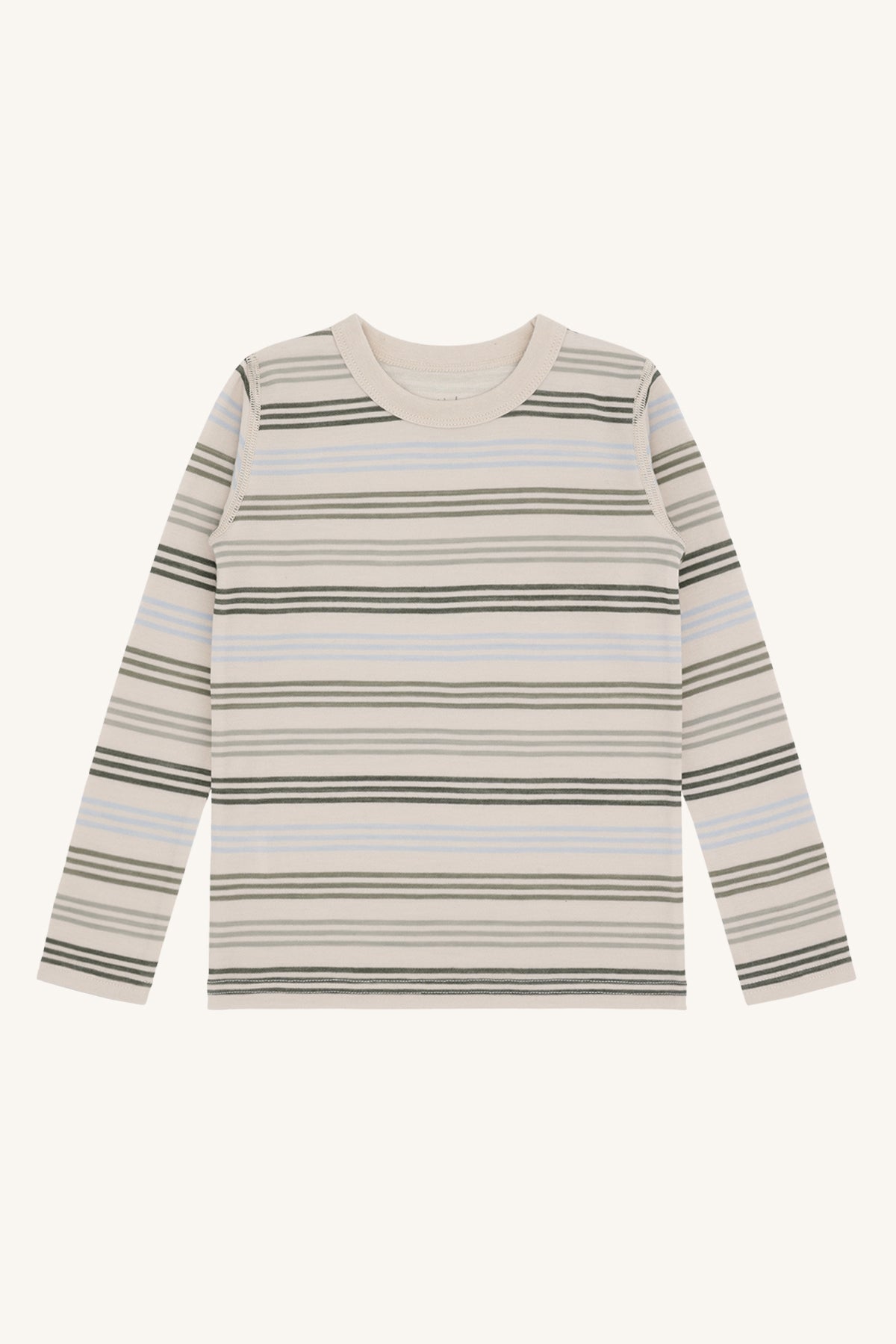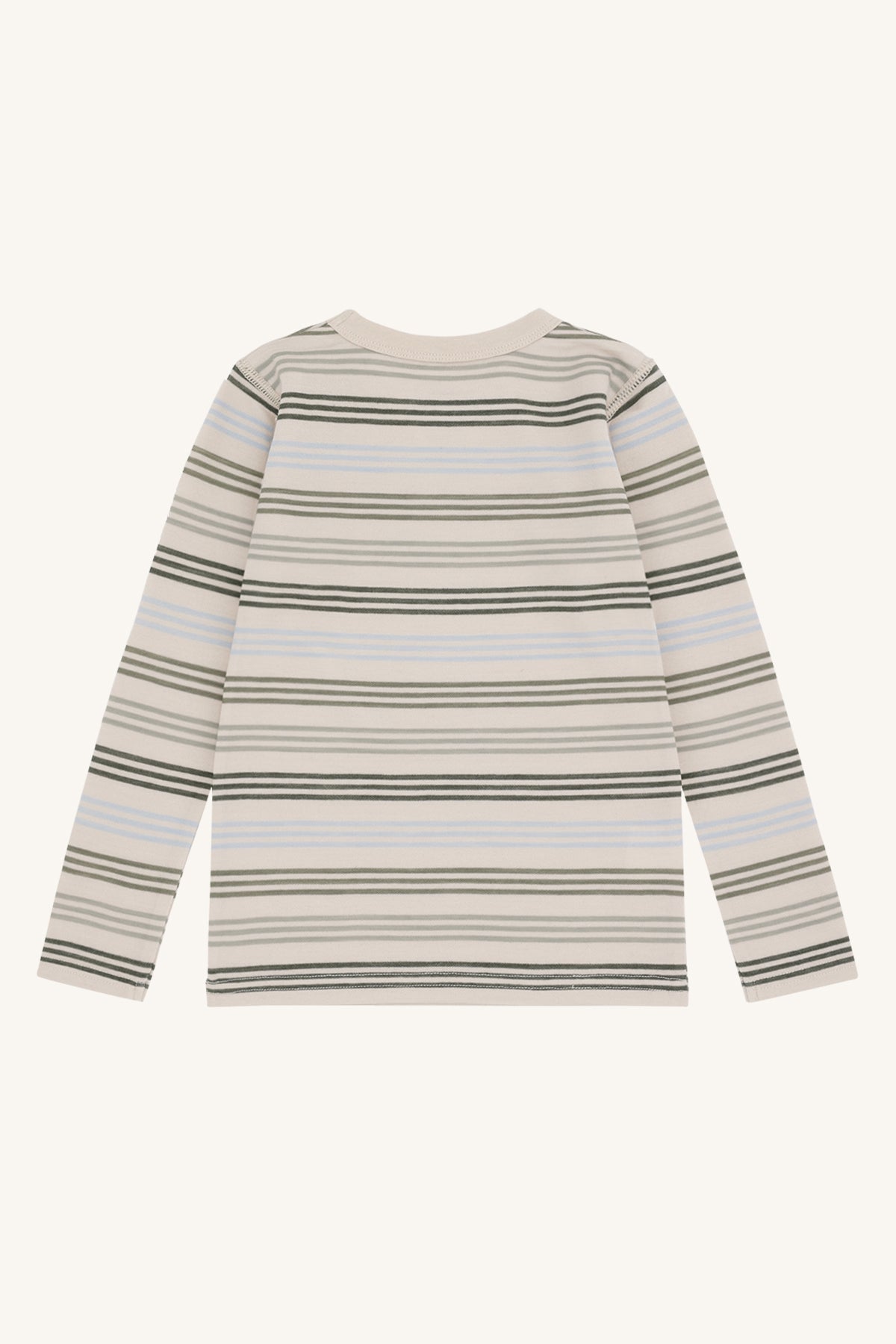 Dieses Langarmshirt überzeugt mit einem klassischen, zugleich modernen Streifenmuster in sanften Naturtönen und kühlem Hellblau auf cremefarbenem Grund. Es passt wunderbar zu Jeans, Leggings oder Latzhosen und lässt sich vielseitig kombinieren – perfekt für jeden Tag.