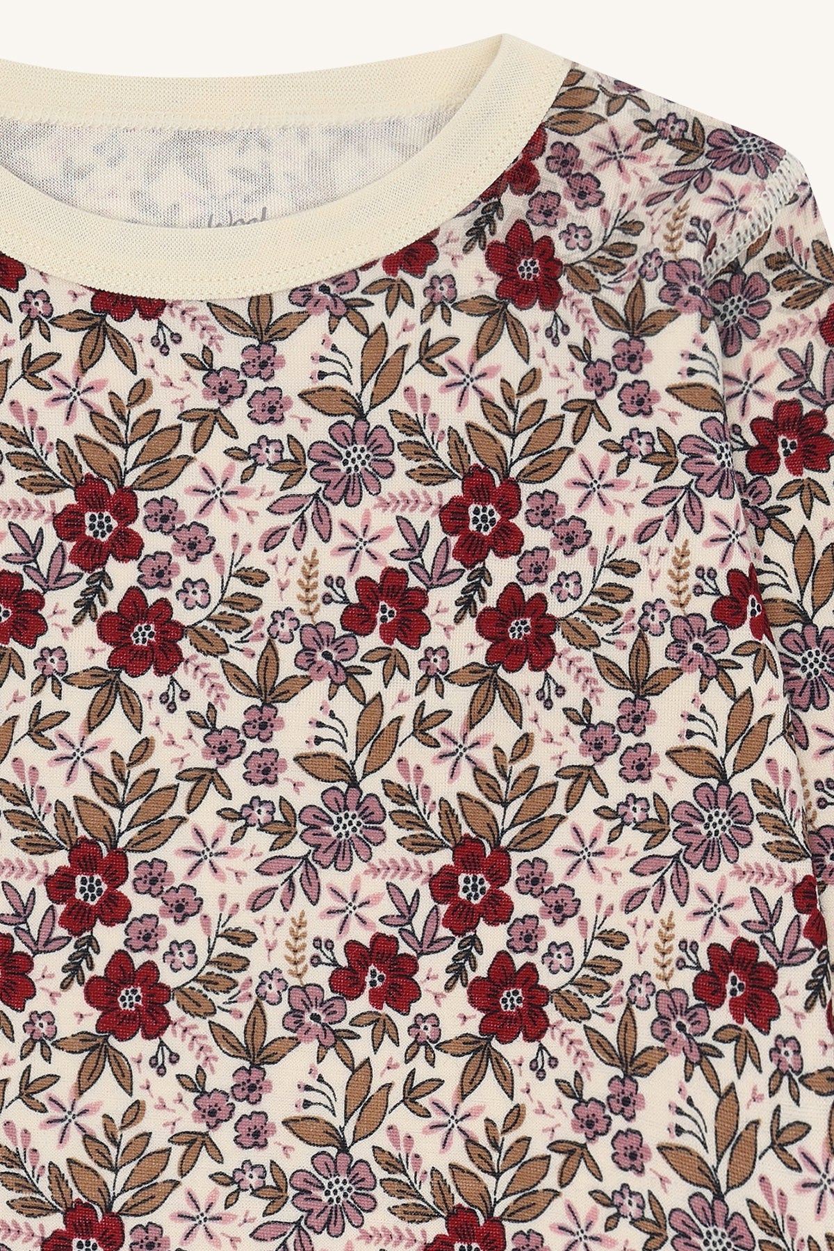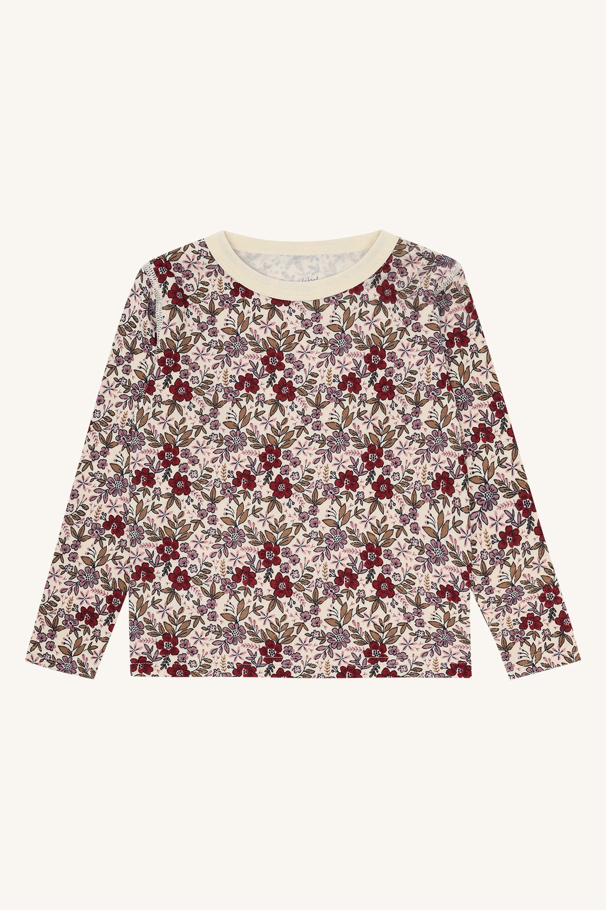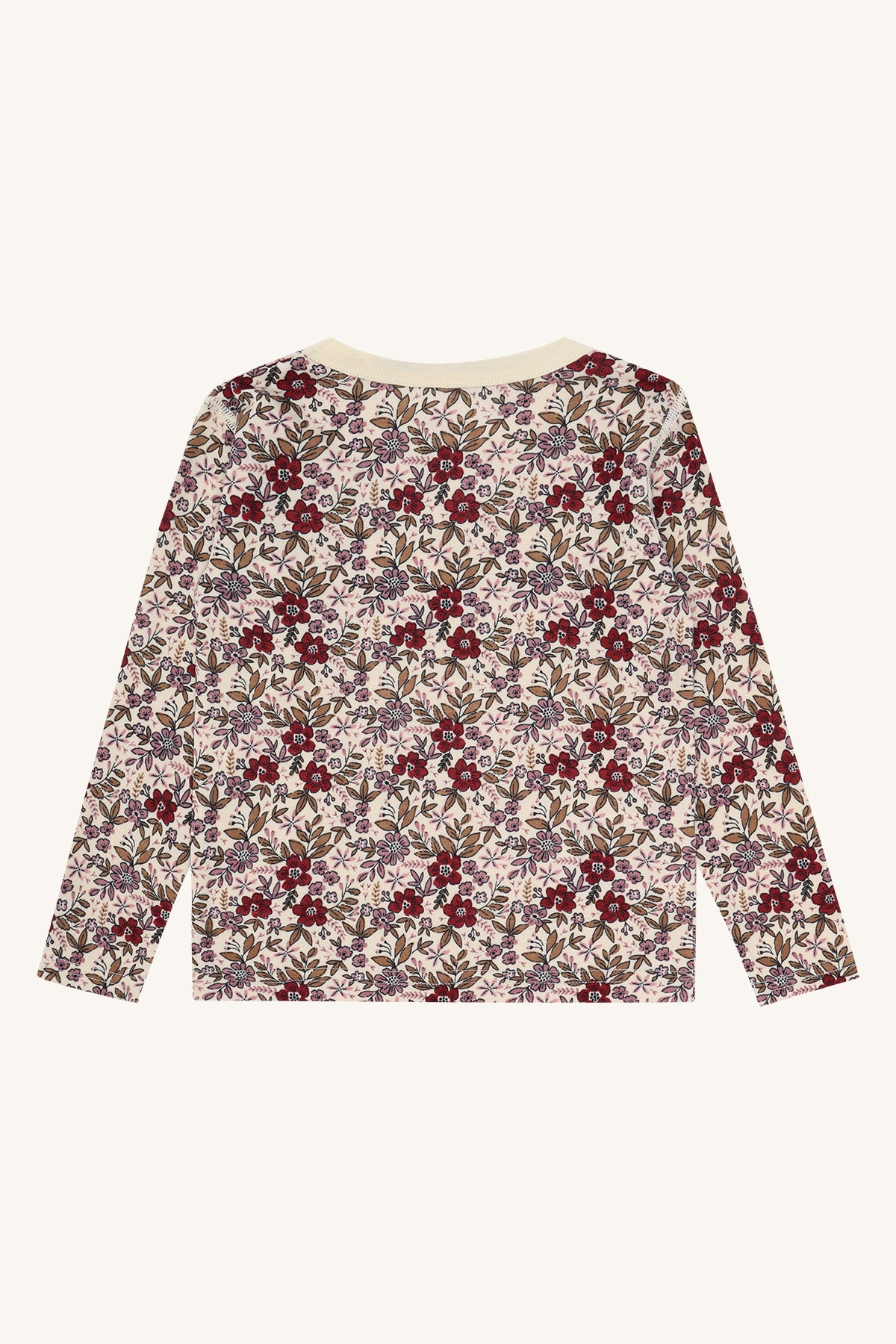 Zarte Blüten in warmem Rot, Flieder und Naturbraun tanzen auf einem sanften Creme-Ton und verleihen diesem Langarmshirt einen romantischen Charme. Der weiche, anschmiegsame Stoff sorgt für ein angenehmes Tragegefühl, während der runde Ausschnitt mit feiner Kontrastkante dem Ganzen einen liebevollen Akzent gibt.