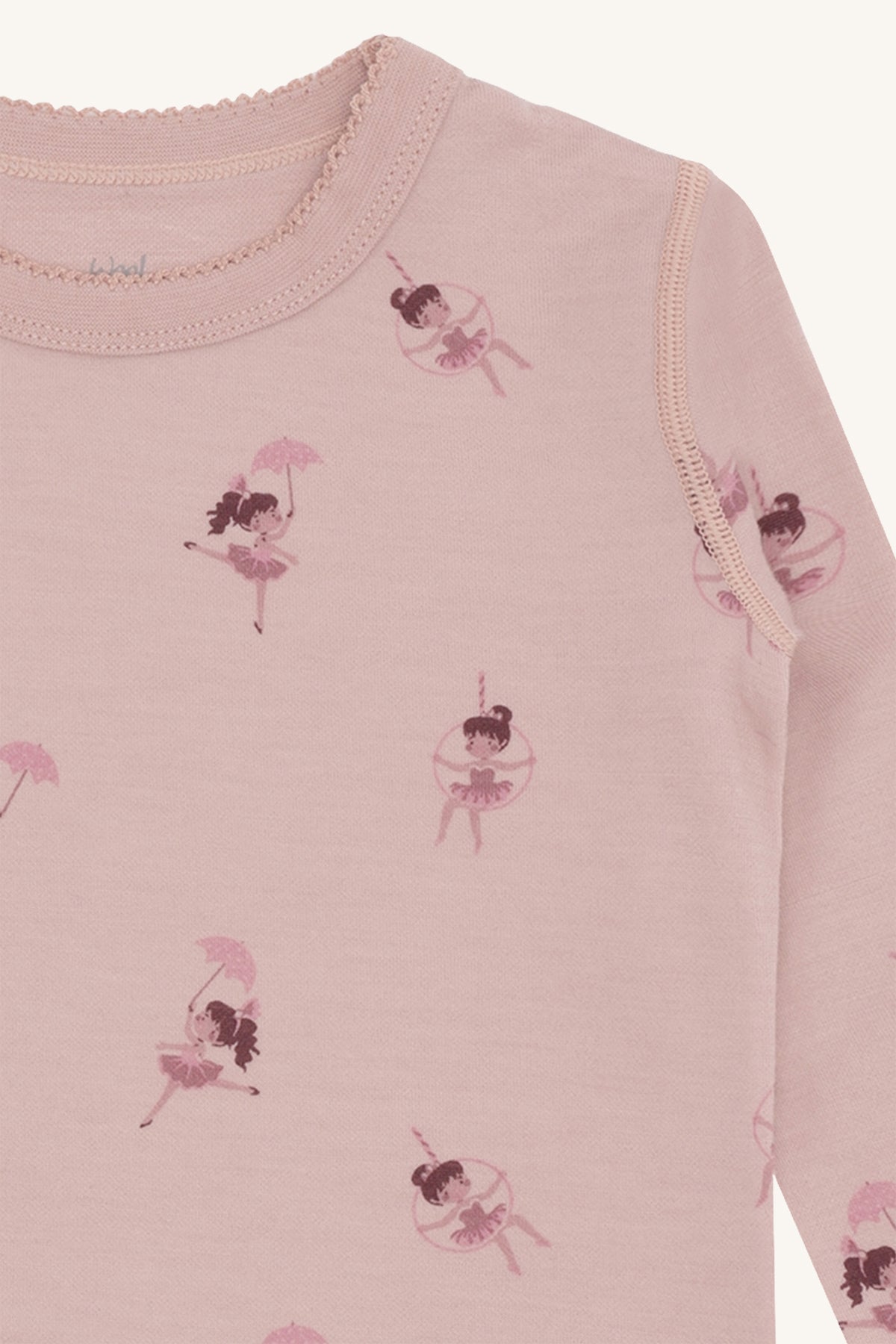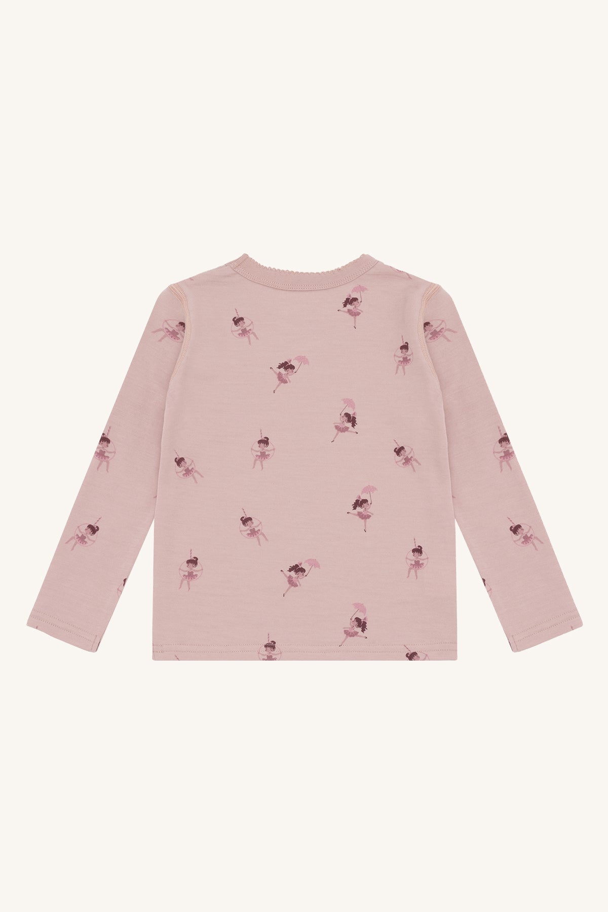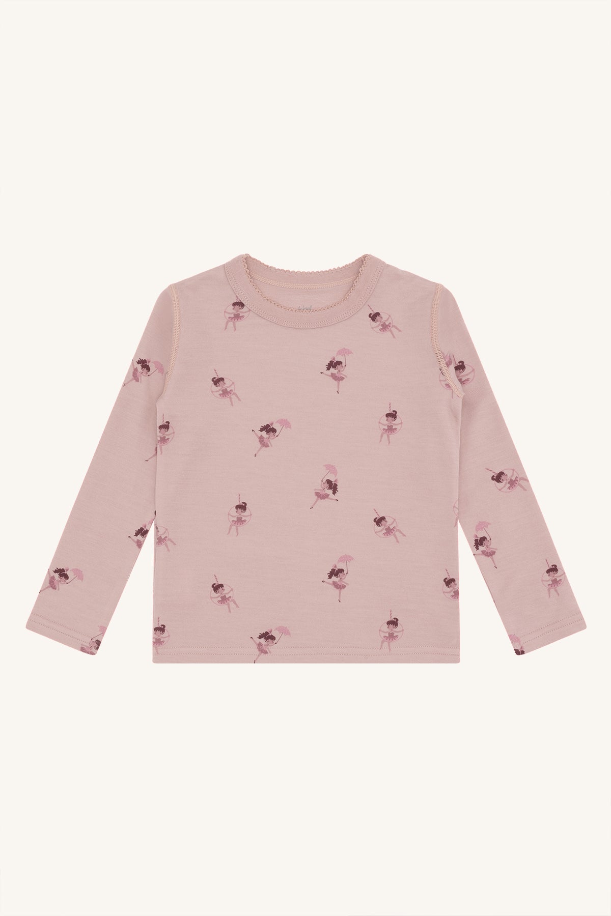 Dieses liebevoll gestaltete Langarmshirt verzaubert mit einem zarten Rosaton und niedlichen kleinen Ballerinas, die mit Schirm und Reif spielerisch über den Stoff tanzen. Die feine Spitzenkante am Halsausschnitt rundet das Design verspielt ab und macht das Shirt zu einem besonderen Lieblingsstück.