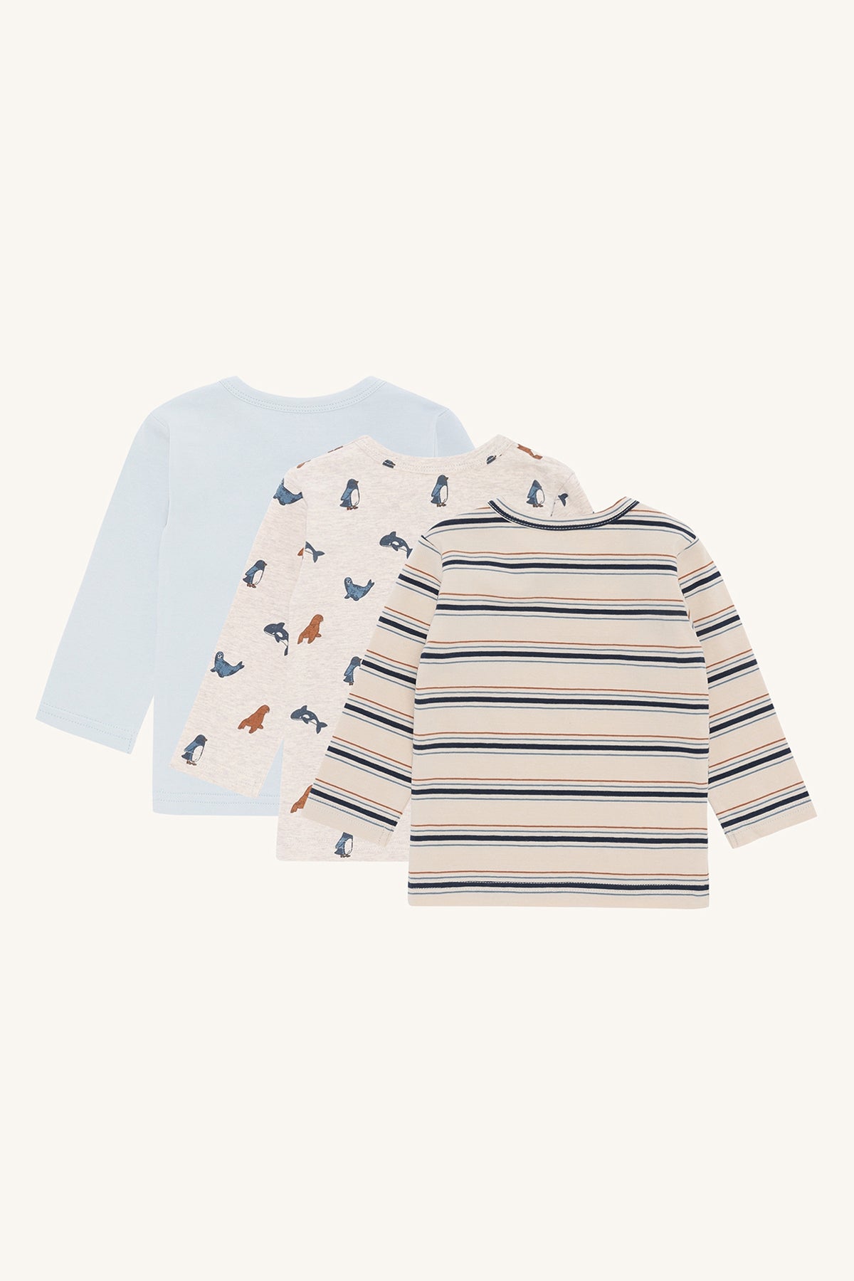 Dieses 3er-Set aus Langarmshirts bringt Abwechslung in die Garderobe kleiner Entdecker. Enthalten sind ein himmelblaues Shirt mit verspieltem Bären-und-Pinguin-Motiv auf dem Skateboard, ein meliertes Shirt mit kleinen Tiermotiven sowie ein gestreiftes Shirt in Beige- und Blautönen. Alle drei bestehen aus weichem, anschmiegsamem Material und lassen sich wunderbar kombinieren – perfekt für jeden Tag und kleine Abenteuer.
