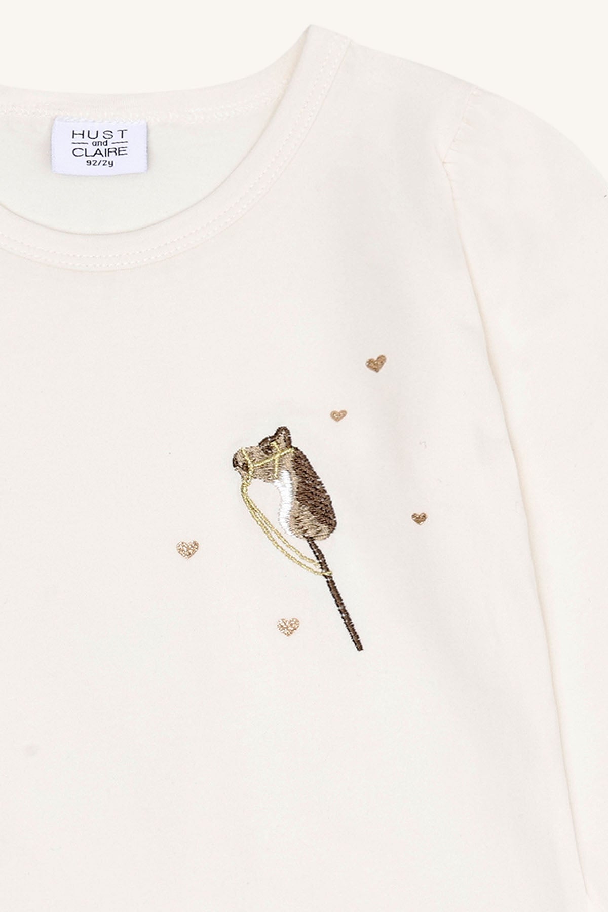 Ein weiches Langarmshirt mit liebevoll gesticktem Steckenpferd, umgeben von kleinen, funkelnden Herzchen. Das detailverliebte Motiv verleiht dem Shirt eine verspielte Note und macht es zu einem echten Lieblingsstück für kleine Pferdefans.