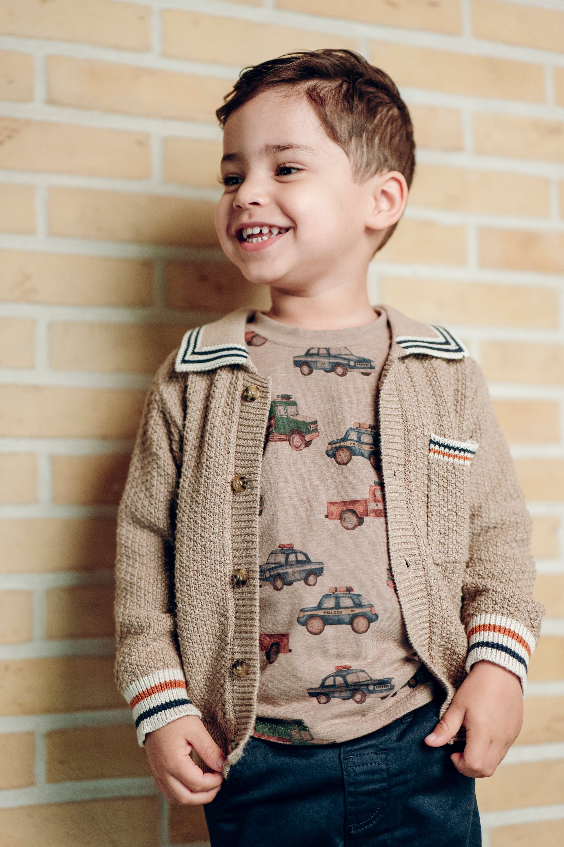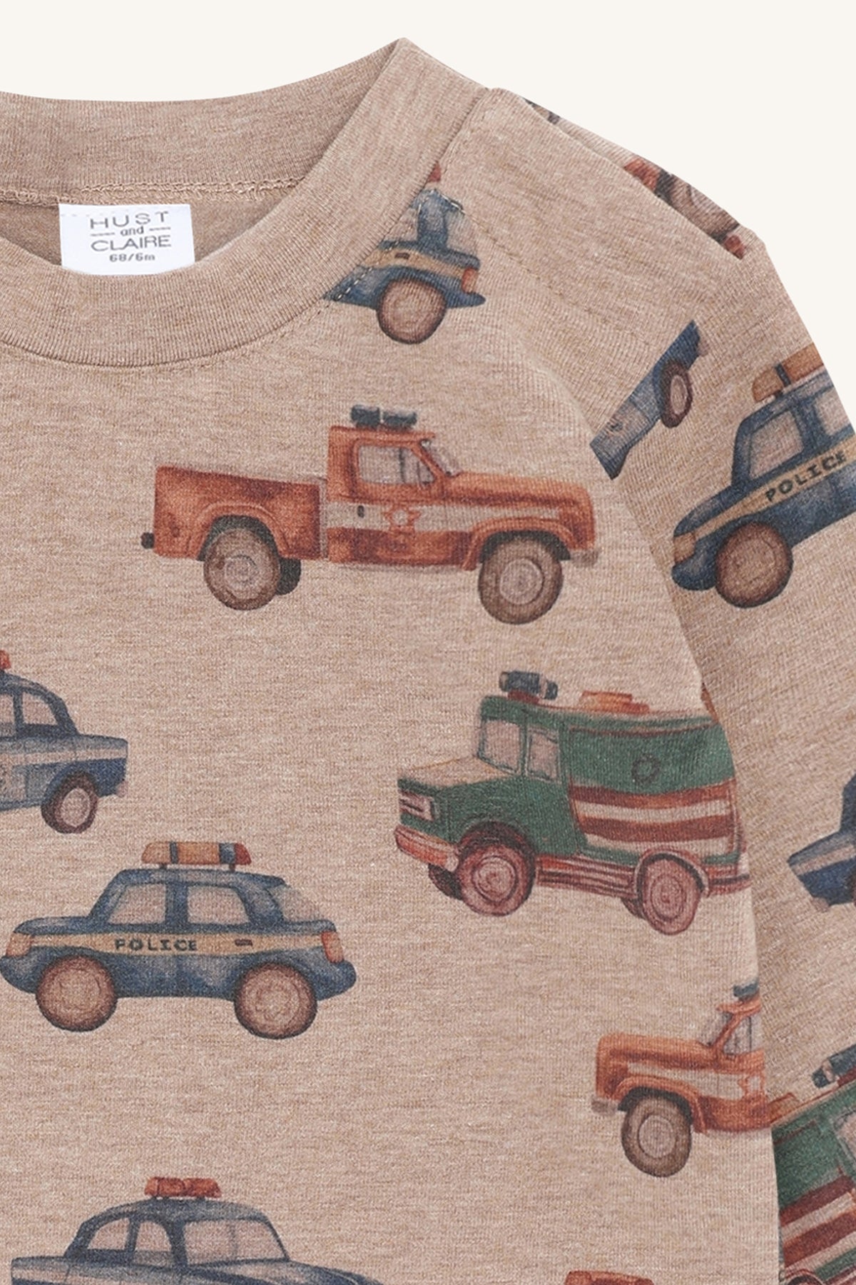 Dieses Langarmshirt ist ein echtes Highlight für kleine Fahrzeug-Fans. Der warme beigefarbene Grundton wird von einem detailreichen Allover-Print mit Polizeiautos, Pick-ups und Vans in Blau, Grün und Rot geschmückt – fast wie eine kleine Flotte zum Anziehen.