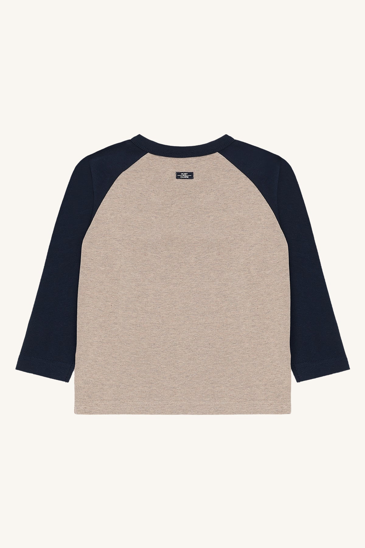 Die dunkelblauen Raglan-Ärmel bilden einen schönen Kontrast zum beige-melierten Grundton des Shirts. Das weiche Material liegt angenehm auf der Haut und bietet durch die lockere Passform viel Bewegungsfreiheit.