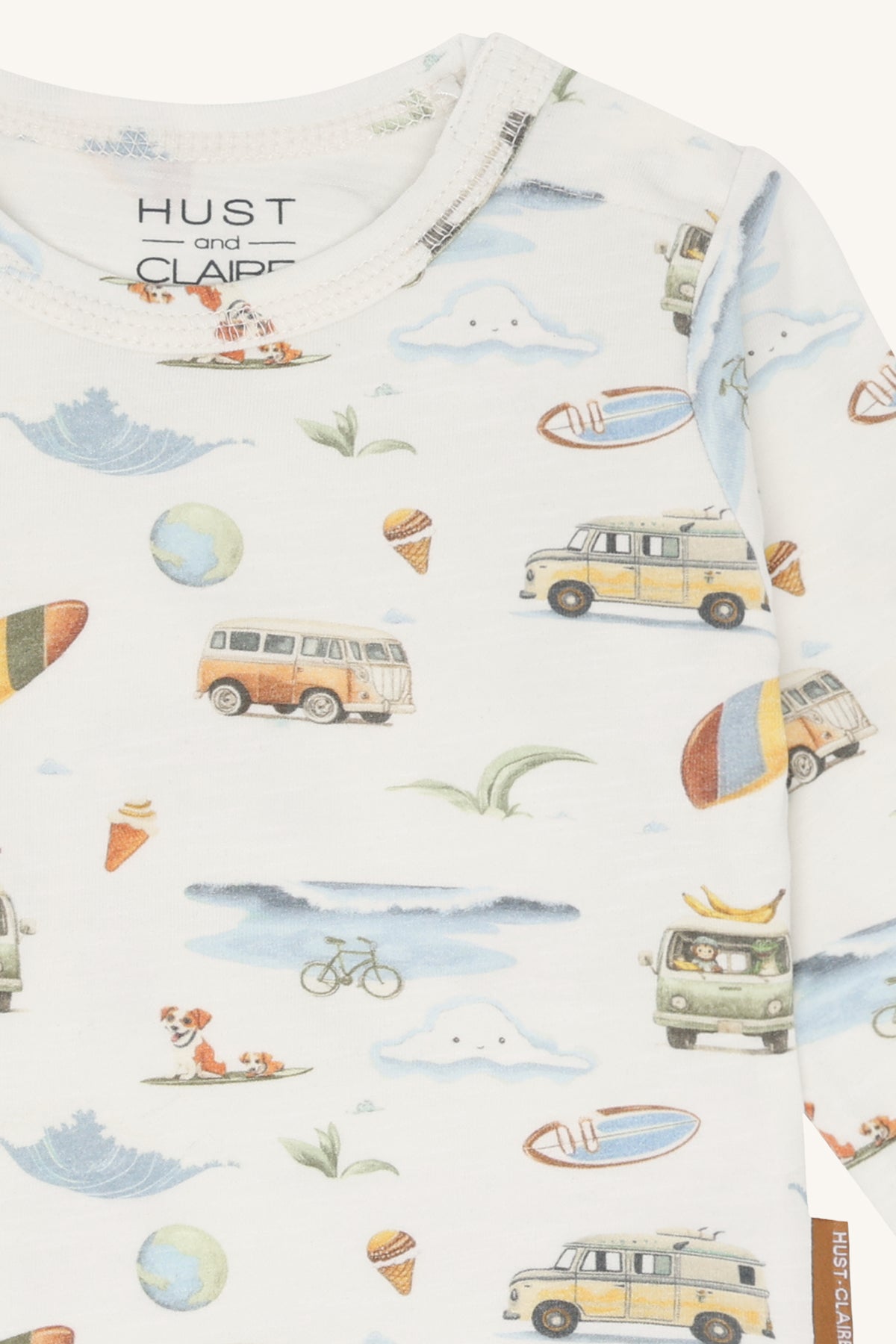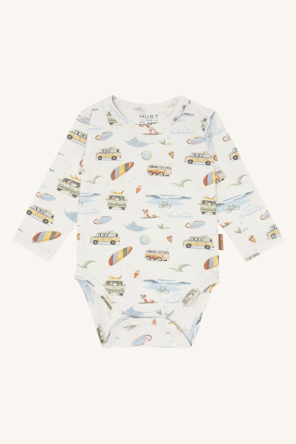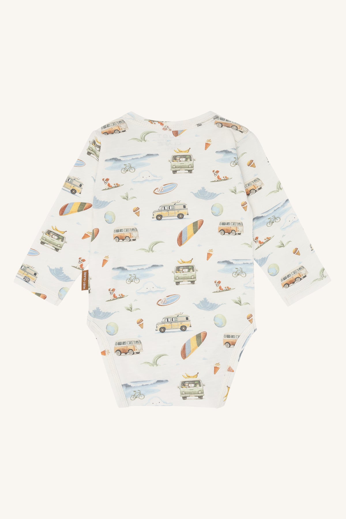Ein Stück Urlaubsgefühl für jeden Tag: Dieser weiche Body ist liebevoll mit kleinen Strandmotiven bedruckt – von Surfbrettern und Wellen bis hin zu fröhlichen Camper-Vans und Eiscreme. Jedes Detail ist wie gemalt und erzählt seine eigene kleine Sommergeschichte.