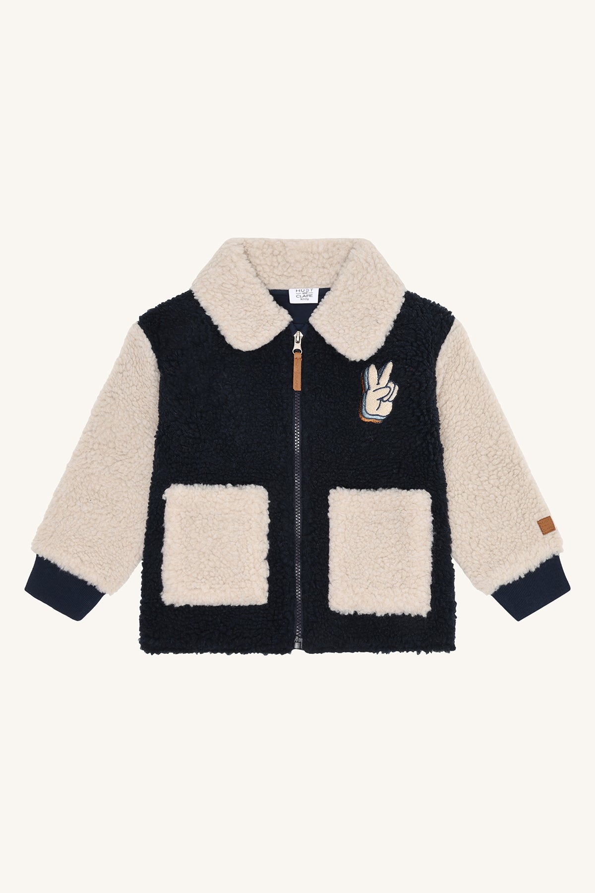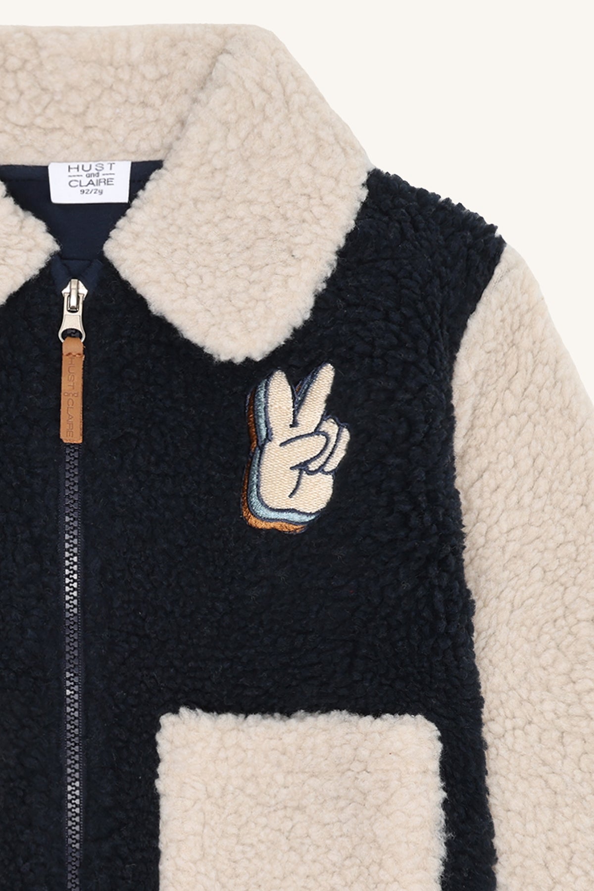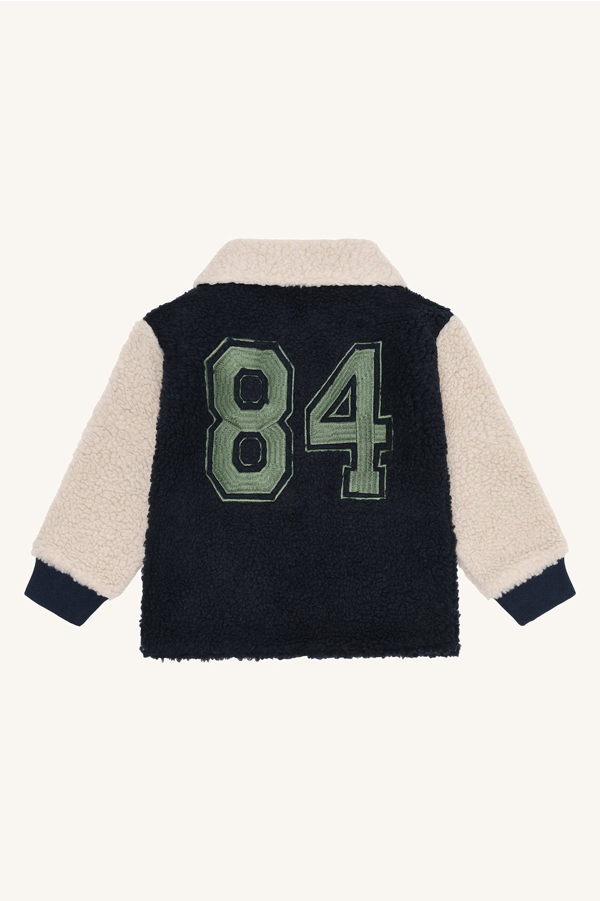 Der zweifarbige Look in Navy und Creme verleiht der Jacke einen sportlich-lässigen Charakter, der durch die aufgestickten Details wie das Peace-Zeichen und die große „84“ auf dem Rücken liebevoll ergänzt wird.