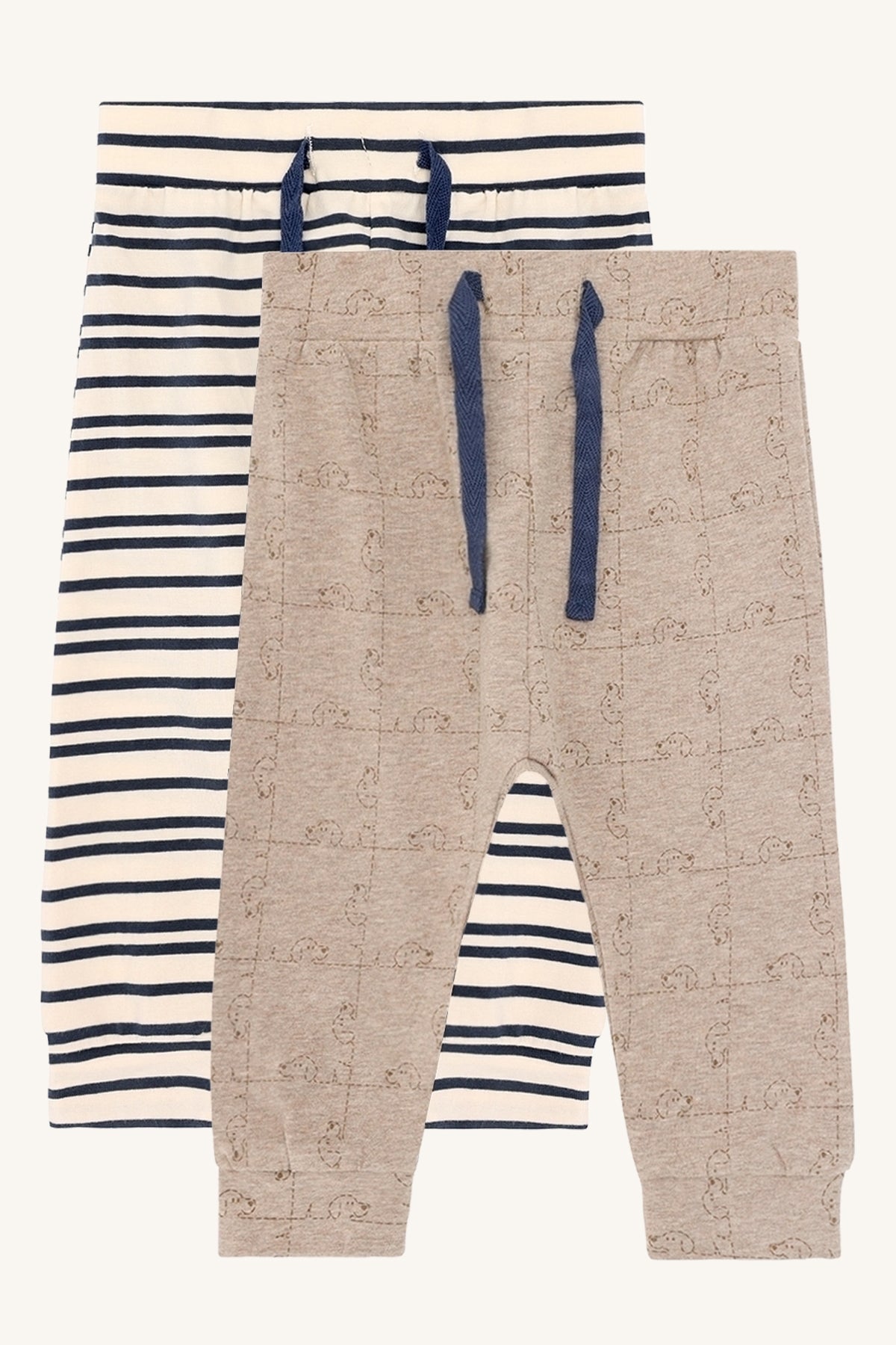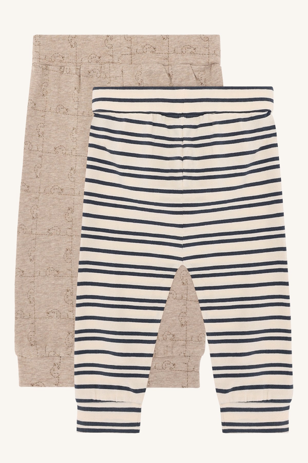 Zwei kleine Lieblingshosen für jeden Tag: Dieses Babyhose-Set kombiniert ein verspieltes Muster mit einer zeitlosen Streifenoptik – perfekt zum Mixen, Matchen und Wohlfühlen.