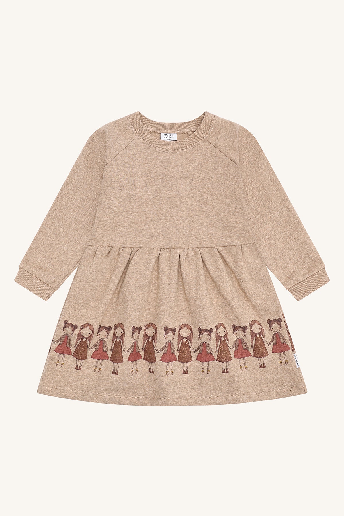 Dieses Kleid verbindet gemütlichen Sweatstoff mit einem besonderen, verspielten Detail. Der lockere Schnitt mit langen Ärmeln sorgt für Bewegungsfreiheit und angenehmen Tragekomfort. Rund um den Saum sind kleine Mädchen mit Kleidchen aufgedruckt, die Hand in Hand stehen – ein liebevoll gestaltetes Motiv, das sofort ins Auge fällt und Freude ausstrahlt. Ein alltagstaugliches Kleid, das mit seinem kindgerechten Design Geborgenheit und Fröhlichkeit vermittelt.