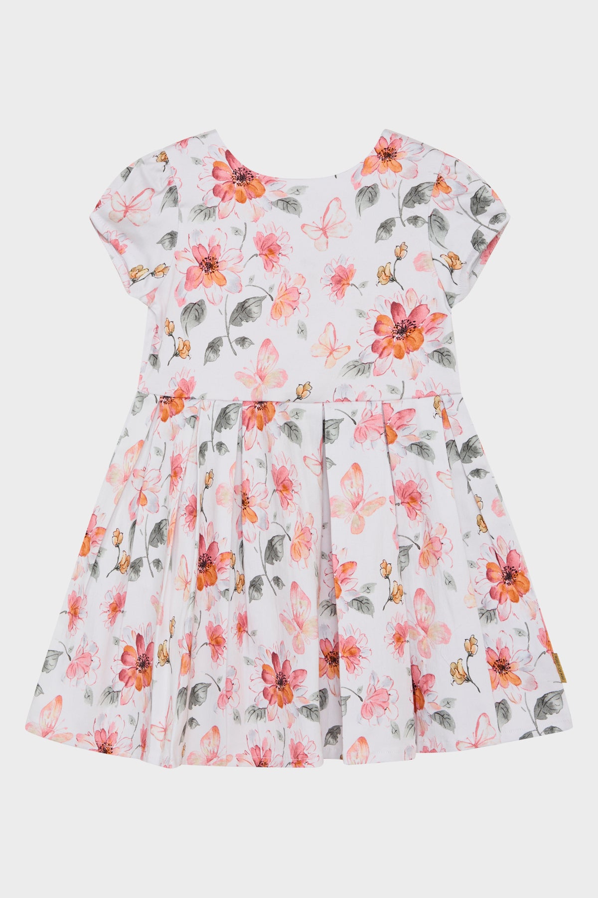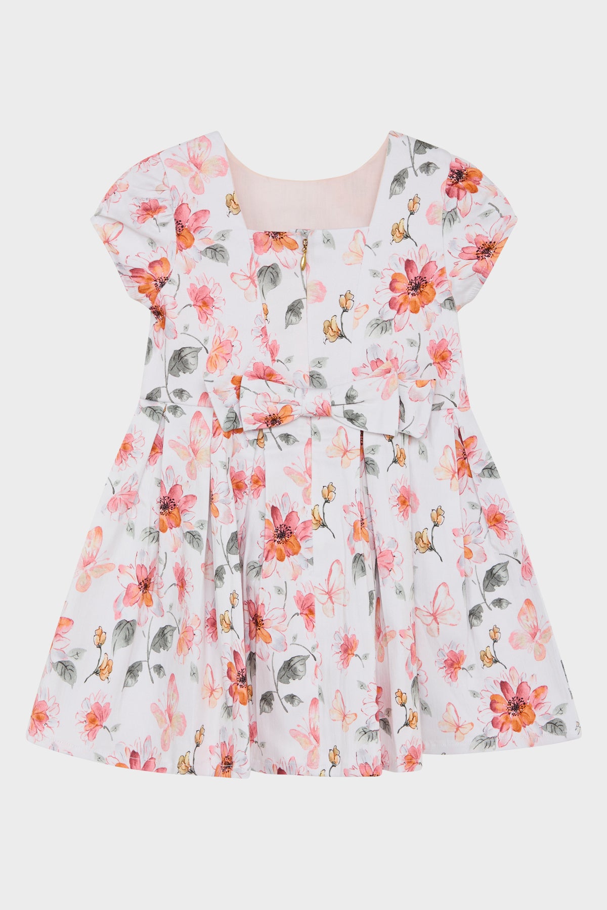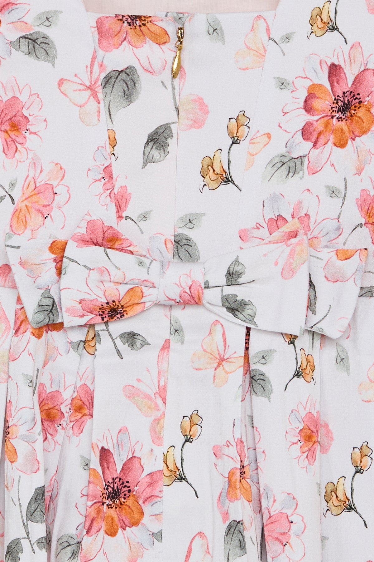 Kleid aus weicher, dehnbarer Baumwolle mit einem Blumenprint. Dieses Modell hat Faltendetails an den Schultern und eine Zierschleife hinten. Das Kleid verfügt über eine Unterteilung in der Taille und einen Rüschenbesatz, sodass es unten schön weit ist. Das Kleid wird mithilfe eines versteckten Reißverschlusses am Rücken geschlossen.