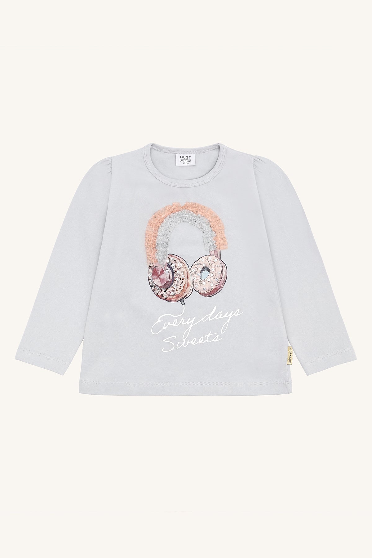 Dieses Langarmshirt überzeugt mit einem fröhlichen Motiv, das sofort Lust auf Spaß macht: Kopfhörer, die in Form von süßen Donuts gestaltet sind. Glitzernde Pailletten und feine Tüll-Details unterstreichen das verspielte Design und machen das Shirt zu etwas ganz Besonderem. Der bequeme Schnitt und das weiche Material sorgen dabei für hohen Tragekomfort – ein Lieblingsstück, das gute Laune verbreitet und Kinderaugen strahlen lässt.