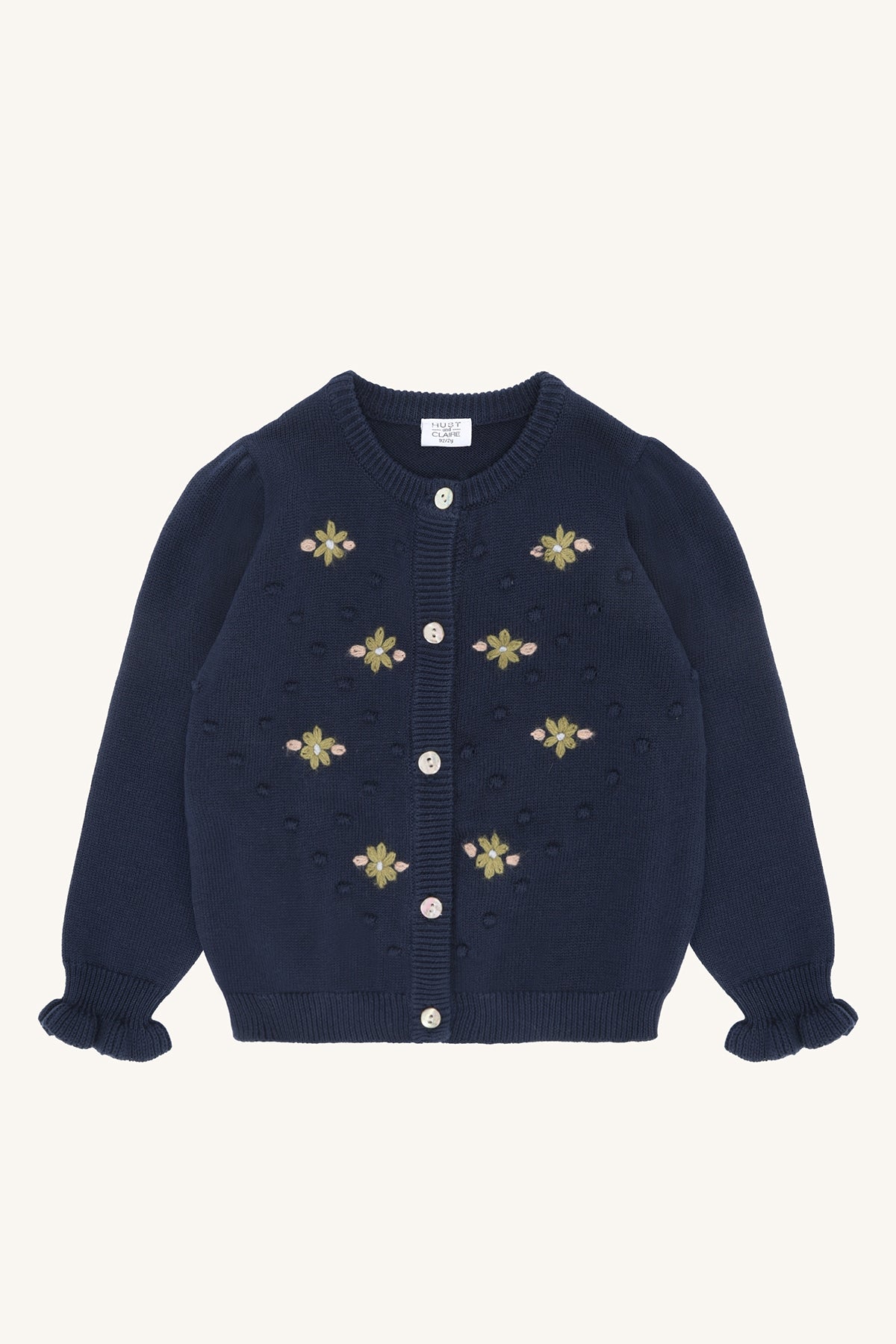 Diese dunkelblaue Strickjacke ist ein echtes Lieblingsstück für kühlere Tage. Zarte Blütenstickereien auf der Vorderseite und kleine Stricknoppen verleihen ihr einen besonderen, verspielten Charme. Die fein gearbeiteten Rüschen an den Ärmelabschlüssen runden den Look liebevoll ab. Durch die weiche Strickqualität trägt sich die Jacke angenehm und lässt sich vielseitig kombinieren – ob zu Kleidern oder Hosen. Ein wunderschönes Kleidungsstück, das Wärme schenkt und jedes Outfit auf charmante Weise ergänzt.