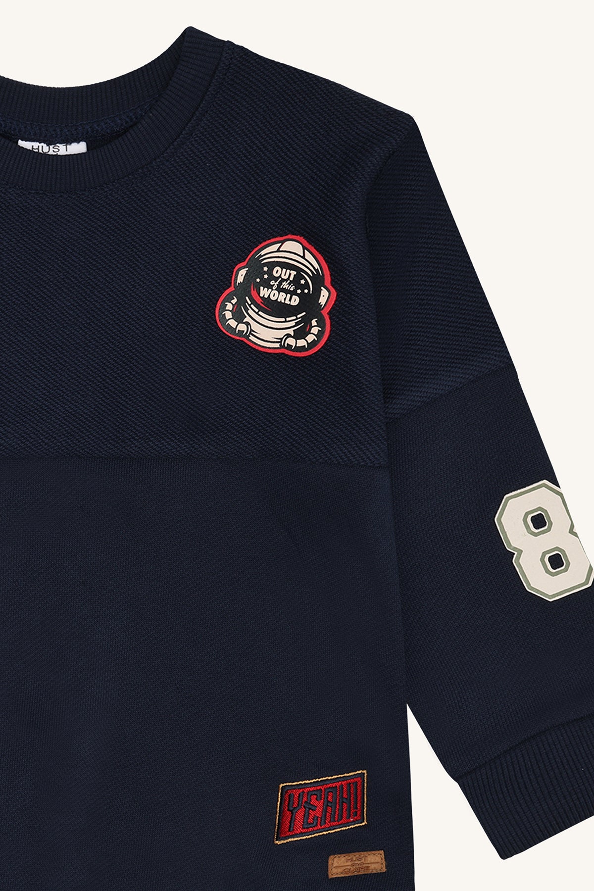 Auf dem dunkelblauen Grund kommen die verschiedenfarbigen Patches wie Astronaut, Peace-Zeichen oder "Yeah"-Schriftzug besonders schön zur Geltung. Ein echter Hingucker ist auch die große 8 auf dem Ärmel und der kleine Ball am Rücken.