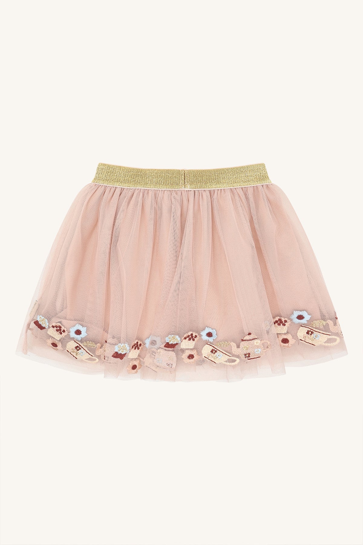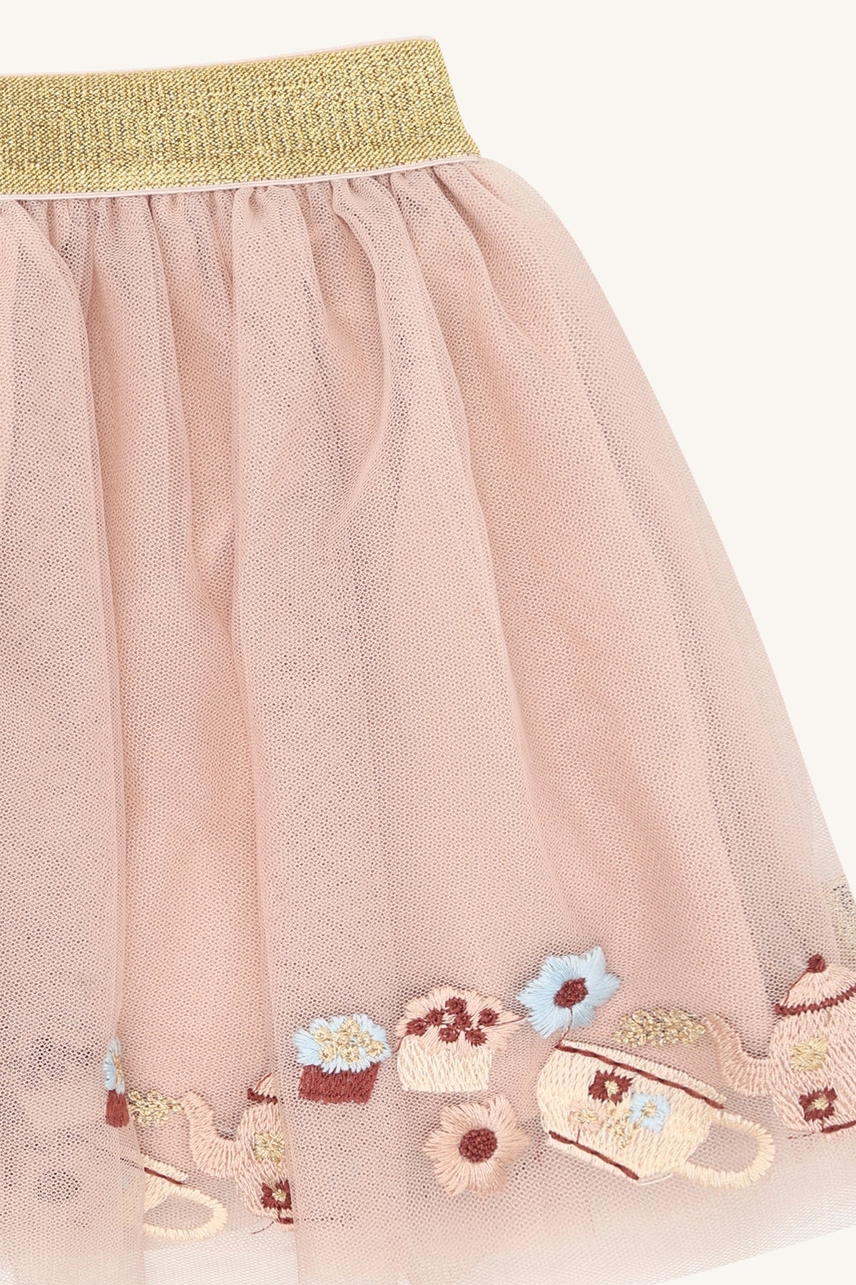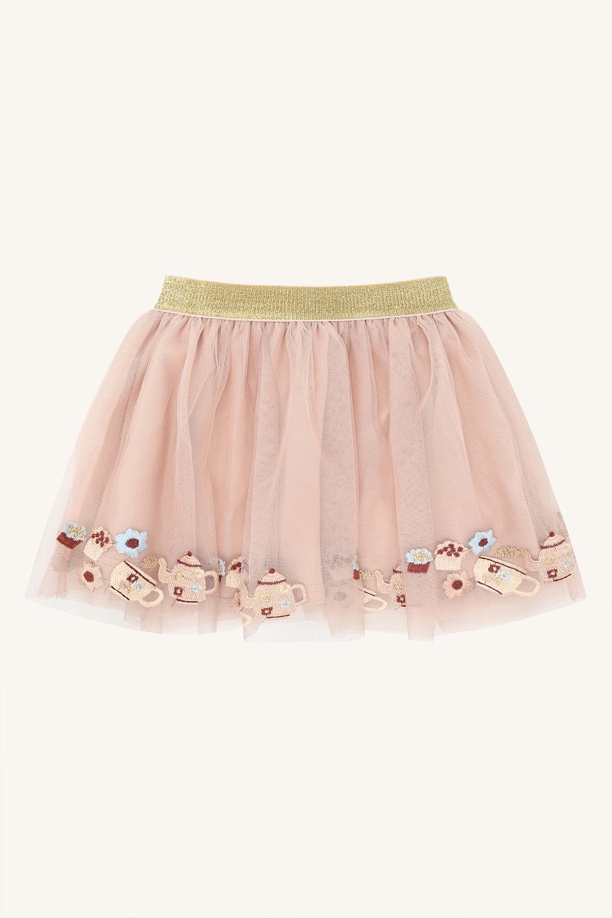 Dieser verspielte Tüllrock in zartem Rosé lädt zum Träumen ein. Der goldene Gummibund sorgt für einen bequemen Sitz und bringt gleichzeitig einen Hauch von Glanz ins Outfit. Ein besonderes Highlight sind die liebevollen Stickereien am Saum: kleine Teekannen, Tassen, Kuchen und Blümchen, die dem Rock einen einzigartigen, märchenhaften Charme verleihen. Ob zum Geburtstag, zur Feier oder einfach für den Alltag – dieser Rock macht jedes Outfit zu etwas ganz Besonderem.