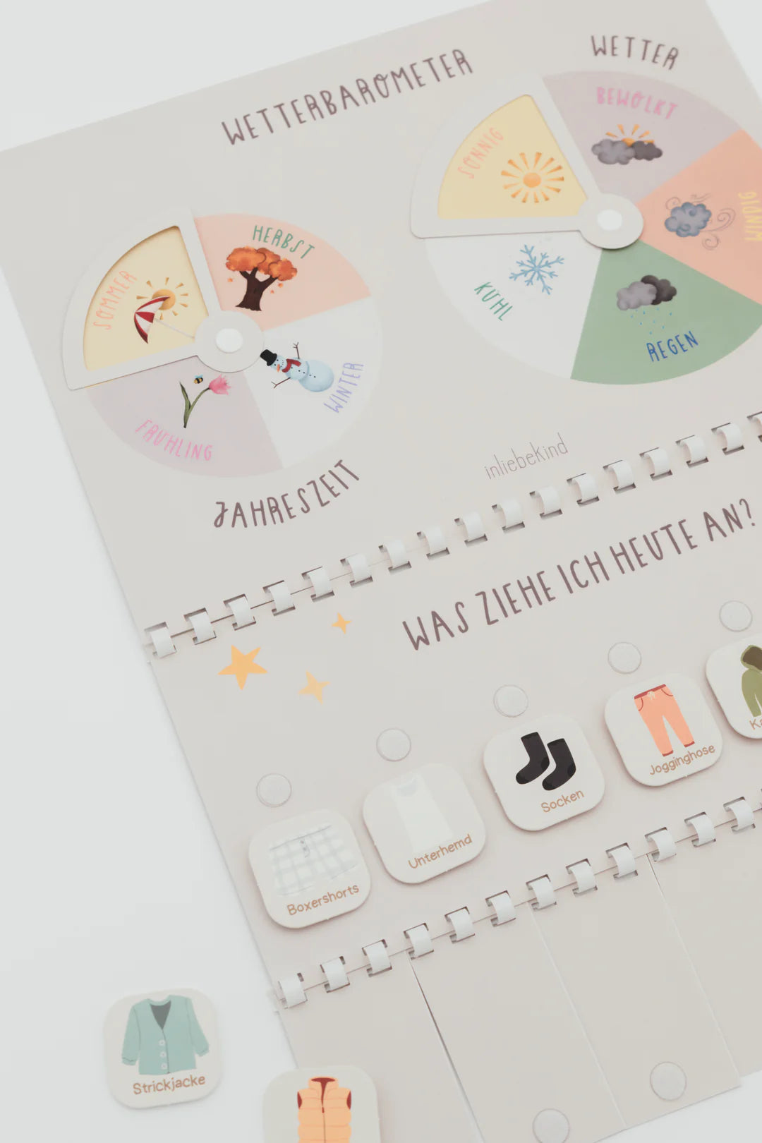 Mit drehbaren Wetter- und Jahreszeit-Scheiben, einer Anziehstraße und 105 illustrierten Kleidungskärtchen lernen Kinder spielerisch, sich passend zum Wetter selbst anzuziehen.