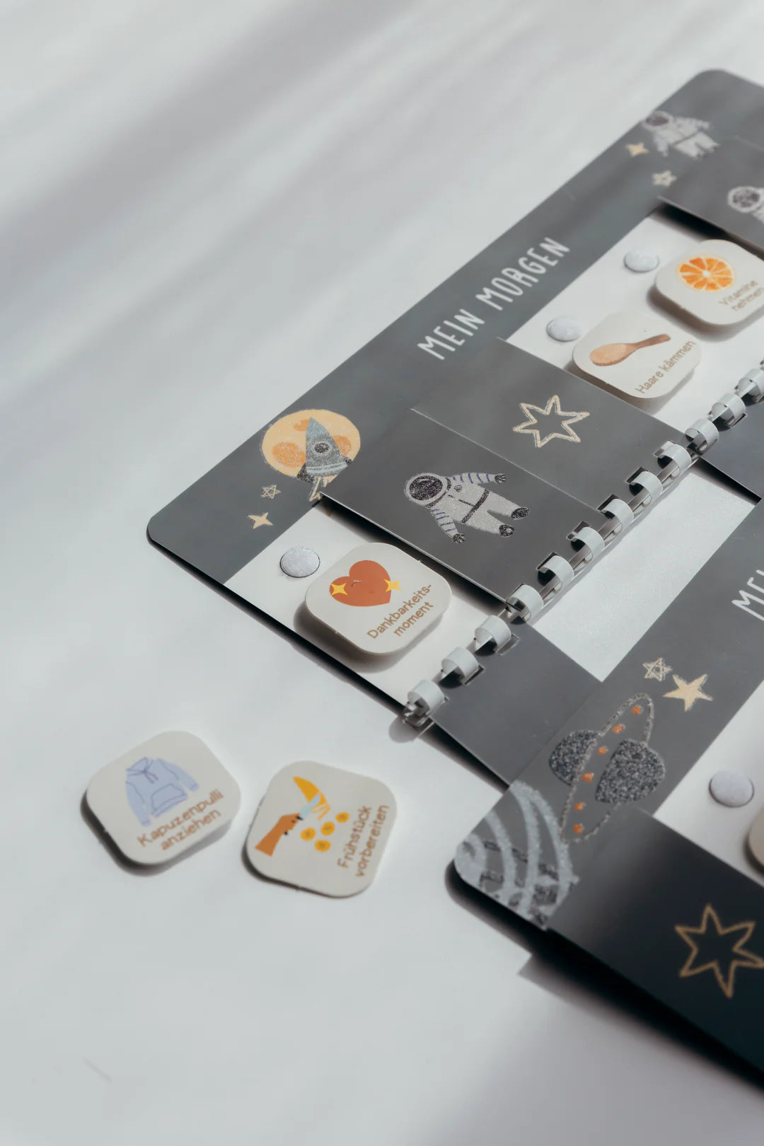 Die kleinen Routinekärtchen werden nach und nach umgeklappt, sobald eine Aufgabe erledigt ist. So behält dein Kind jederzeit den Überblick – ohne ständiges Erinnern. Stattdessen entsteht ein schönes Ritual, das den Tag in kleine, machbare Schritte gliedert – in eurem ganz eigenen Tempo.