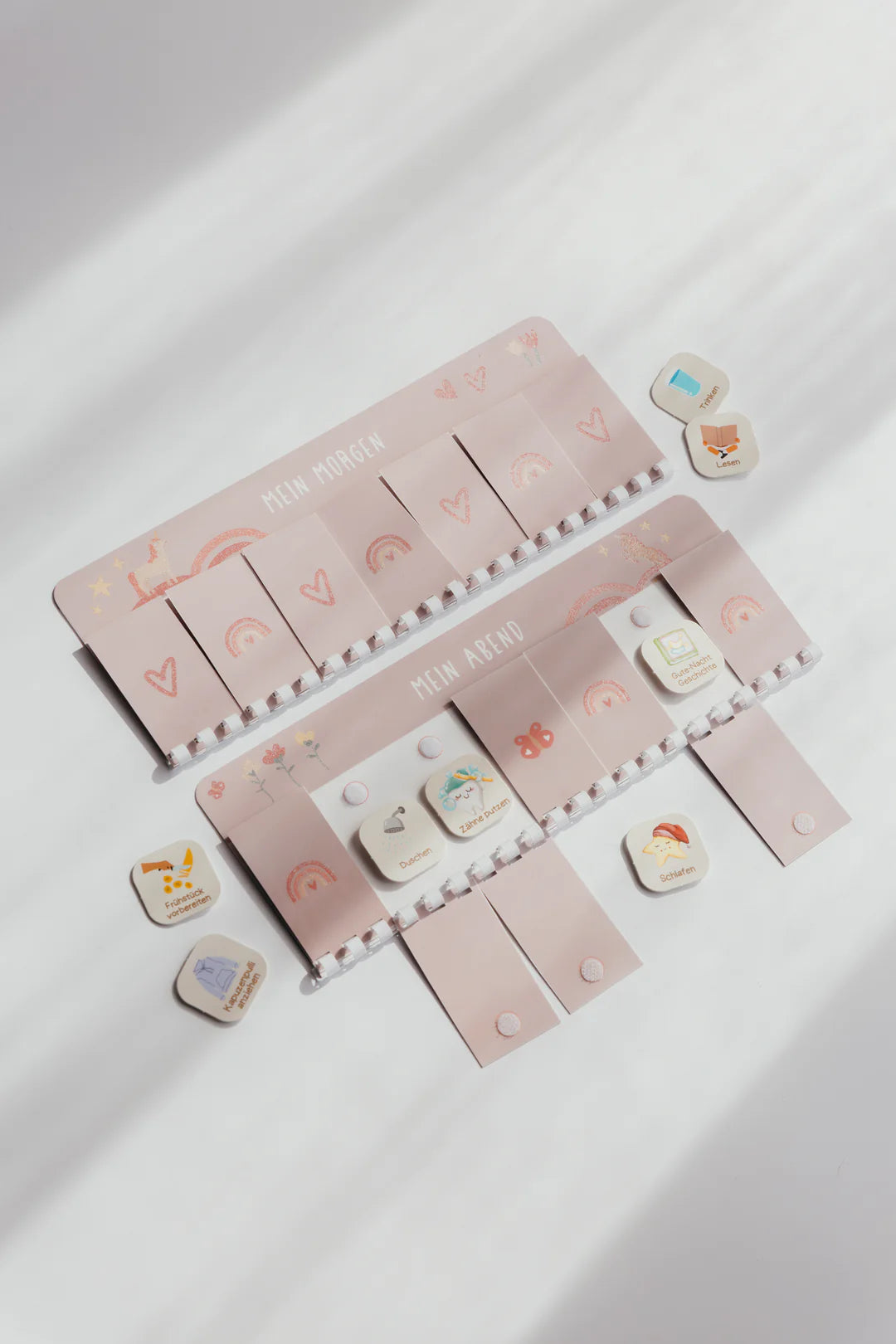 Die kleinen Routinekärtchen werden nach und nach umgeklappt, sobald eine Aufgabe erledigt ist. So behält dein Kind jederzeit den Überblick – ohne ständiges Erinnern. Stattdessen entsteht ein schönes Ritual, das den Tag in kleine, machbare Schritte gliedert – ganz entspannt in eurem eigenen Tempo.