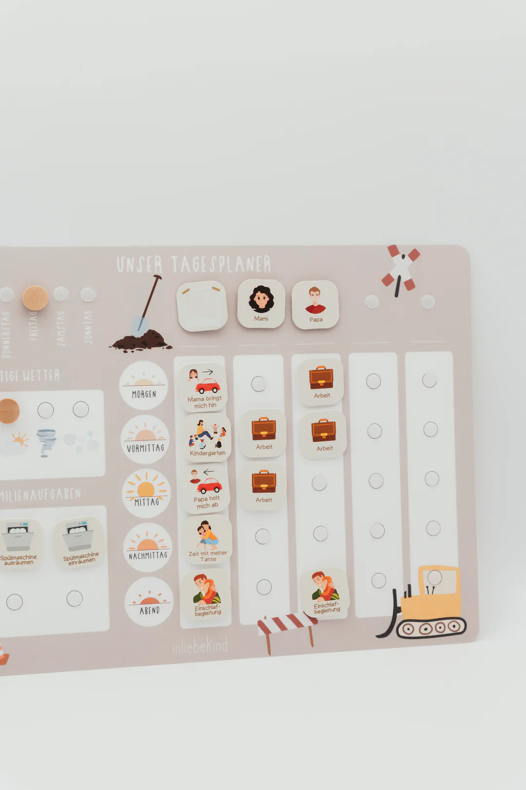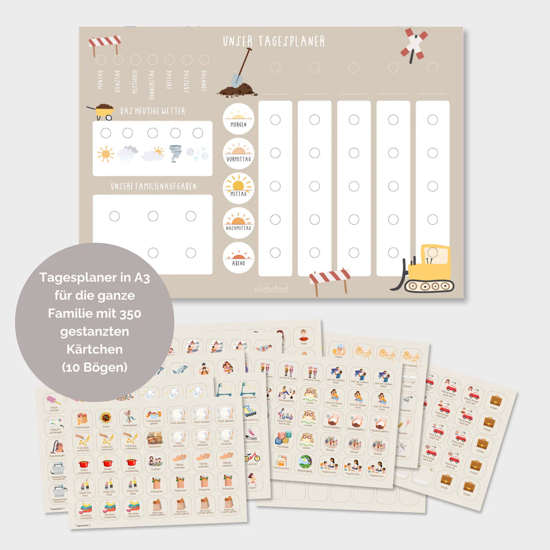 Der Familien-Tagesplaner bringt Ordnung und Leichtigkeit in den Alltag – hier im coolen Bagger-Design. Kindgerecht, übersichtlich und flexibel – ideal für bis zu fünf Familienmitglieder, egal ob Eltern mit Kindern oder ganz individuell.