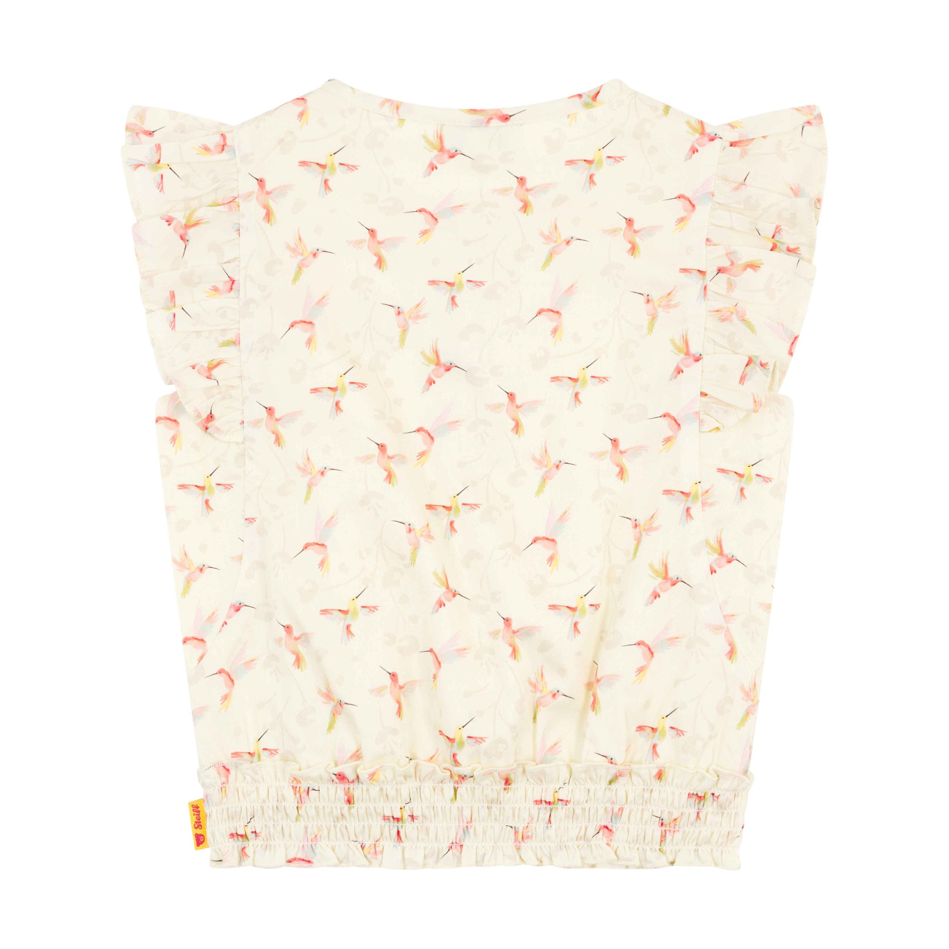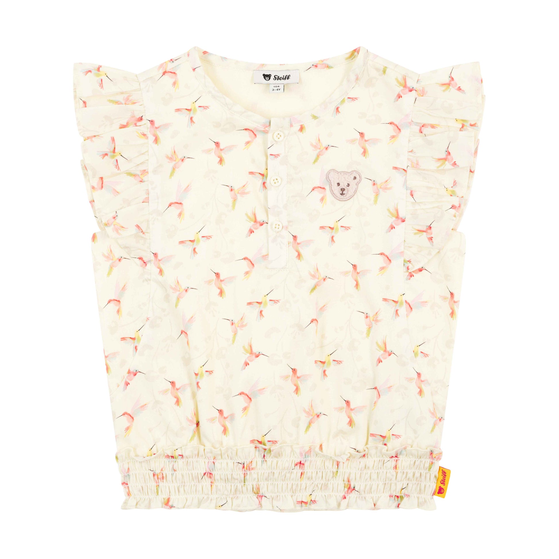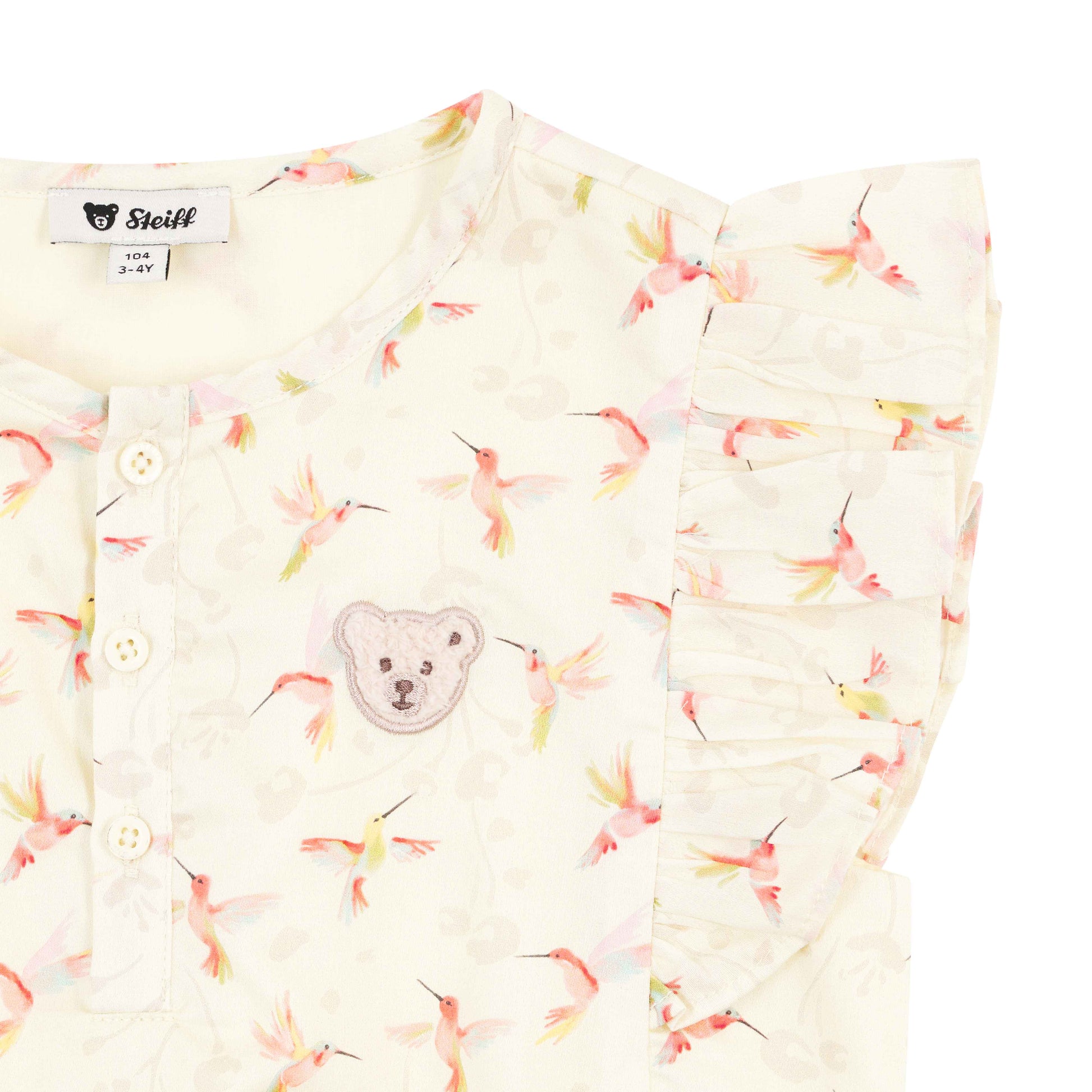 Diese wunderschöne Bluse aus weicher Baumwolle verzaubert kleine Mädchen mit einem verspielten Kolibriprint auf sanftem Beige. Zarte Rüschen um die Armausschnitte und feine Raffungen am Saum verleihen der Bluse eine zauberhafte Silhouette und eine bequeme, leicht taillierte Passform. Die Knopfleiste vorne macht das Anziehen besonders angenehm und ergänzt den klassischen Look. Das flauschige Steiff Teddybärmotiv bringt zusätzlich eine liebevolle Note ins Design – ein charmantes Lieblingsstück für kleine Entdeckerinnen.