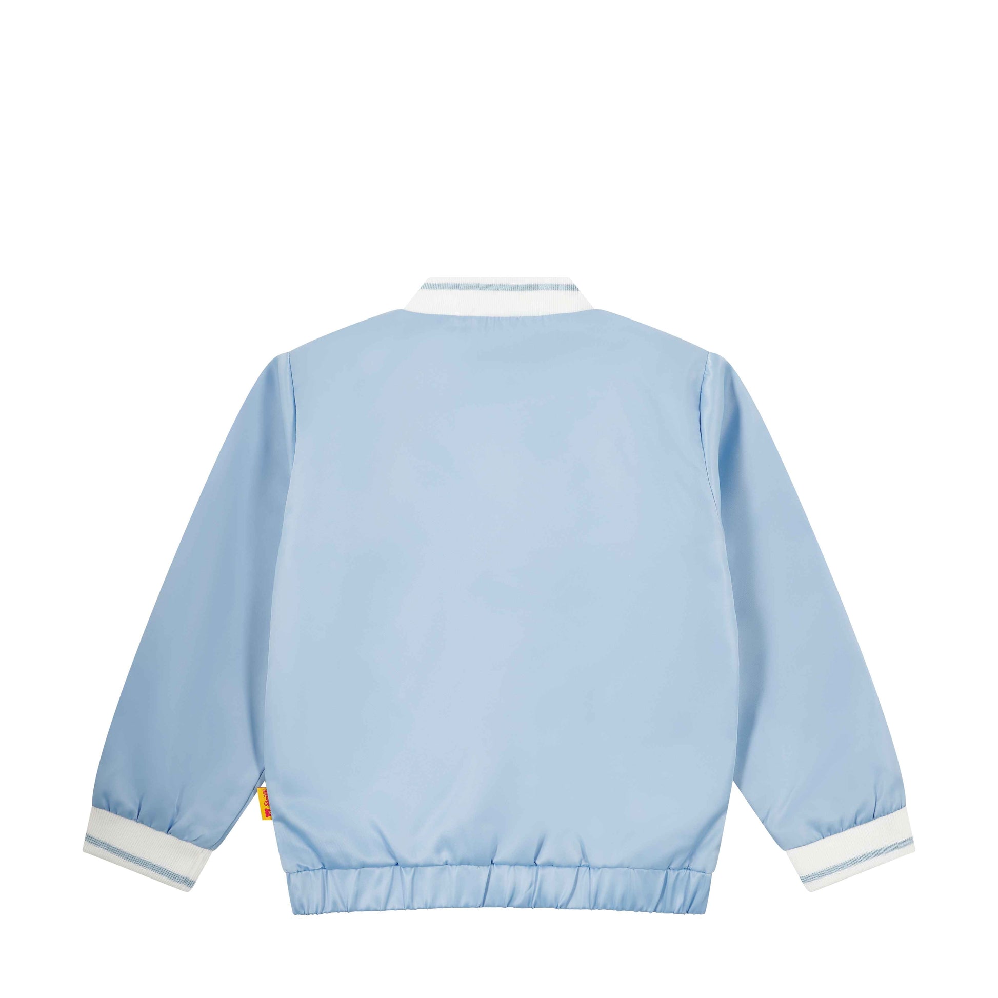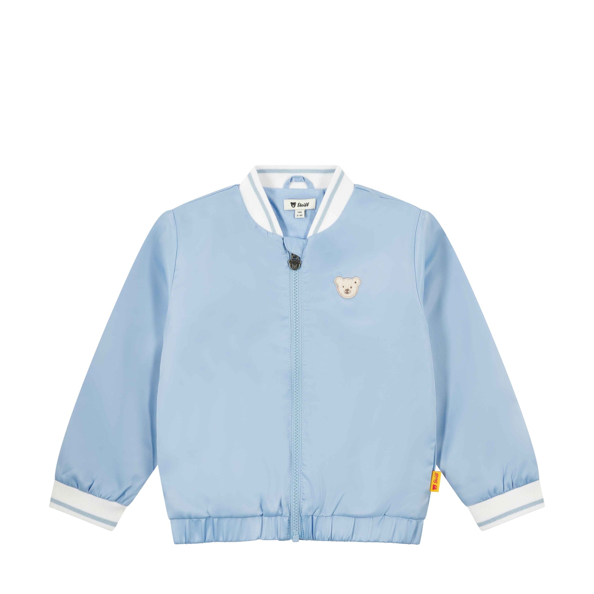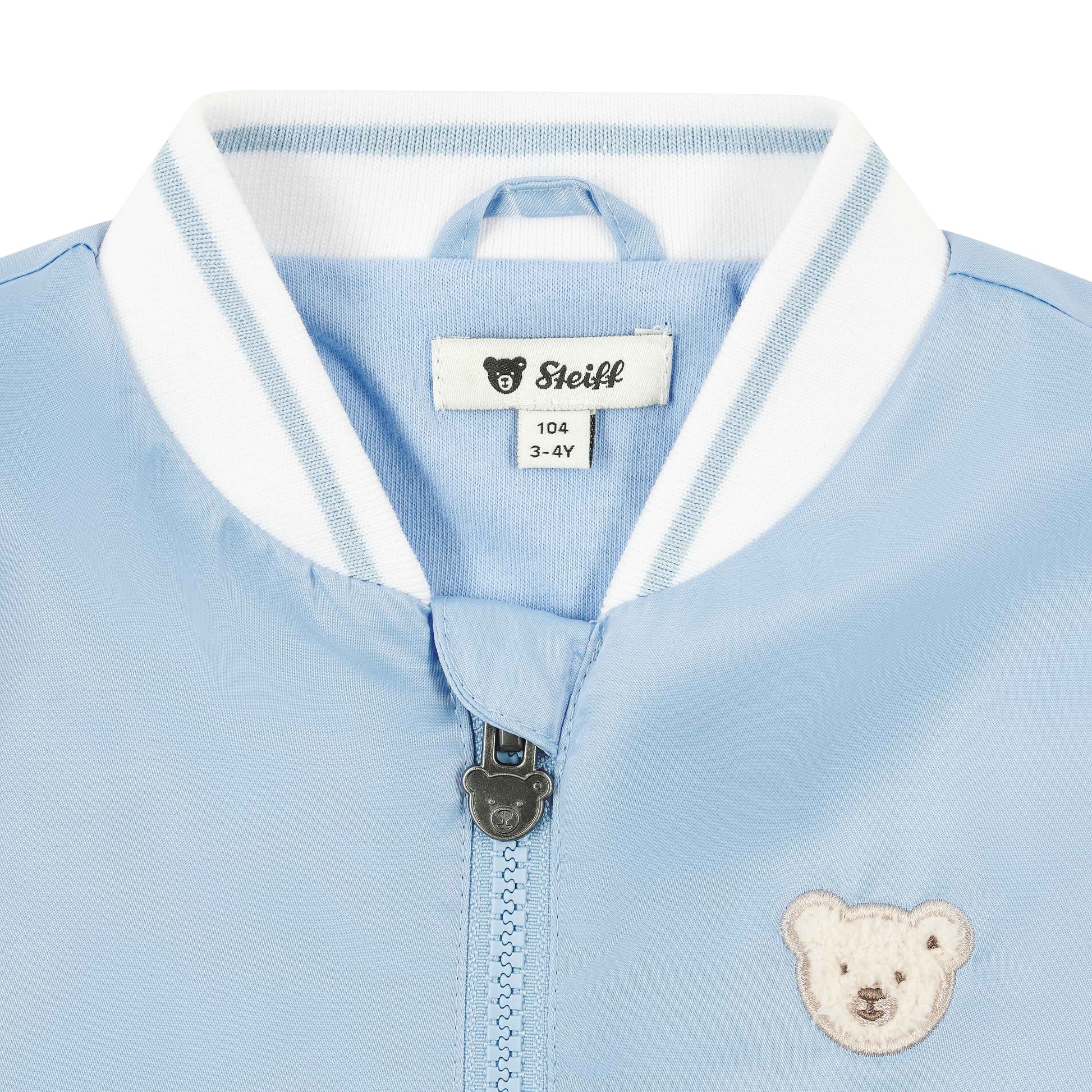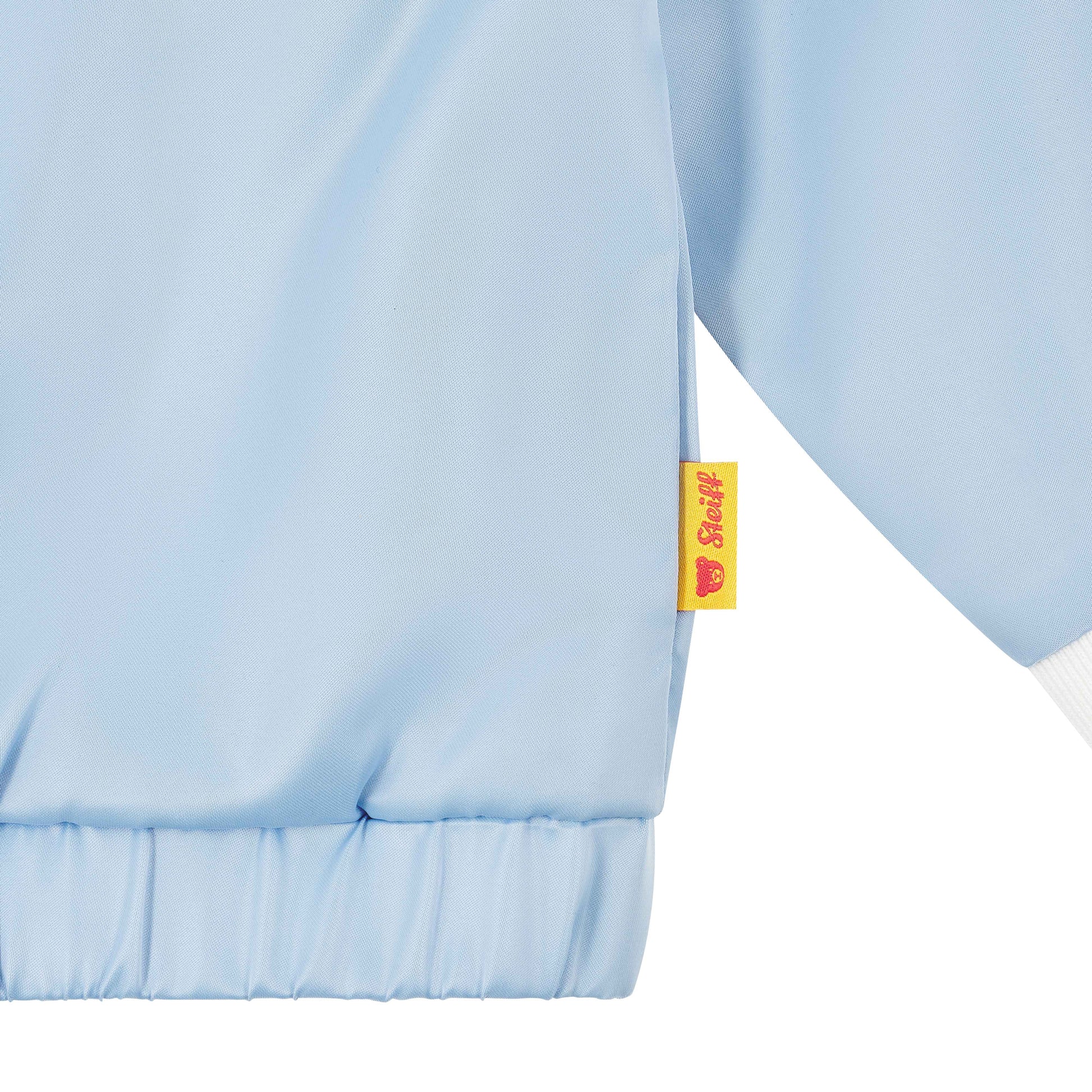 Diese leichte Bomberjacke in zartem Hellblau begleitet kleine Abenteurerinnen stilvoll durch den Tag. Der atmungsaktive Webstoff mit weichem Jerseymaterial innen sorgt für ein angenehmes Tragegefühl. Ein elastischer Bund garantiert perfekten Sitz, und der Front-Reißverschluss mit niedlichem Teddybär-Detail und Kinnschutz macht das Anziehen leicht und sicher. Der gerippte Kragen und die Ärmelbündchen mit Streifen verleihen der Jacke einen sportlichen Look, während zwei seitliche Taschen Platz für kleine Schätze bieten. Das charmante Steiff Teddybärmotiv macht die Jacke zum liebevollen Begleiter für fröhliche Ausflüge. Ein absolutes Lieblingsstück!