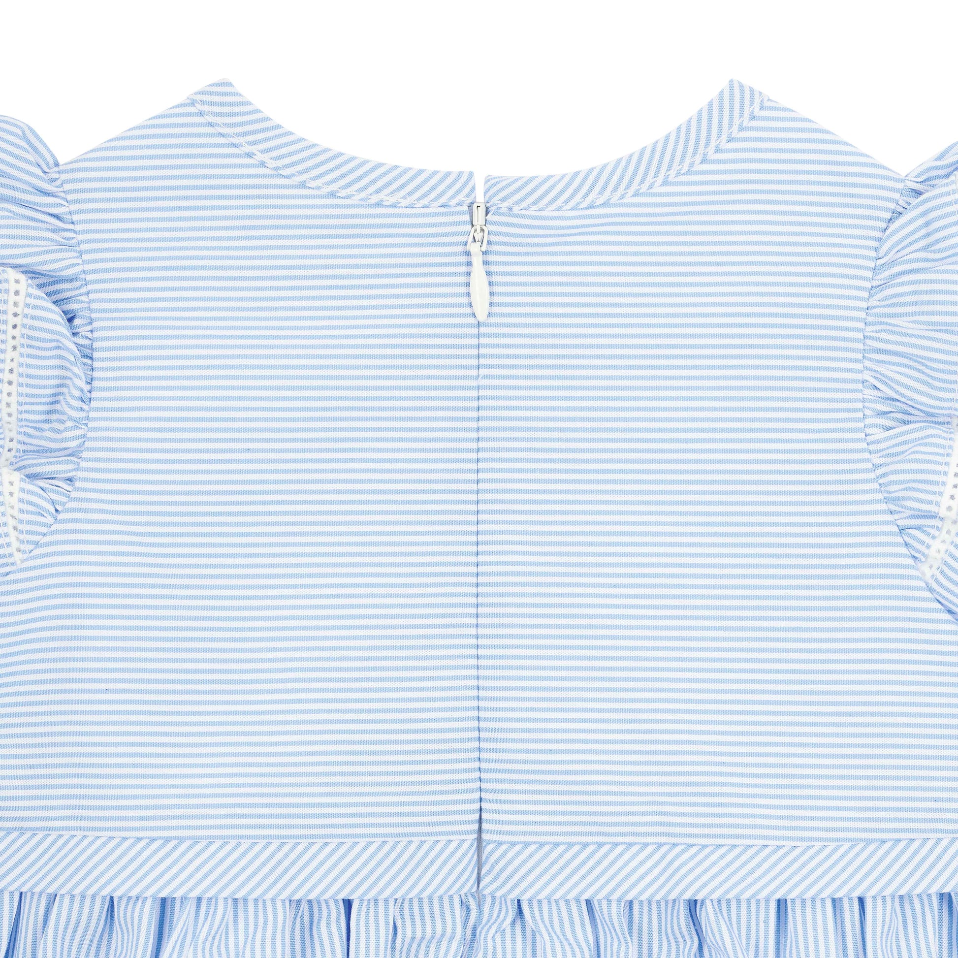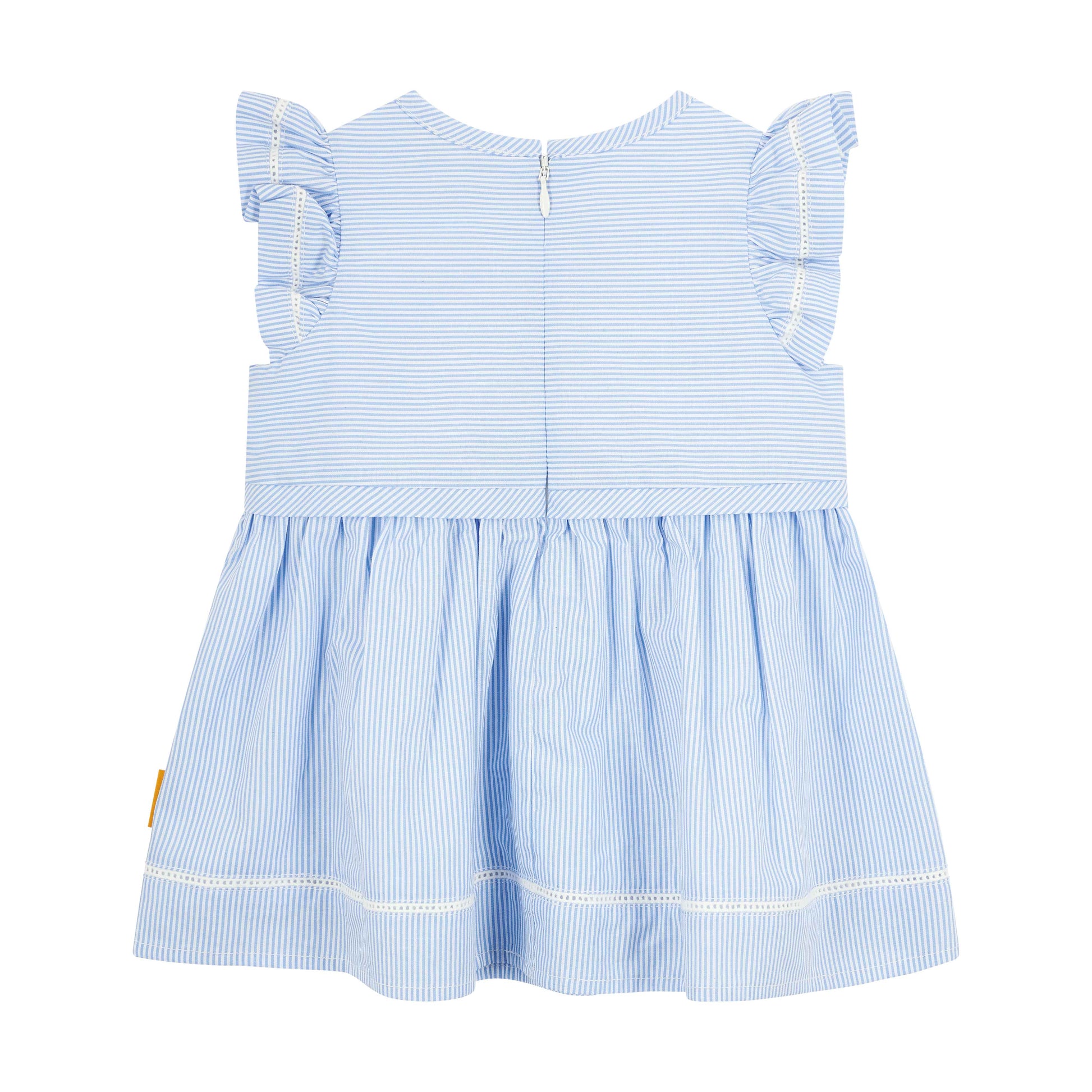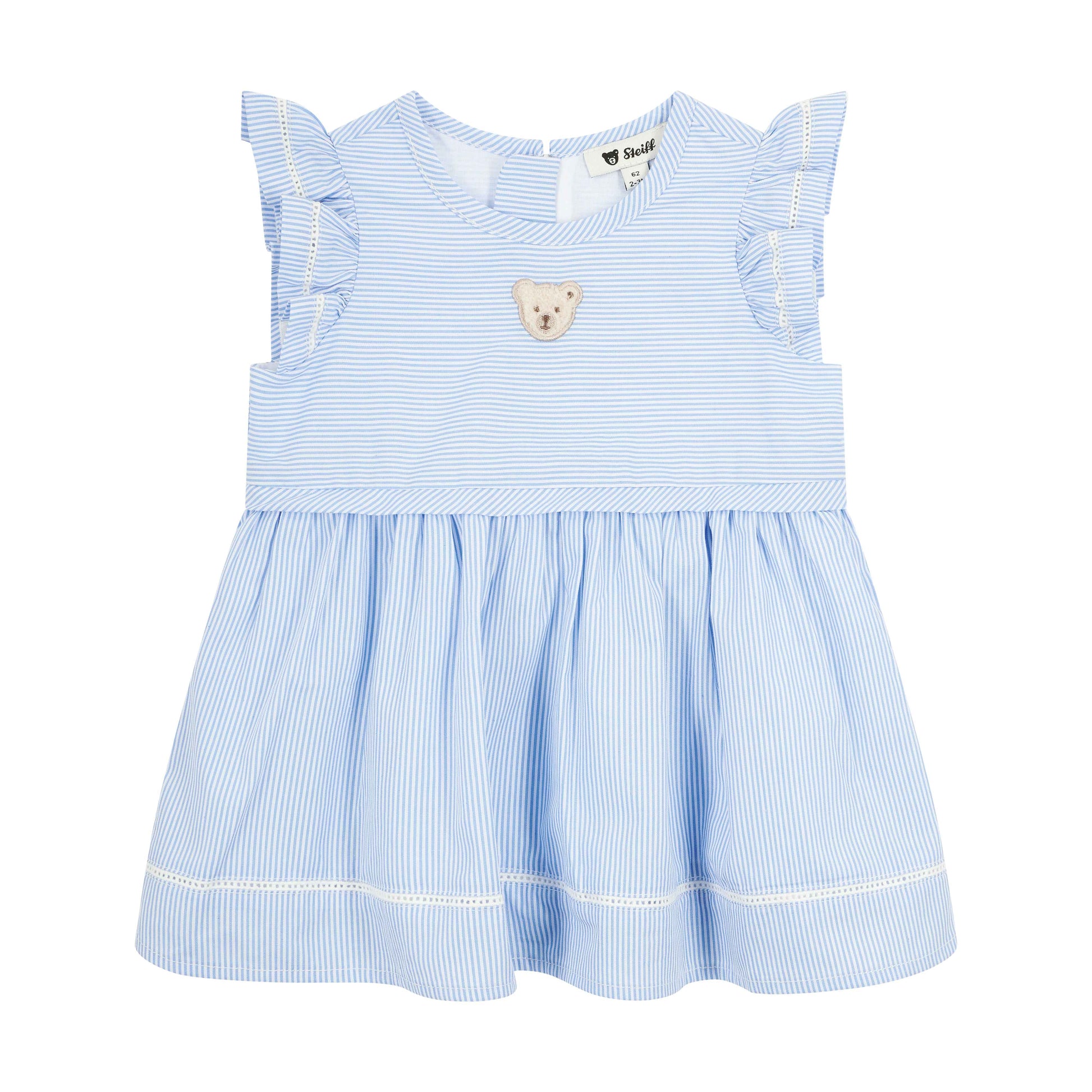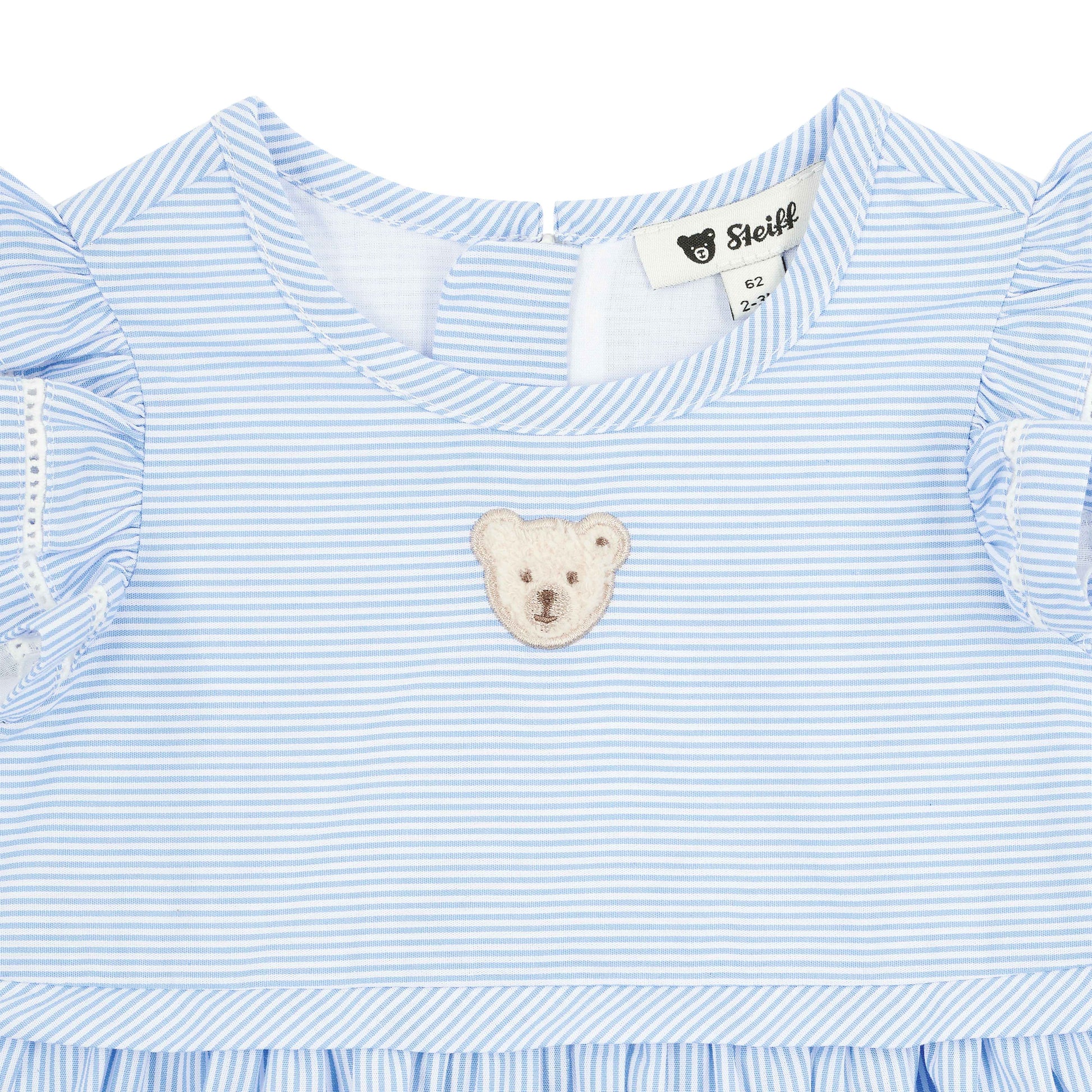 Dieses gestreifte Kleid mit niedlichen Rüschenärmeln ist ein zauberhaftes Must-have für kleine Prinzessinnen. Die feinen Spitzendetails am Saum und an den Ärmelabschlüssen verleihen eine romantische Note, während der weiche Stoff für angenehmen Tragekomfort sorgt. Ein verdeckter Reißverschluss am Rücken erleichtert das An- und Ausziehen. Das flauschige Steiff Teddybärmotiv rundet das Design charmant ab und macht dieses Kleid zu einem Lieblingsstück für besondere Anlässe und alltägliche Abenteuer.
