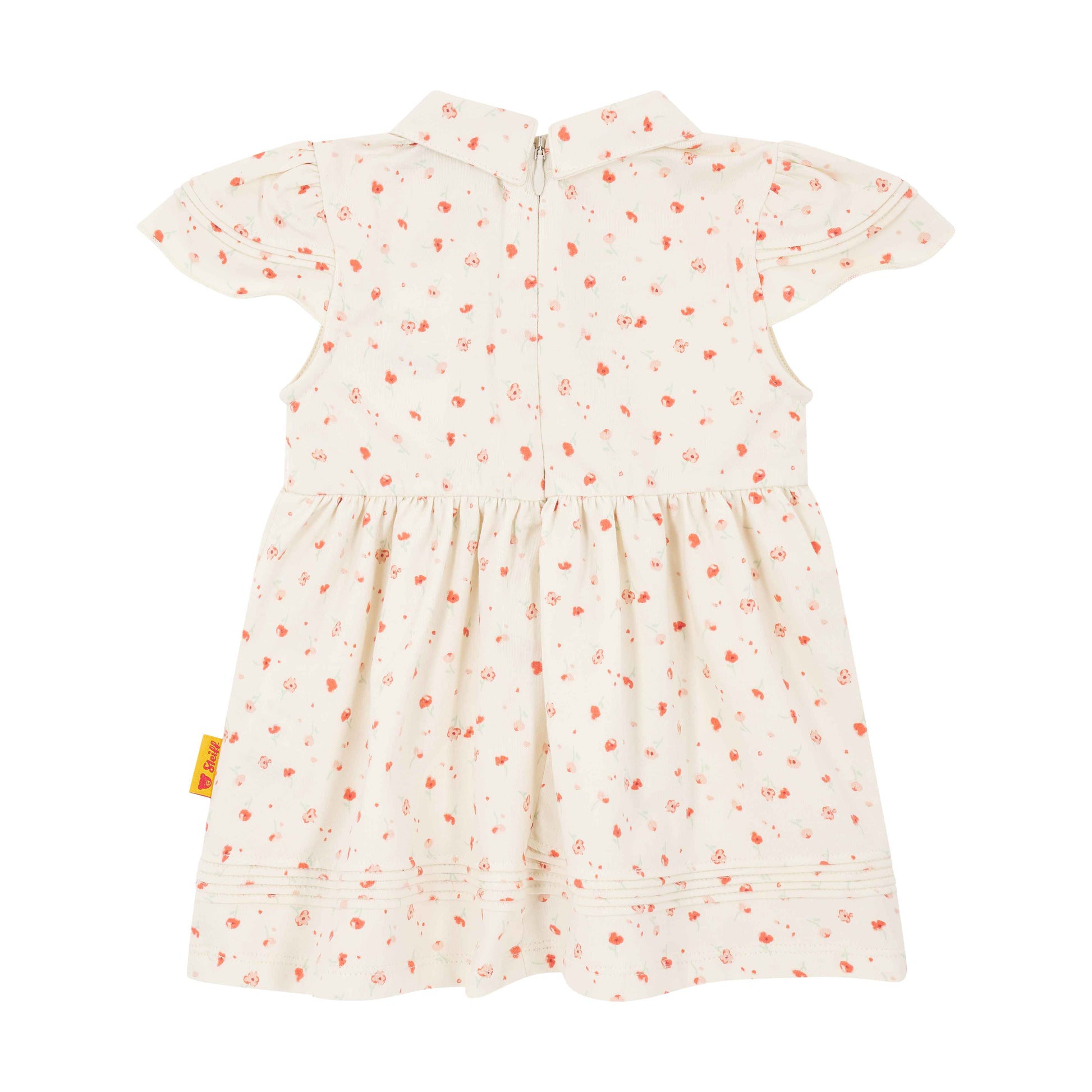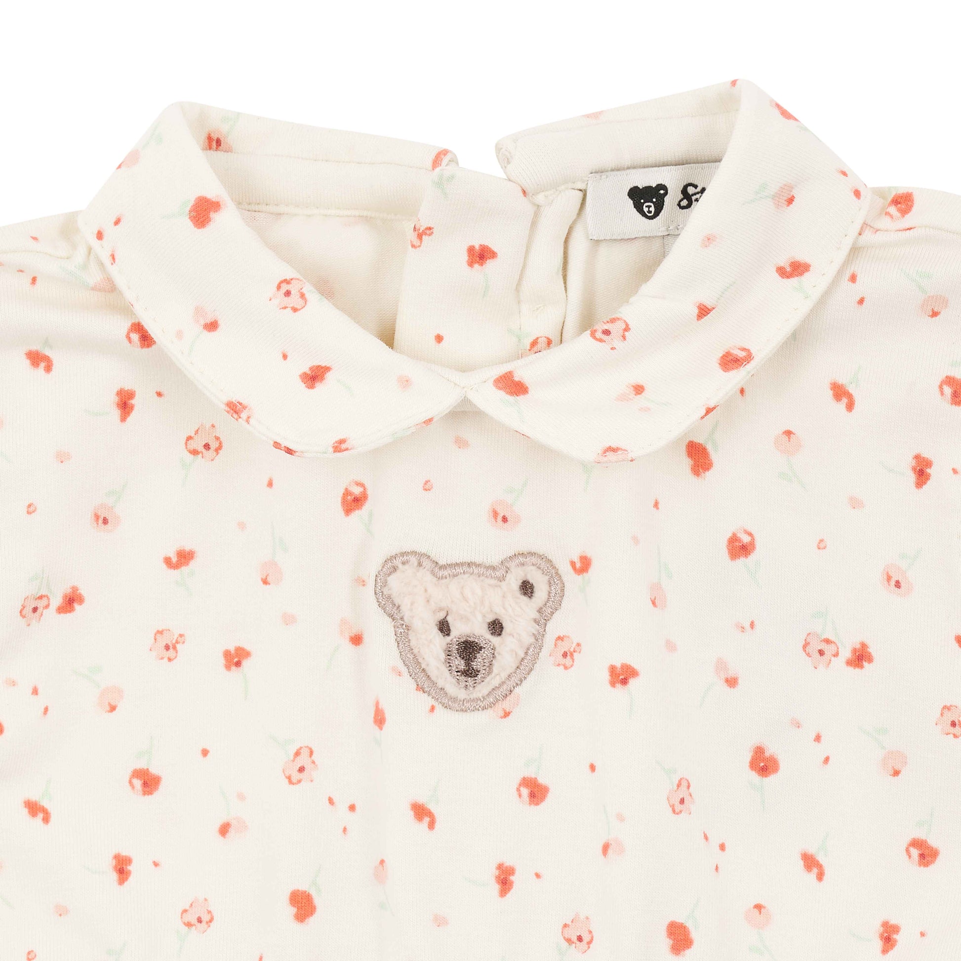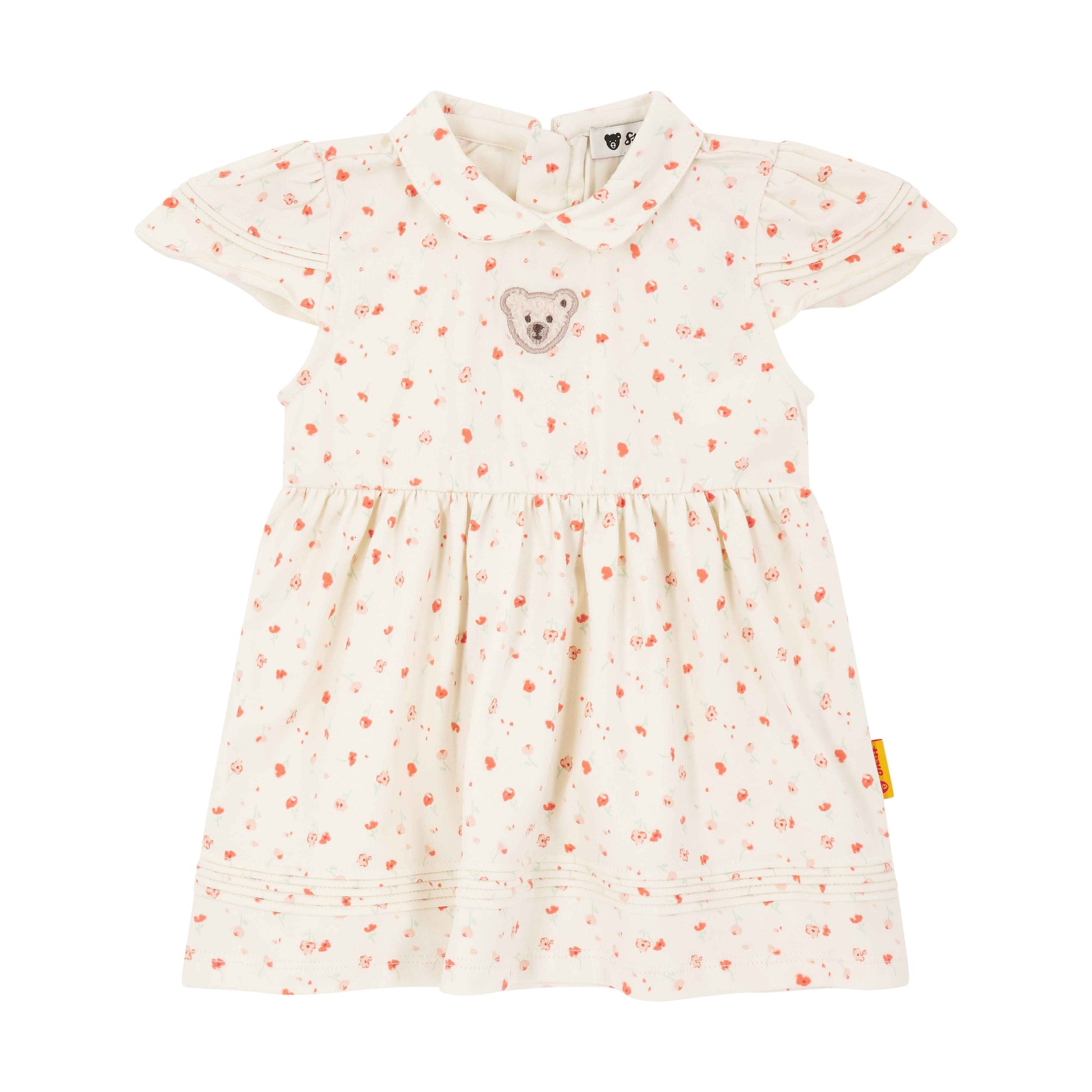 Dieses bezaubernde Kleid in zartem Beige mit floralem Druck ist ein wunderschönes Highlight für kleine Prinzessinnen. Der kuschelig-weiche Jerseystoff und die ausgestellten Flügelärmel bieten einen herrlich angenehmen Tragekomfort. Der niedliche Peter-Pan-Kragen und die feinen Fältchen an Ärmeln und Saum verleihen dem Kleid eine romantische Note. Ein verdeckter Reißverschluss am Rücken erleichtert das Anziehen, während das flauschige Steiff Teddybärmotiv auf der Brust für einen liebevollen Akzent sorgt. Ein traumhaftes Kleid für kleine Charmebolzen!