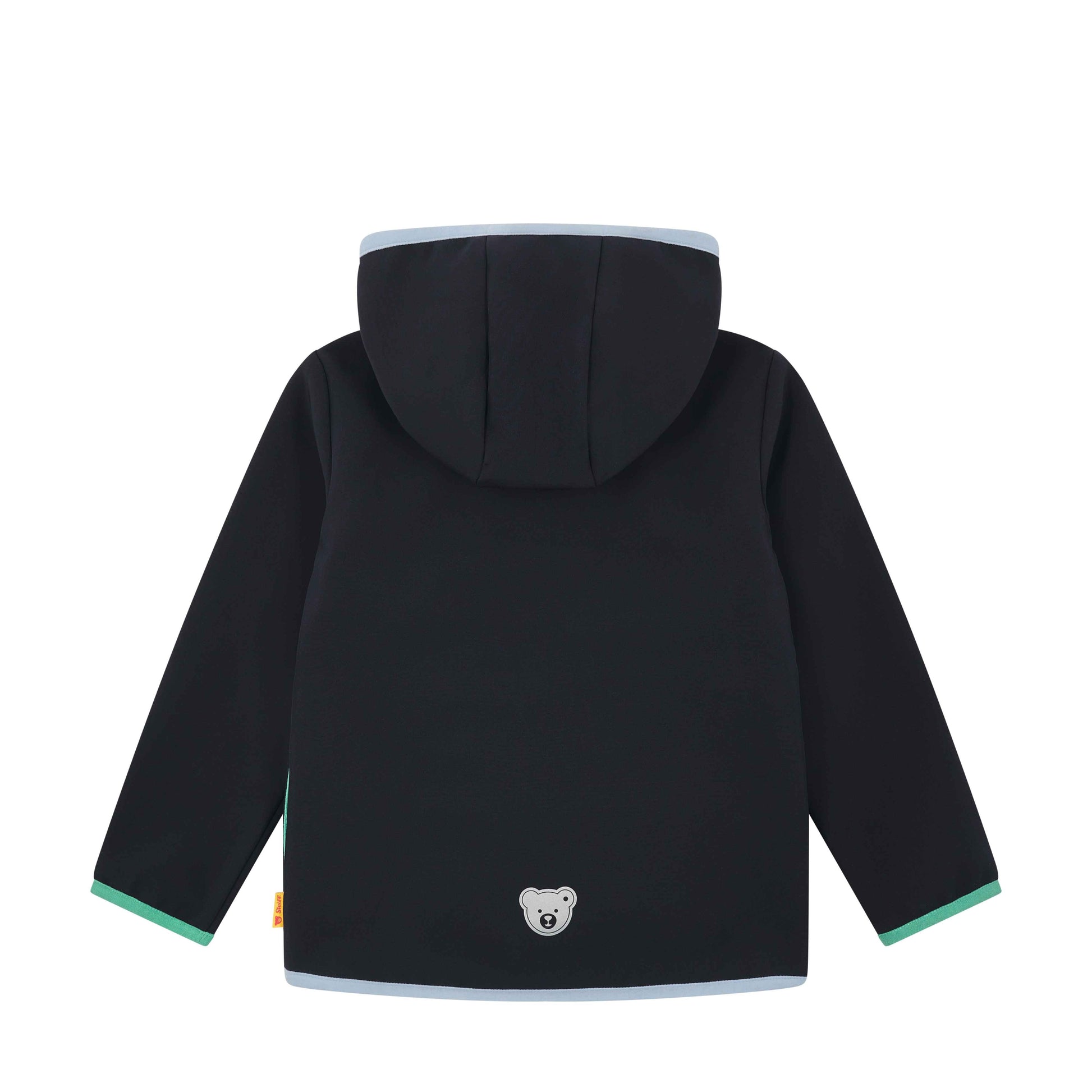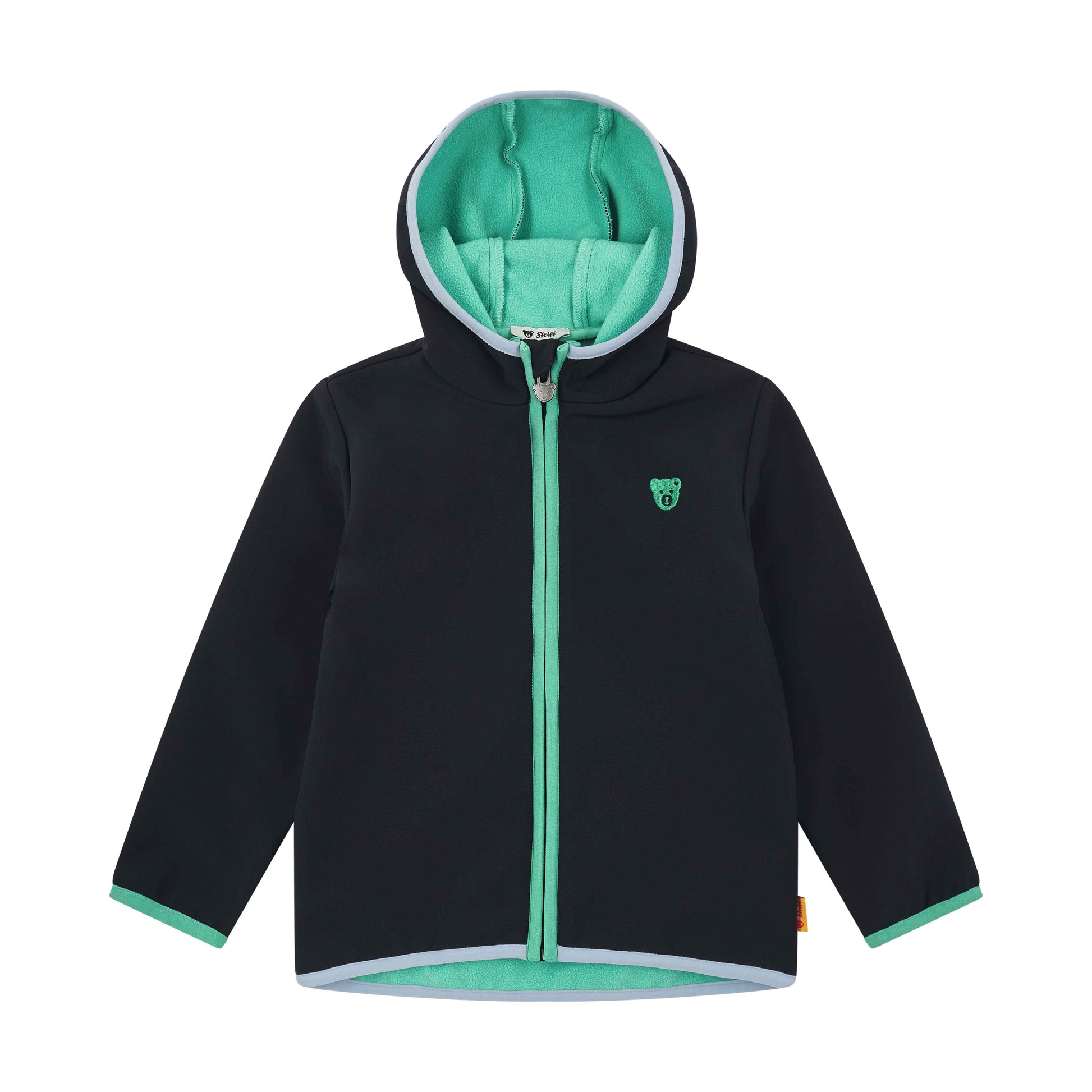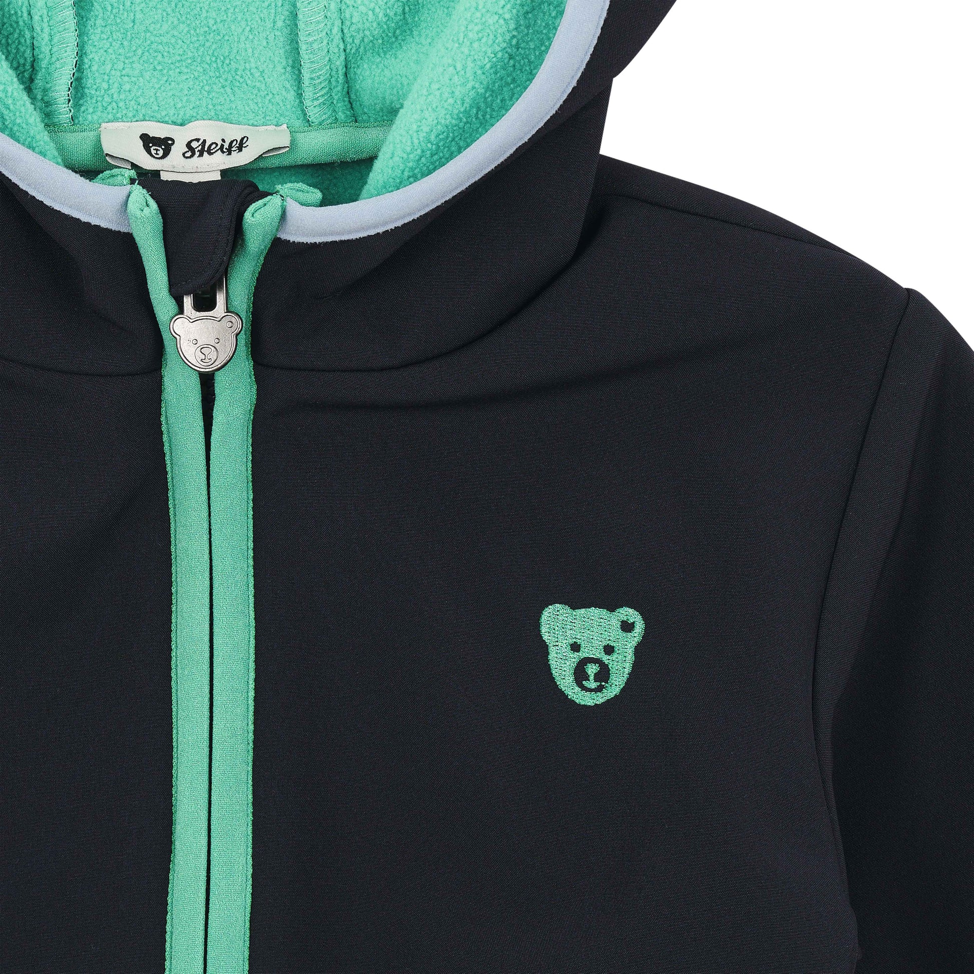 Die dunkelblaue Softshelljacke mit Kapuze ist perfekt für kleine Abenteurer und wetterfeste Ausflüge. Innen weich gefüttert mit flauschigem Fleece in frischem Kontrastgrün, hält sie kuschelig warm. Die atmungsaktive, wasserabweisende BIONIC-FINISH® ECO-Imprägnierung schützt zuverlässig vor Nässe. Der Reißverschluss ist mit einem Kinnschutz und einem praktischen Teddybär-Detail ausgestattet, was das Anziehen erleichtert und schützt. Liebevolle Details wie das gestickte Steiff Teddybärmotiv und ein reflektierender Teddy auf der Rückseite begleiten die Kleinen stilvoll und sicher auf jedem Abenteuer.