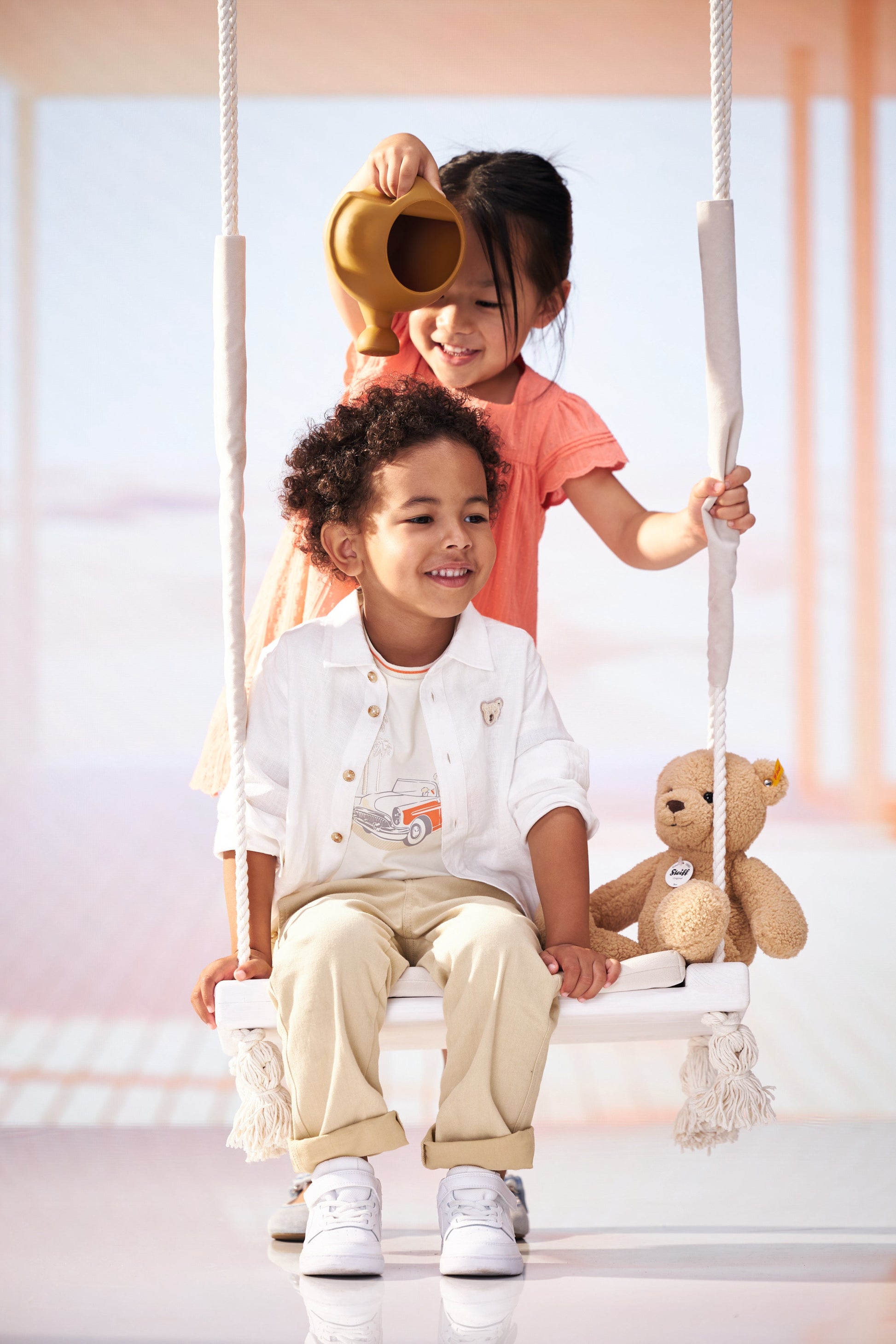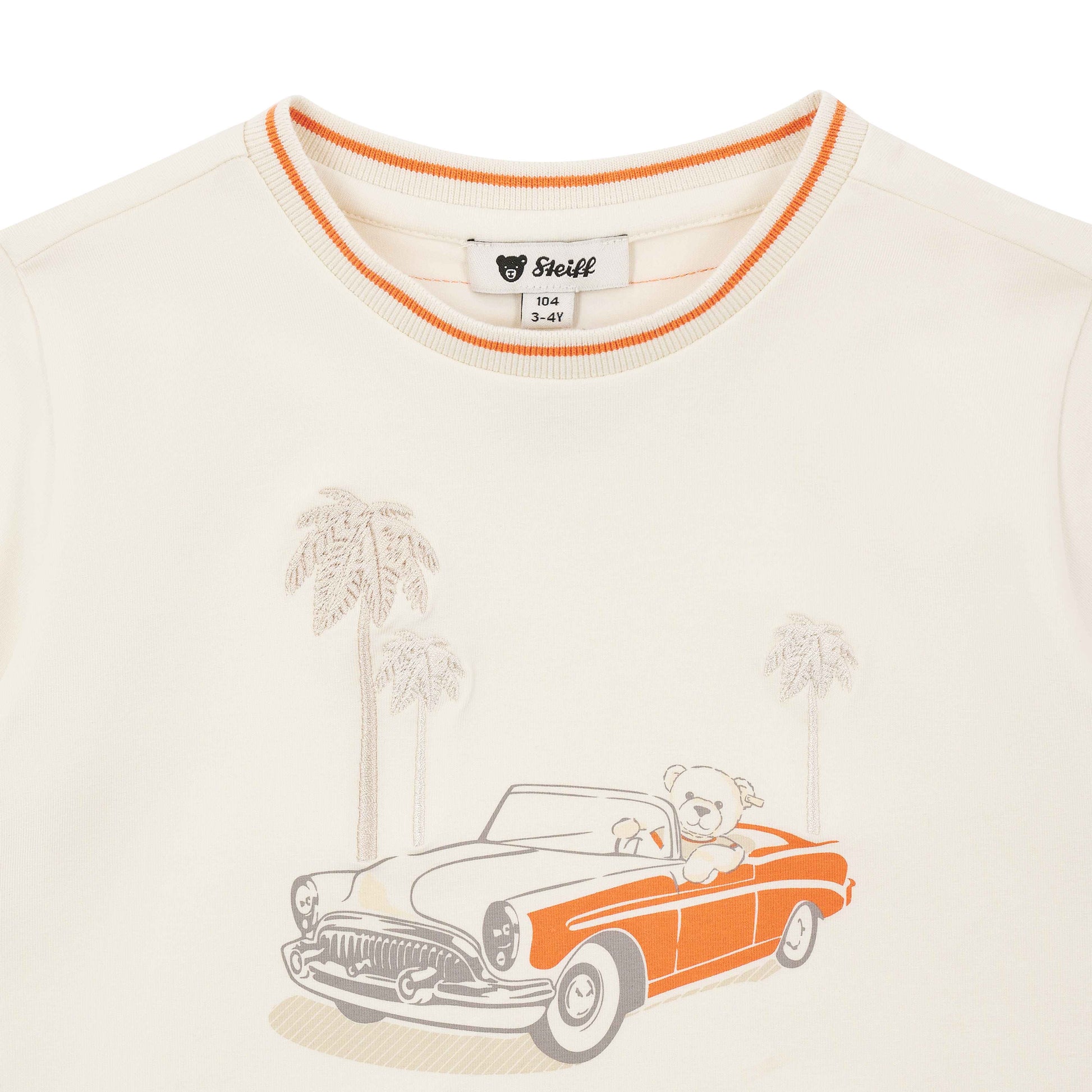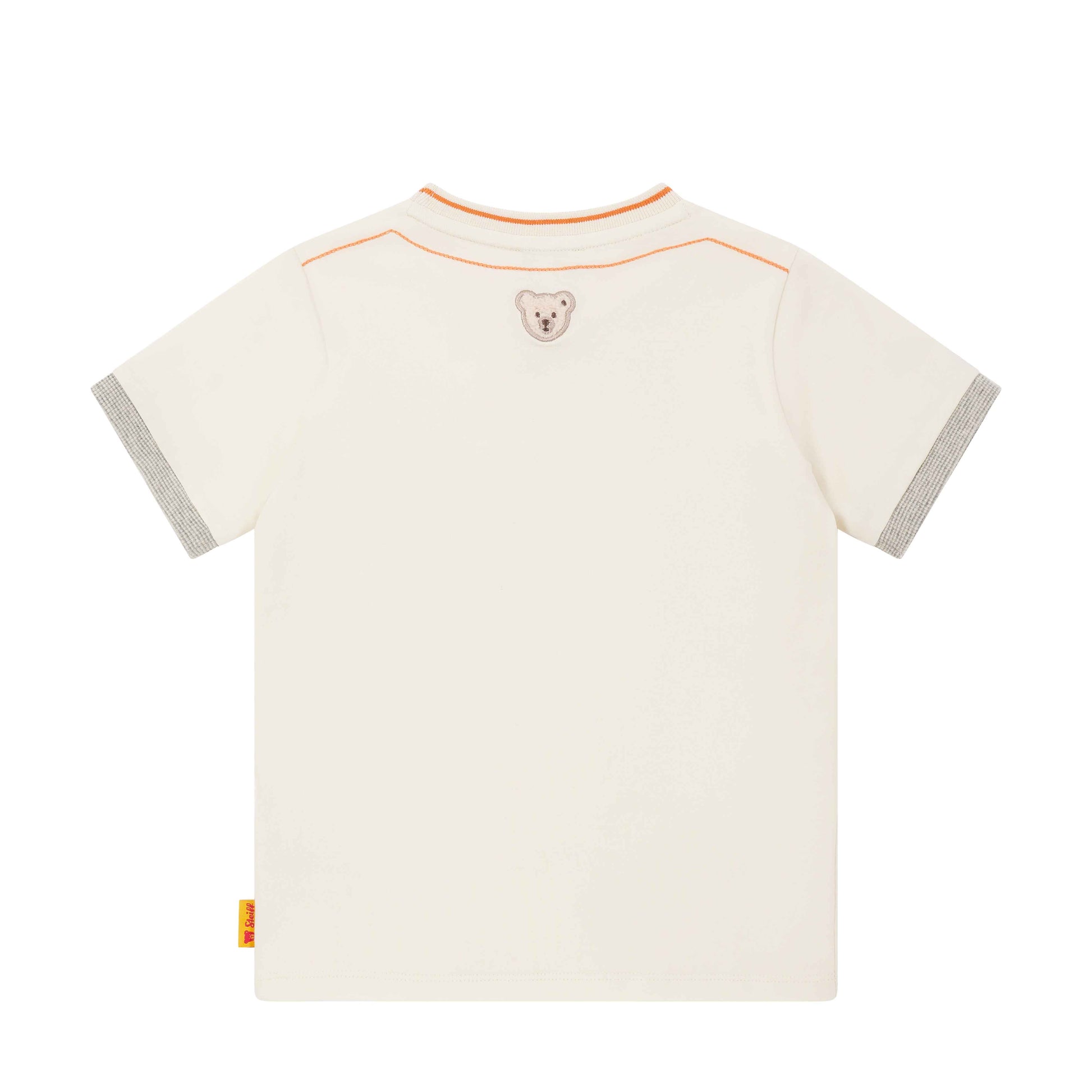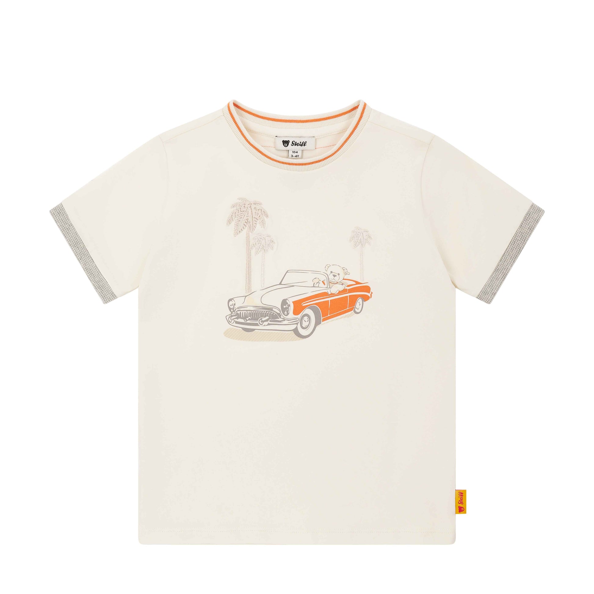 Dieses kurzärmelige T-Shirt in sanftem Beige ist ideal für kleine Entdecker. Der weiche Jersey-Stoff sorgt für höchsten Tragekomfort und lädt zum Wohlfühlen ein. Ein niedlicher Print mit Teddybär im Auto bringt Freude in den Alltag und lässt Kinderherzen höher schlagen. Der elastische, gerippte Halsausschnitt und die Ärmelbündchen mit Streifendetail bieten eine angenehme Passform und viel Bewegungsfreiheit. Das flauschige Steiff Teddybärmotiv am Rücken verleiht dem Look einen liebevollen Akzent – ein perfekter Begleiter für alle Abenteuer.