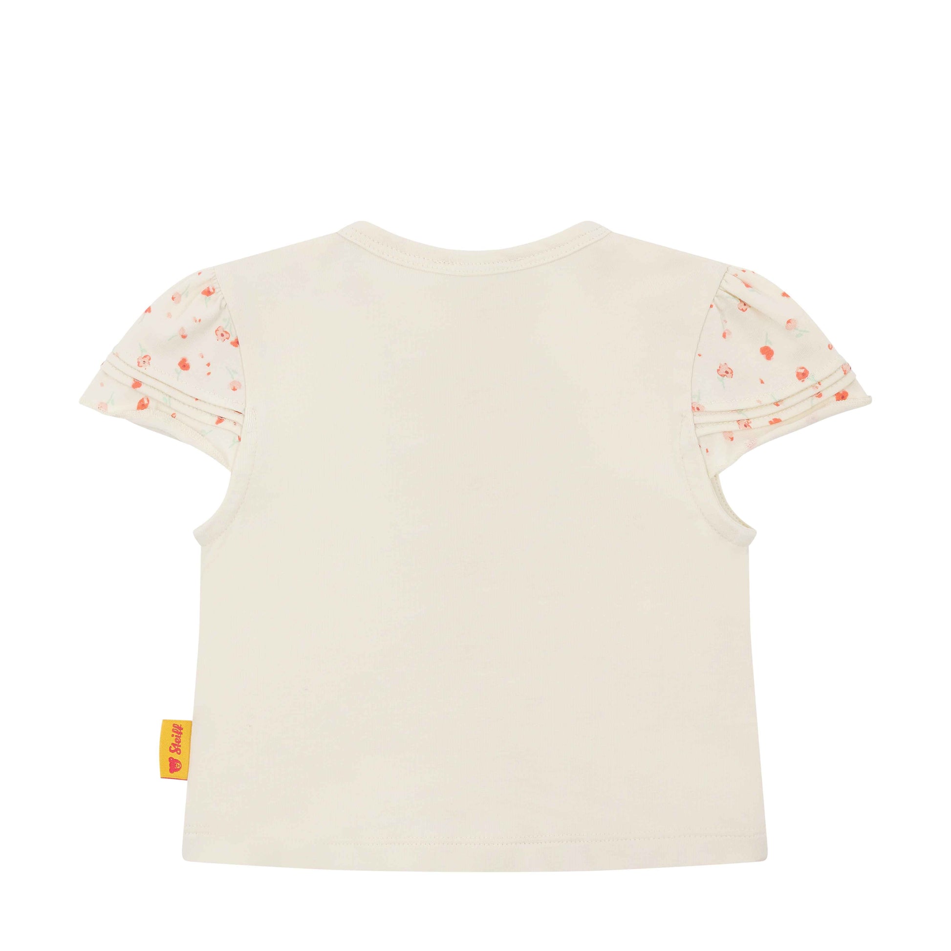 Dieses T-Shirt in warmem Beige begeistert kleine Romantikerinnen mit liebevollen Details. Der weiche Jersey-Stoff sorgt für ein kuscheliges Tragegefühl, während die ausgestellten Ärmel mit floralem Print und zarten Falten verspielte Akzente setzen. Der lockere Schnitt bietet viel Bewegungsfreiheit, und dank des praktischen Druckknopfverschlusses an der Schulter lässt sich das T-Shirt kinderleicht anziehen. Ein großes, flauschiges Steiff Teddybärmotiv mit Blumen schmückt die Vorderseite und bringt einen Hauch von Sommerzauber ins Outfit – perfekt für kleine Blumenkinder.