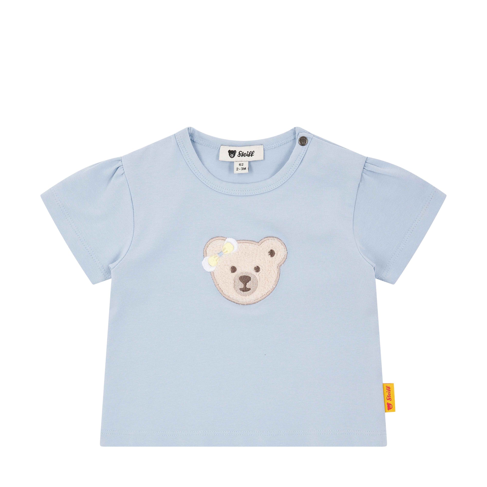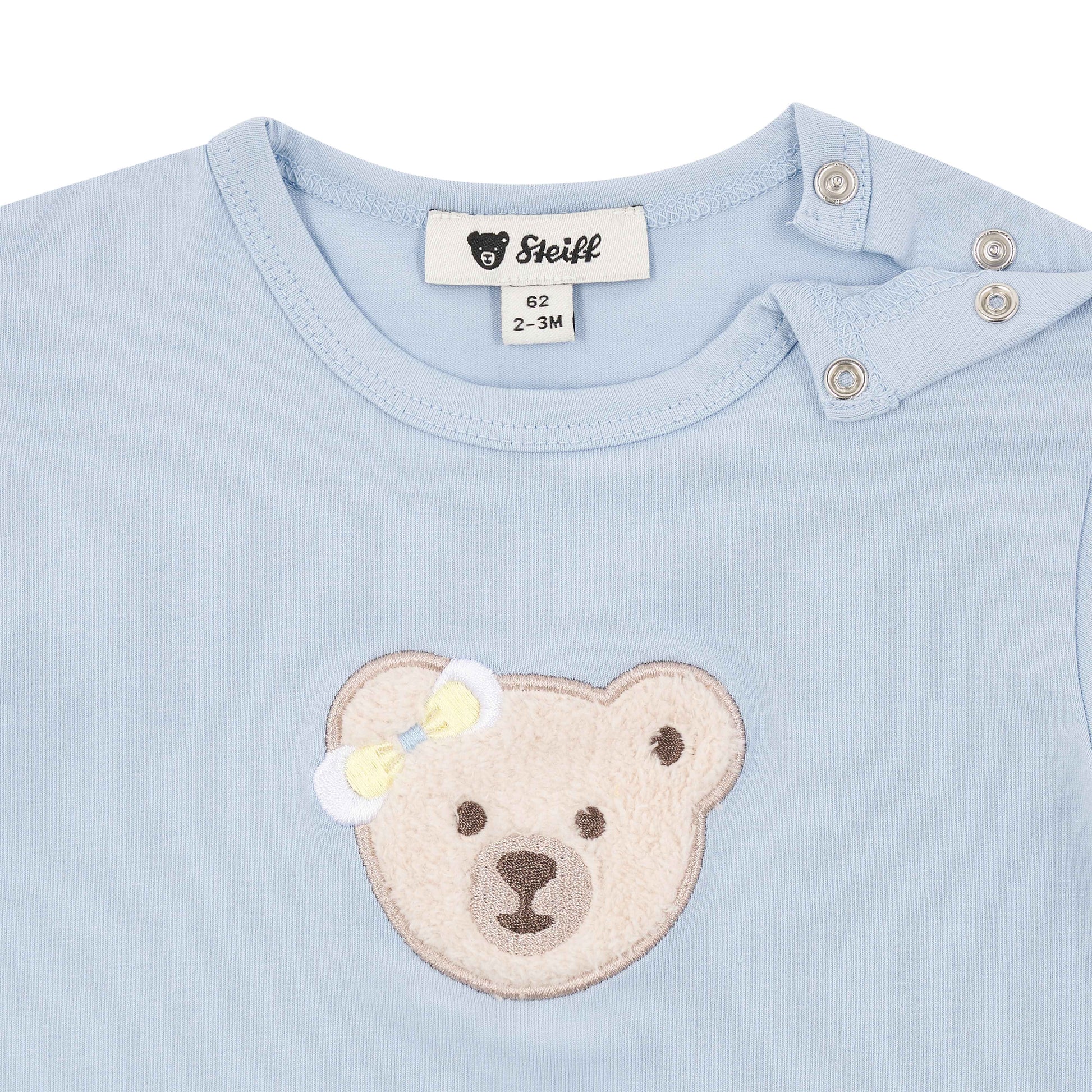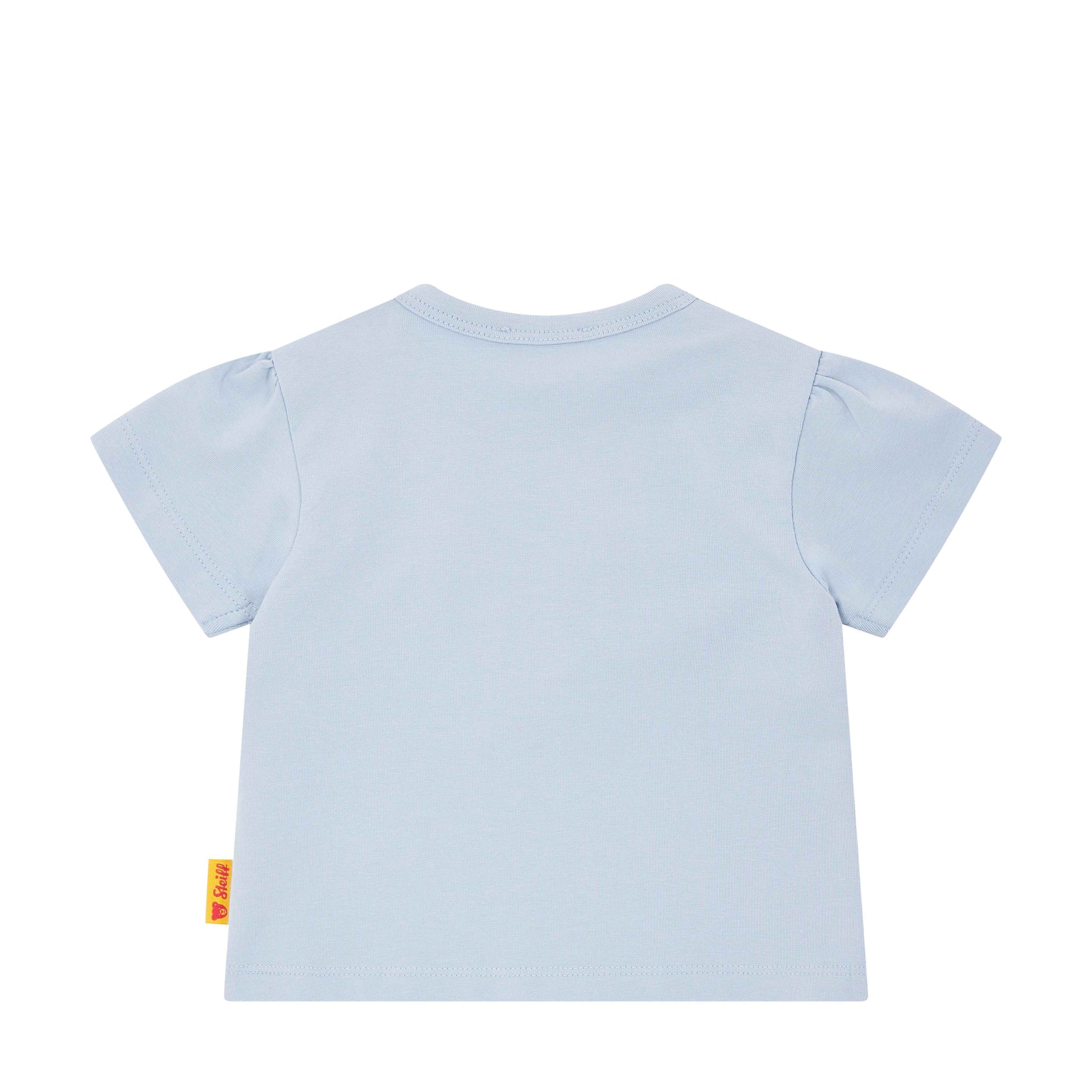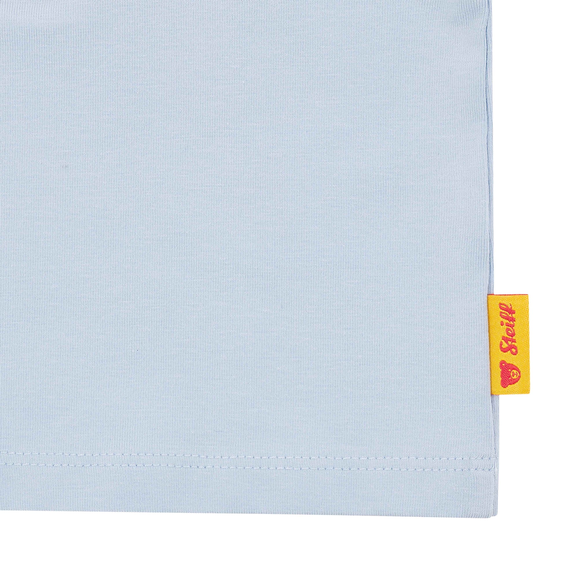 Dieses kurzärmelige T-Shirt in zartem Hellblau ist ein wunderschönes Kleidungsstück für kleine Prinzessinnen. Aus kuschelig weichem Jersey gefertigt, bietet es dank des lockeren Schnitts viel Bewegungsfreiheit zum Spielen und Entdecken. Die praktischen Druckknöpfe an der Schulter ermöglichen ein unkompliziertes An- und Ausziehen. Ein großes, flauschiges Steiff Teddybärmotiv mit einer süßen Schleife auf der Vorderseite macht das Shirt zu einem echten Hingucker und sorgt für besonders viel Charme im Alltag.