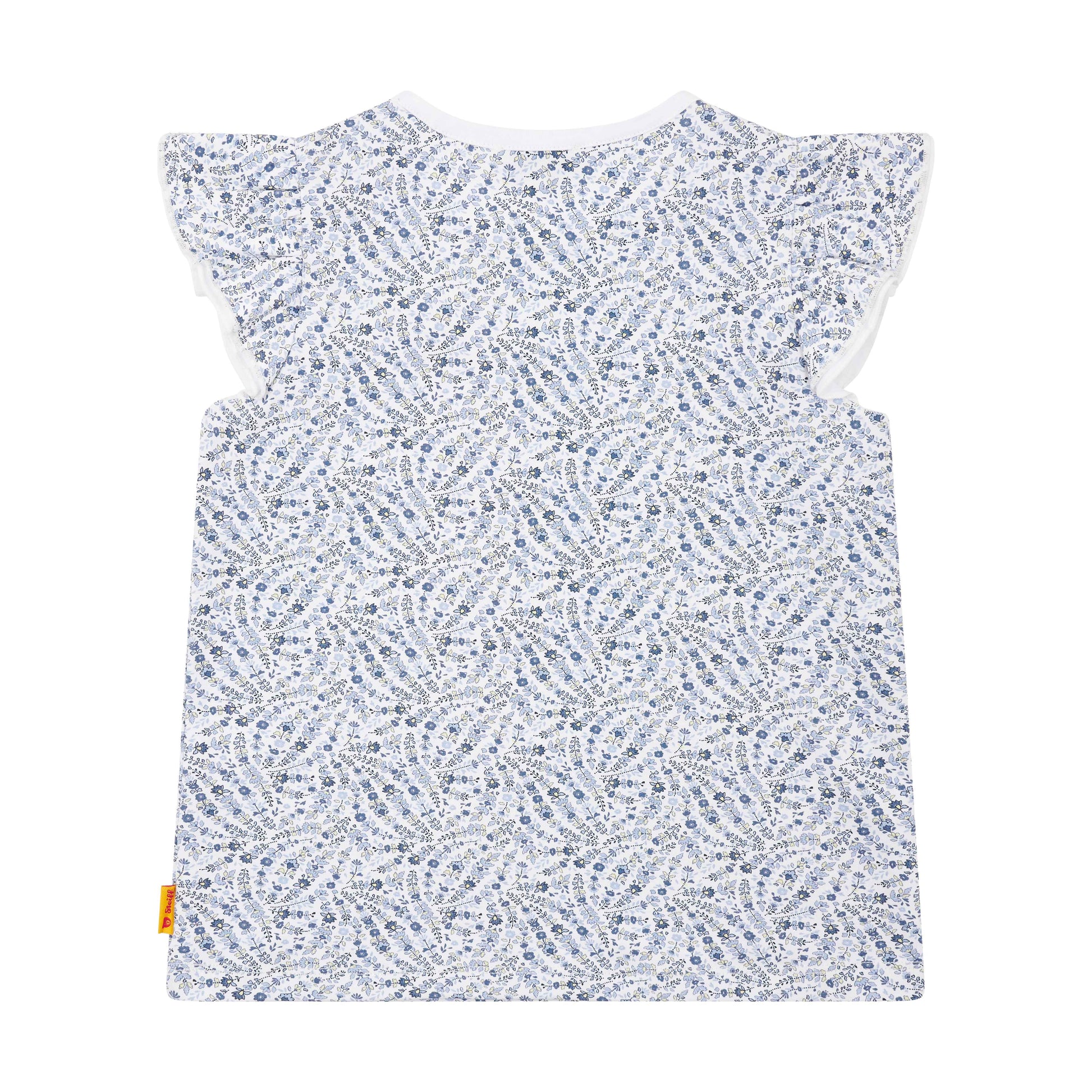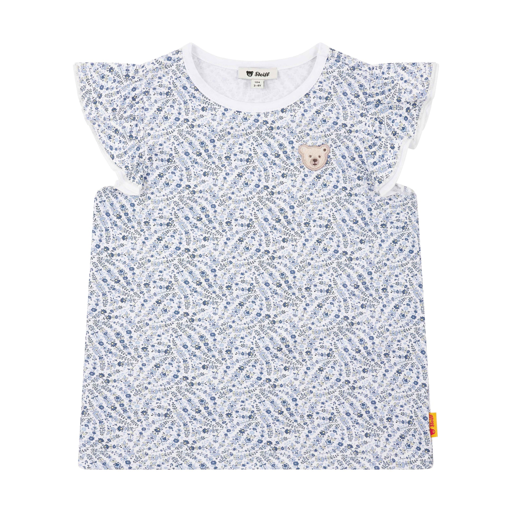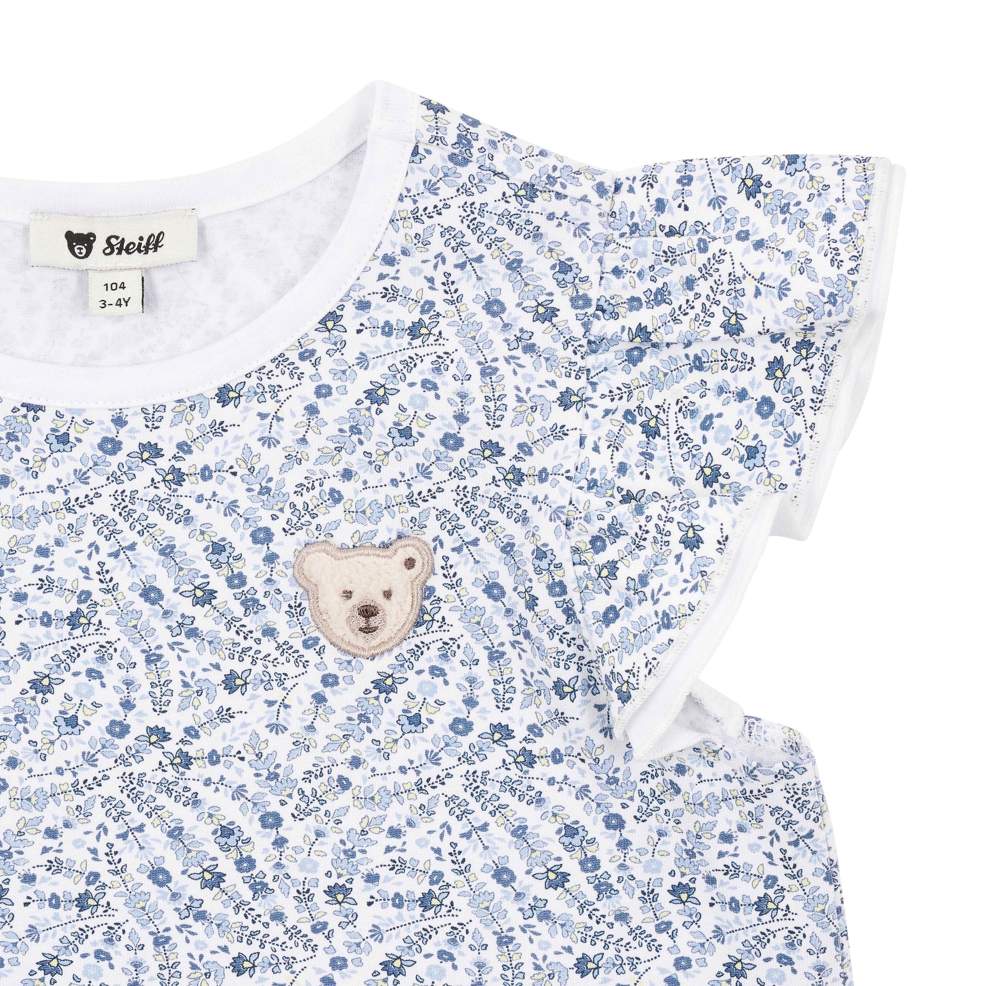 Dieses zauberhafte Kurzarmshirt aus weichem Jersey mit charmantem blauen Blumenmuster lässt kleine Mädchen strahlen. Die doppellagigen, leicht gerafften Flatterärmel verleihen dem Oberteil einen besonders verspielten Look, während die zarte Einfassung in Weiß am Halsausschnitt stilvolle Akzente setzt. Ein liebevoll gesticktes Steiff Teddybärmotiv rundet das Design ab und begleitet die Kleinen bei all ihren Entdeckungen. Ein wunderschönes Lieblingsstück für sonnige Tage und fröhliche Ausflüge!
